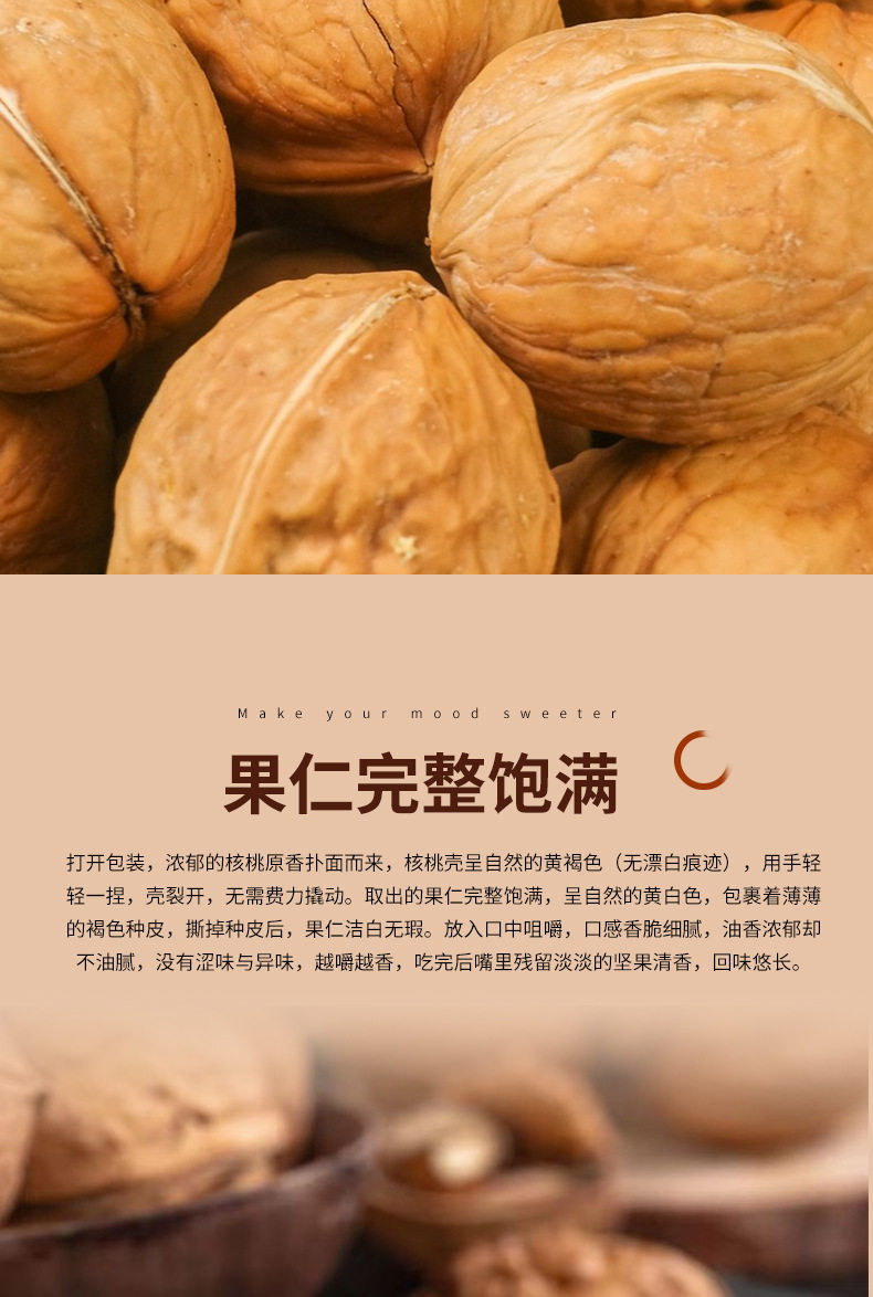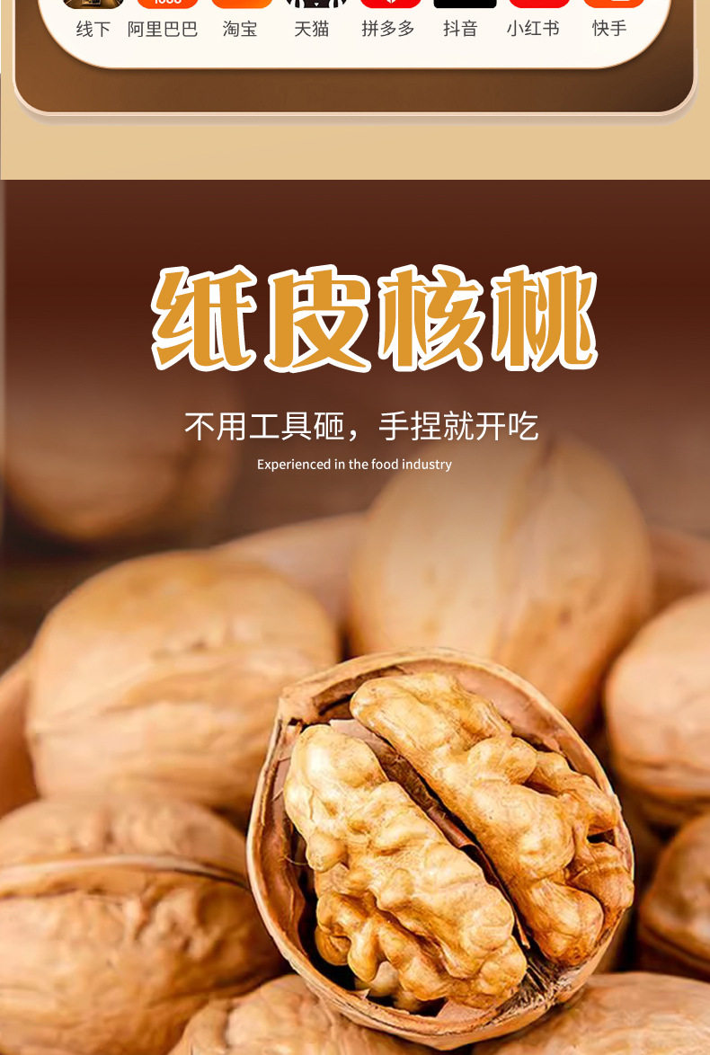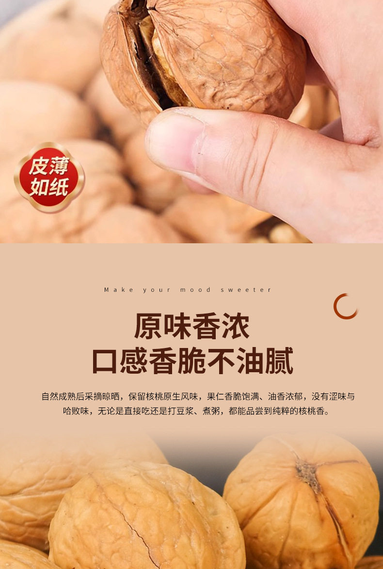 | Taste | [family affordable pack] original paper walnut 500g*2 bags,[net weight 0.5kg packs] original paper-skinned walnuts 500g*1 bag,[half a pound sharing pack] original paper-skinned walnuts 250g*1 bag,[tasting in small packages] original paper-skinned walnuts 100g*1 bag |