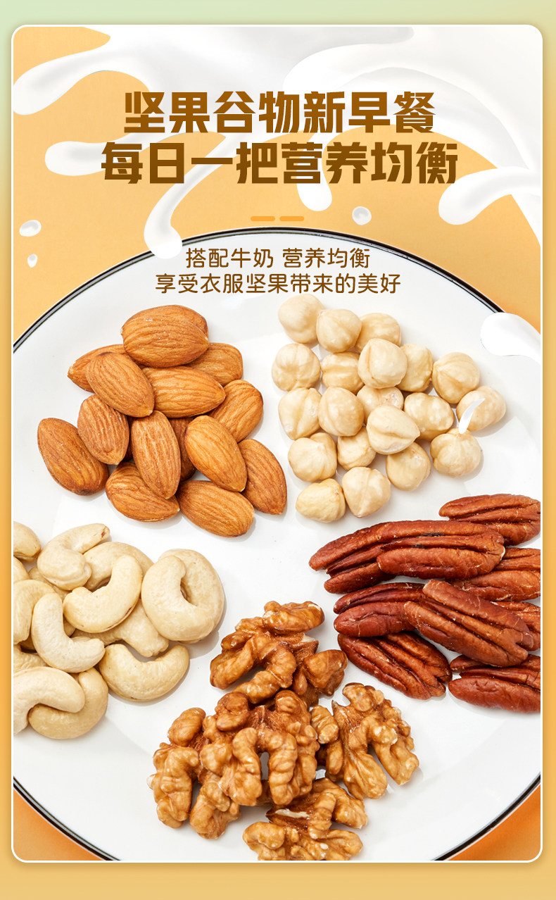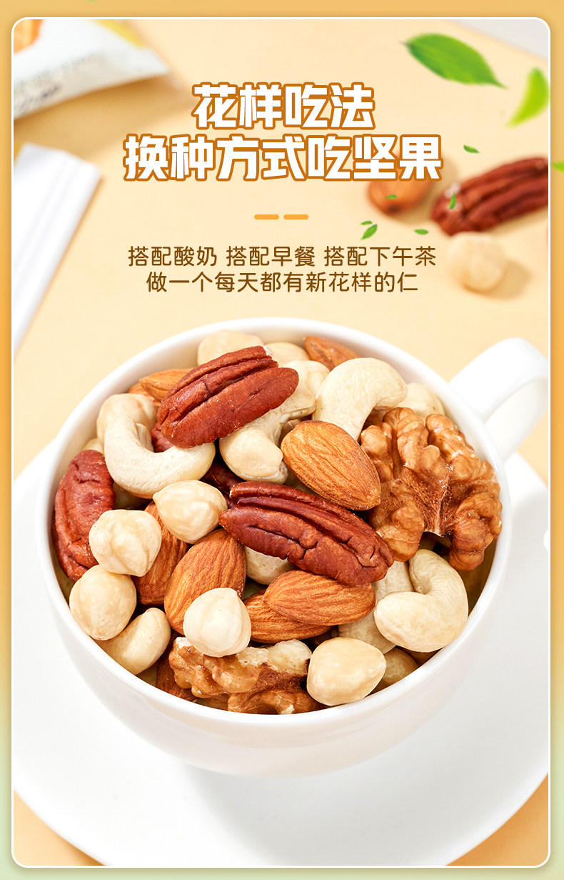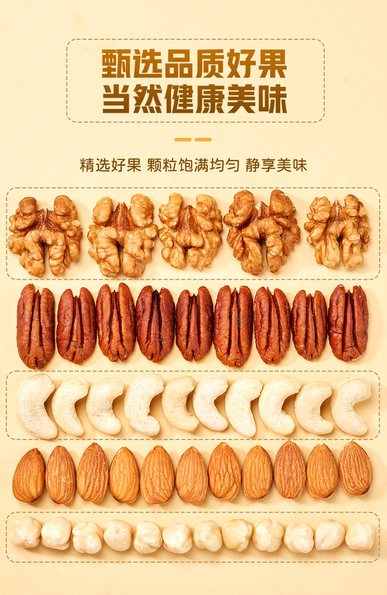 Packaging specifications Type d 500g*1 can: [walnut kernels + almond kernels + white cashew kernels + hazelnut kernels + pecan kernels],Type c 500g*1 can: [walnut kernels + almond kernels + white cashew kernels + hazelnut kernels + pistachio kernels],Type e 500g*1 can: [almond kernels + white cashew kernels + hazelnut kernels + pecan kernels],Pure nut kernel combination package: [raw white cashew kernels + original almond kernels] 250g each (total 0.5kg pieces)