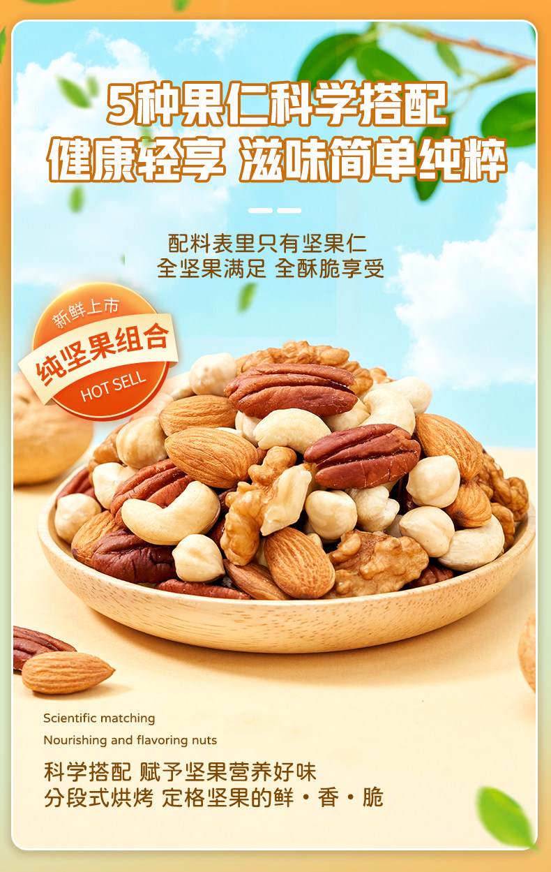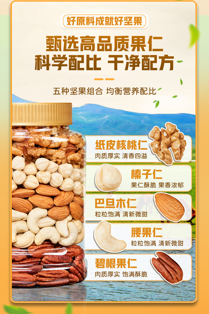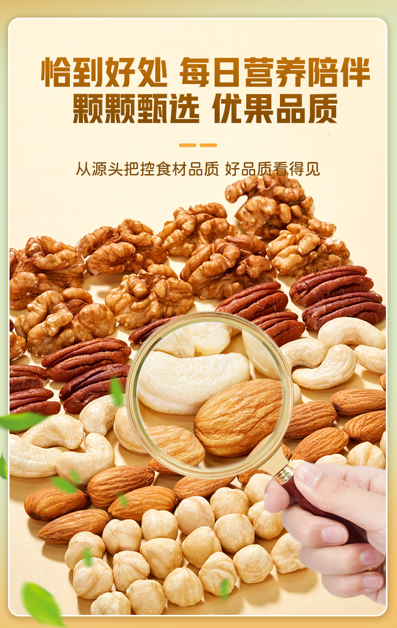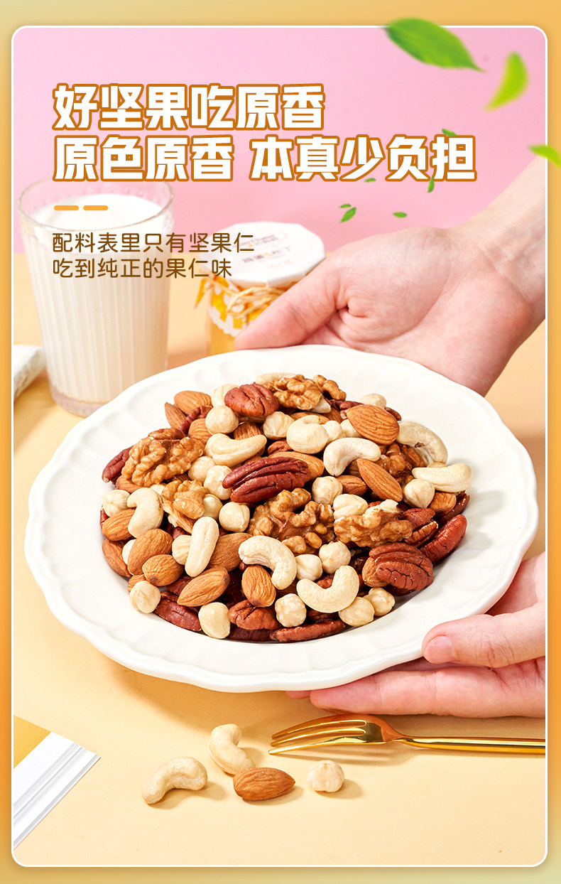 Packaging specifications Type d 500g*1 can: [walnut kernels + almond kernels + white cashew kernels + hazelnut kernels + pecan kernels],Type c 500g*1 can: [walnut kernels + almond kernels + white cashew kernels + hazelnut kernels + pistachio kernels],Type e 500g*1 can: [almond kernels + white cashew kernels + hazelnut kernels + pecan kernels],Pure nut kernel combination package: [raw white cashew kernels + original almond kernels] 250g each (total 0.5kg pieces)
