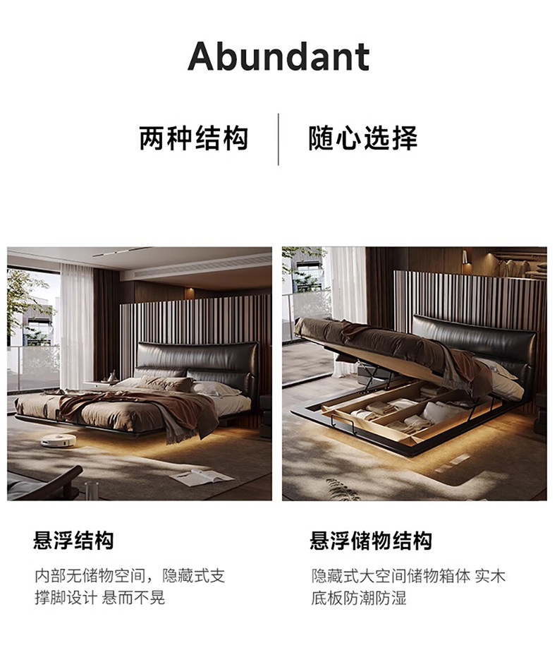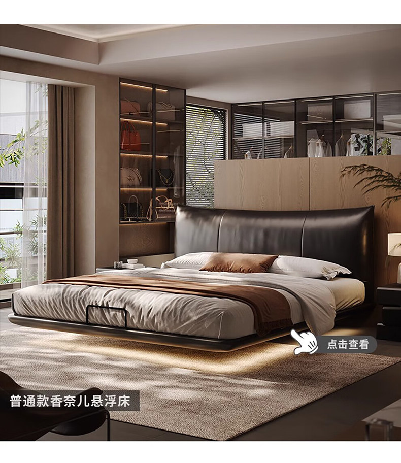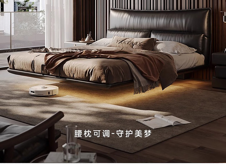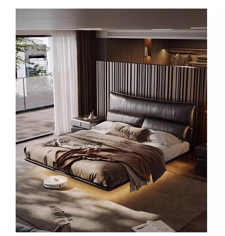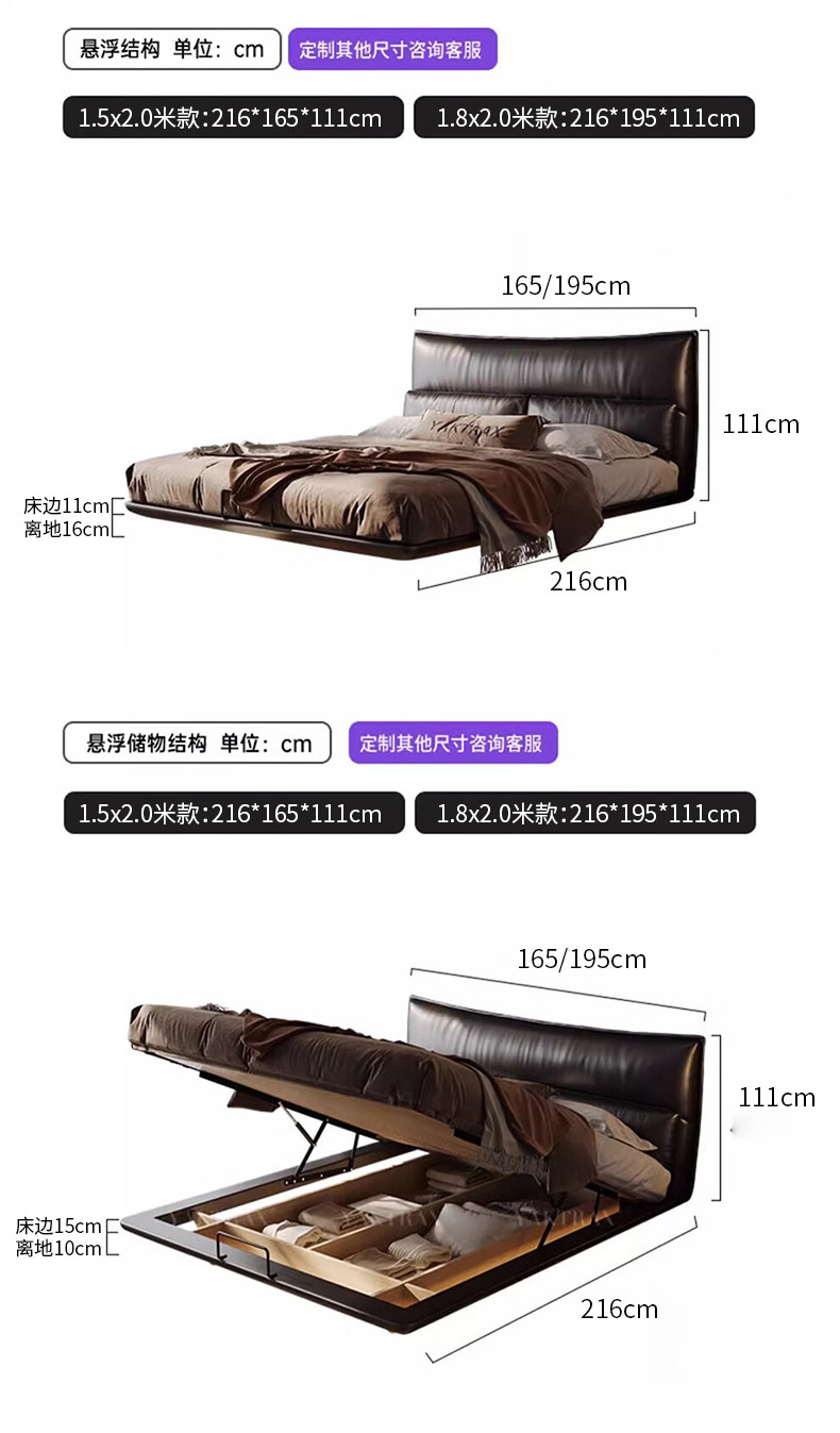 Suspended Bed Black Leather Multifunctional Storage Bed Accessible Luxury Italian Normcore Luxury Classy Large Bed 2m with Sensor Light