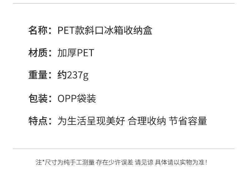 | Specifications | Pet style inclined mouth refrigerator storage box |