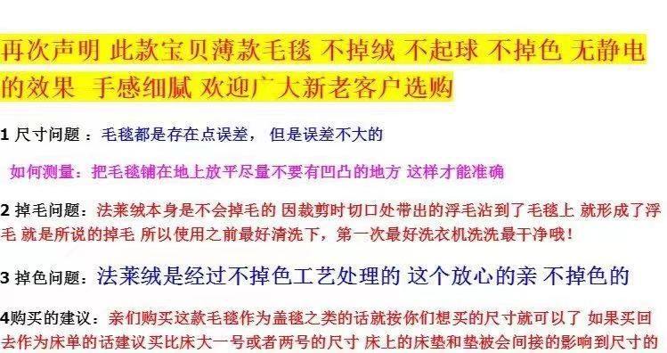 | Size specifications | Gray color - 0.7m * 1m [pet blanket],Gray color - 1m * 1.5m [shawl blanket],Gray color - 1.2m * 1.8m [dormitory blanket],Gray color - 1.5m * 2m [small bed blanket],Gray color - 1.8m * 2m [double bed blanket],Gray color - 2m * 2.3m [large bed blanket],White series- 0.7m * 1m [pet blanket],White series- 1m * 1.5m [shawl blanket],White series- 1.2m * 1.8m [dormitory blanket],White series- 1.5m * 2m [small bed blanket],White series- 1.8m * 2m [double bed blanket],White series- 2m * 2.3m [large bed blanket],Black - 0.7m * 1m [pet blanket],Black - 1m * 1.5m [shawl blanket],Black - 1.2m * 1.8m [dormitory blanket],Black - 1.5m * 2m [small bed blanket],Black - 1.8m * 2m [double bed blanket],Black - 2m * 2.3m [large bed blanket],Pink color - 0.7m * 1m [pet blanket],Pink color - 1m * 1.5m [shawl blanket],Pink color- 1.2m * 1.8m [dormitory blanket],Pink color - 1.5m * 2m [small bed blanket],Pink color- 1.8m * 2m [double bed blanket],Pink color- 2m * 2.3m [large bed blanket],Navy blue- 0.7m * 1m [pet blanket],Navy blue- 1m * 1.5m [shawl blanket],Navy blue- 1.2m * 1.8m [dormitory blanket],Navy blue- 1.5m * 2m [small bed blanket],Navy blue- 1.8m * 2m [double bed blanket],Navy blue- 2m * 2.3m [large bed blanket],Female light color random - 0.7m * 1m [pet blanket],Female light color random - 1m * 1.5m [shawl blanket],Female light color random - 1.2m * 1.8m [dormitory blanket],Female light color random - 1.5m * 2m [small bed blanket],Female light color random - 1.8m * 2m [double bed blanket],Female light color random - 2m * 2.3m [large bed blanket],Male dark random - 0.7m * 1m [pet blanket],Men's dark random - 1m * 1.5m [shawl blanket],Men's dark random - 1.2m * 1.8m [dormitory blanket],Men's dark random - 1.5m * 2m [small bed blanket],Men's dark random - 1.8m * 2m [double bed blanket],Men's dark random - 2m * 2.3m [large bed blanket] |