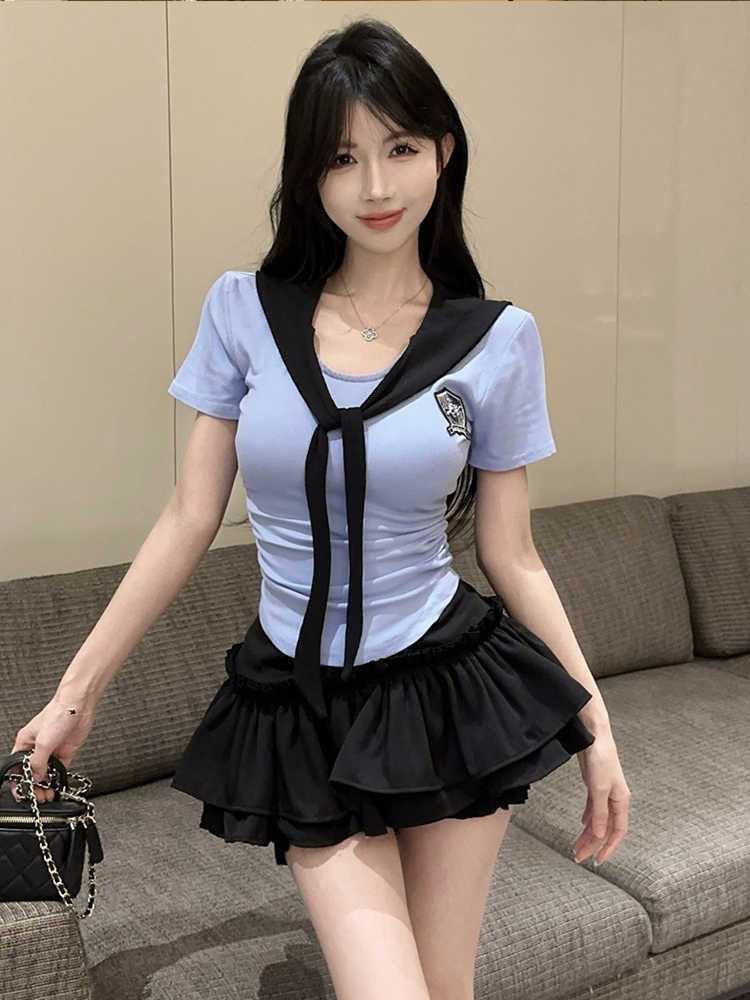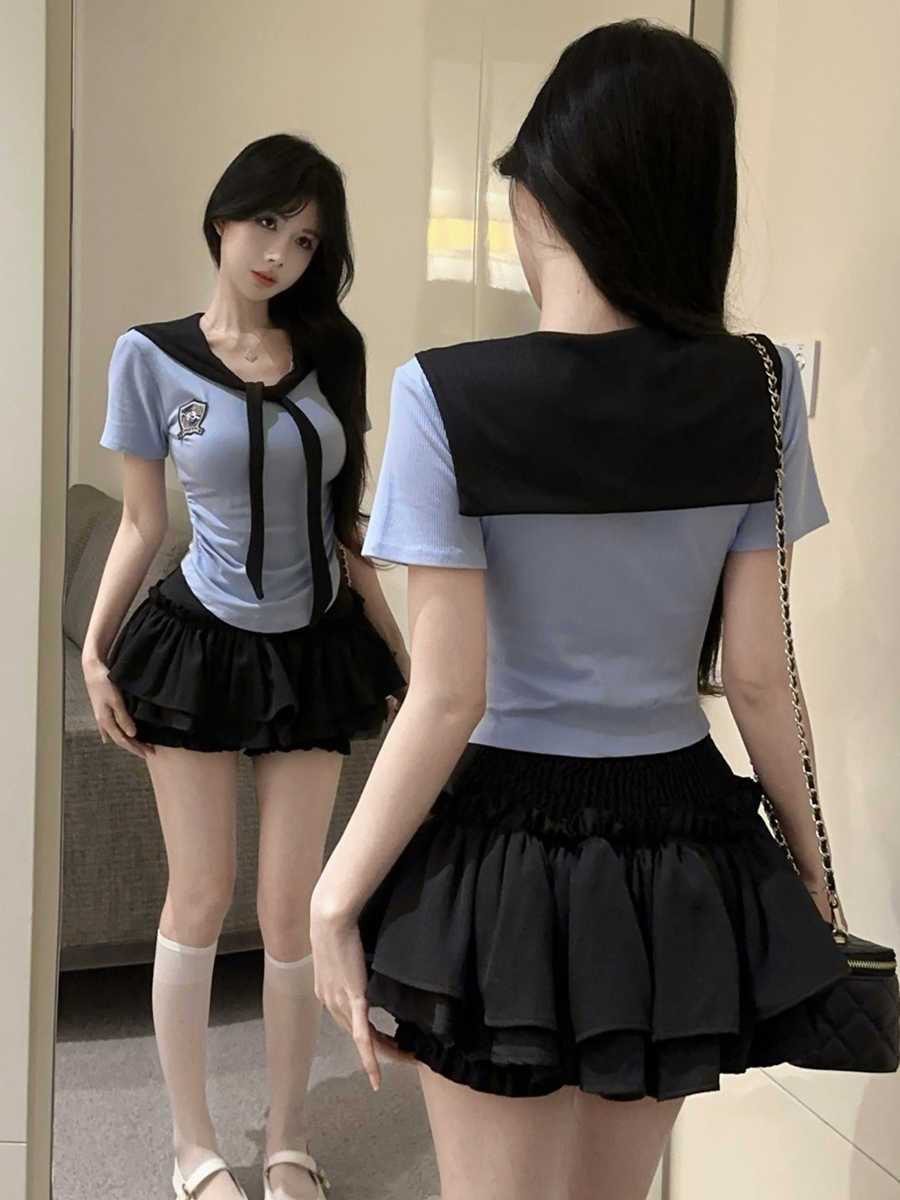 Internet Celebrity Sexy Navy Collar Color-Blocked Slimming Look Pullover T-Shirt Top + Puffy Skirt Jk Uniform Two-Piece Set