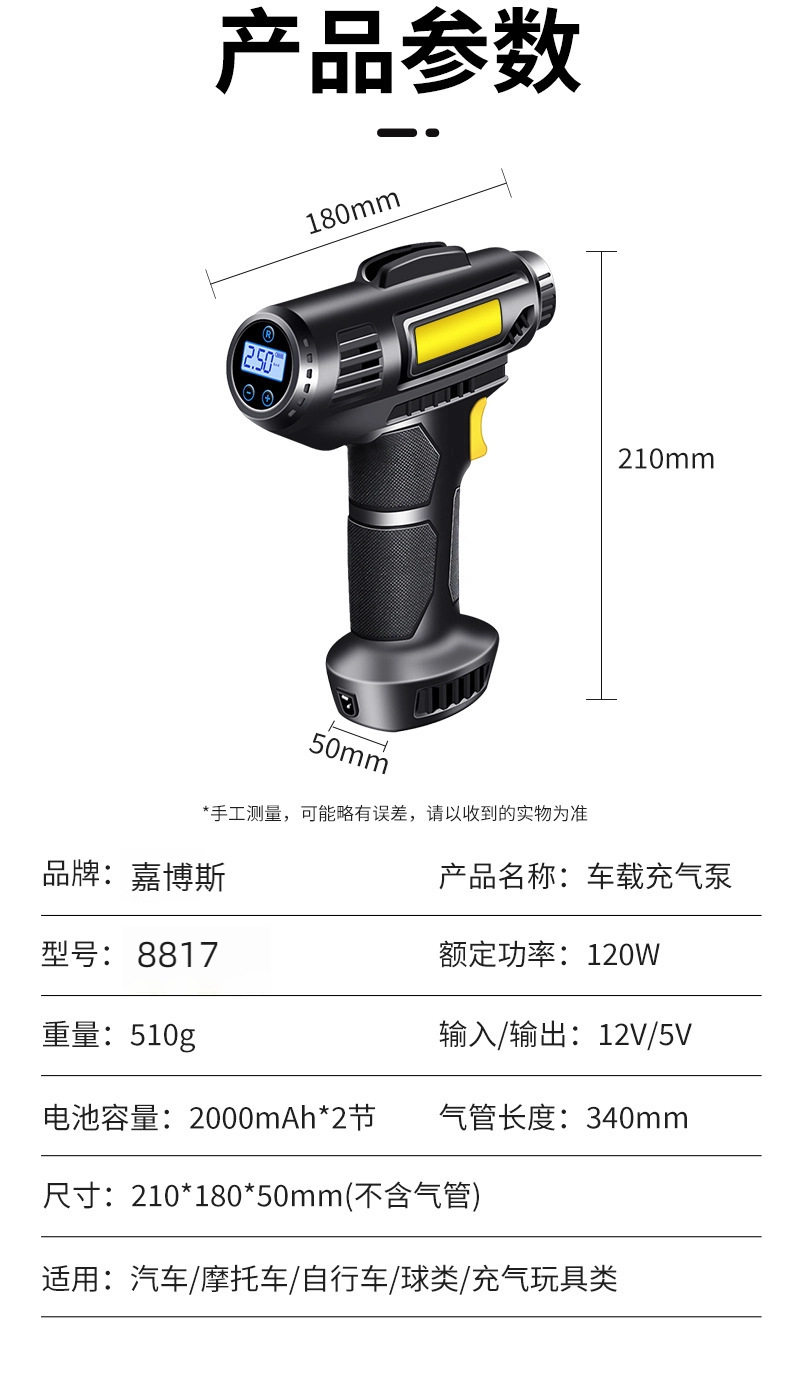| Specifications | Gun type handheld air pump [12v wired - mechanical watch],Gun-type handheld air pump [12v wired - digital display - intelligent charging and stopping] cross-border hot model,Gun-type handheld air pump [wireless charging-digital display-smart charging and stopping] |