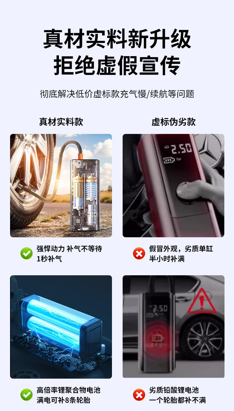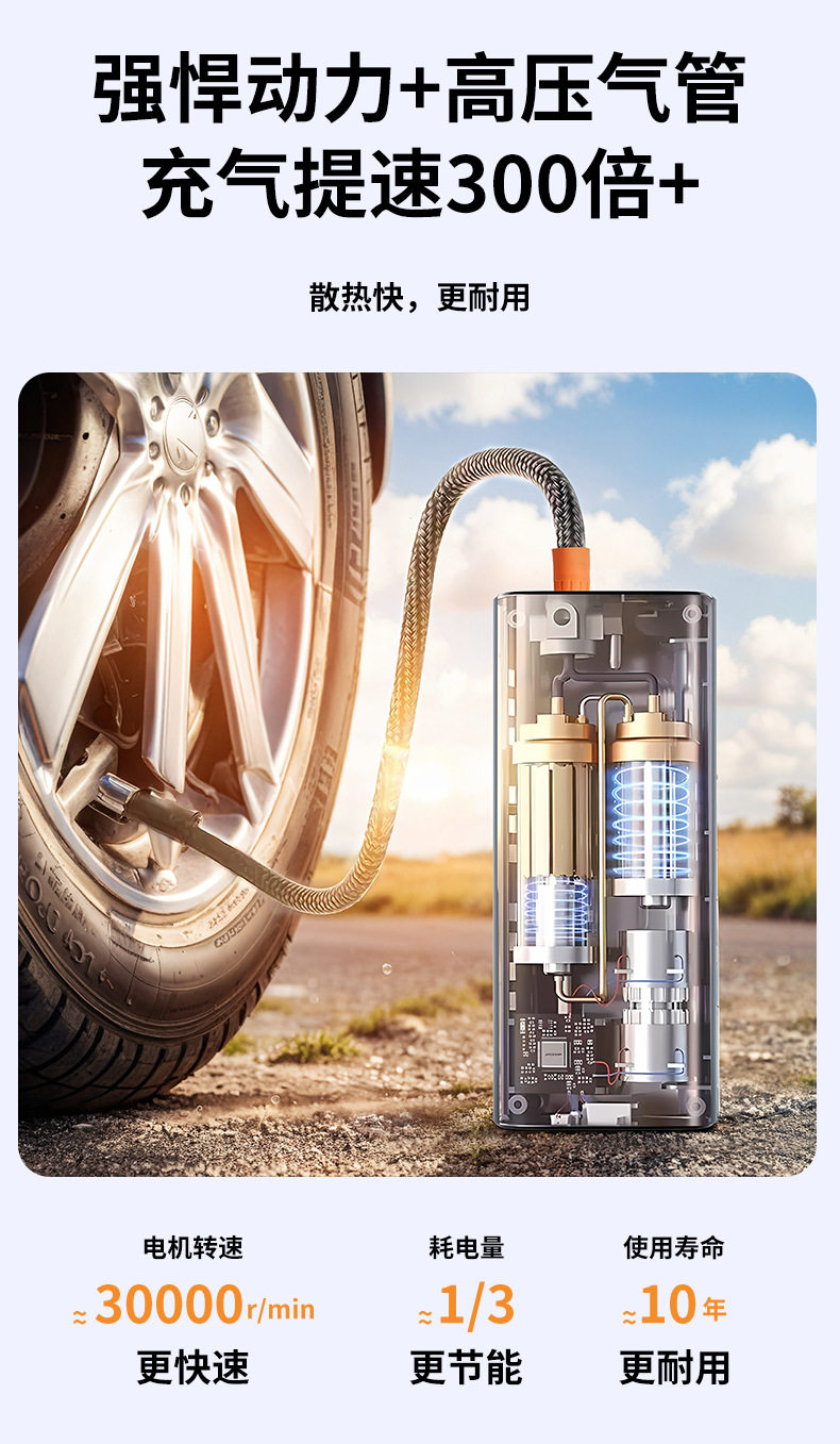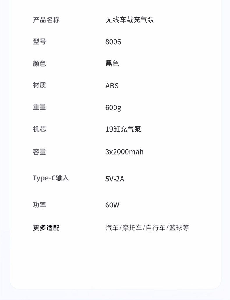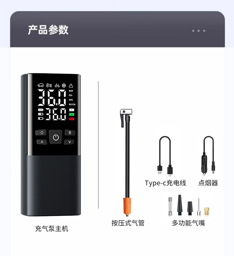 | Power supply type | Type-c polymer lithium battery + cigarette lighter |