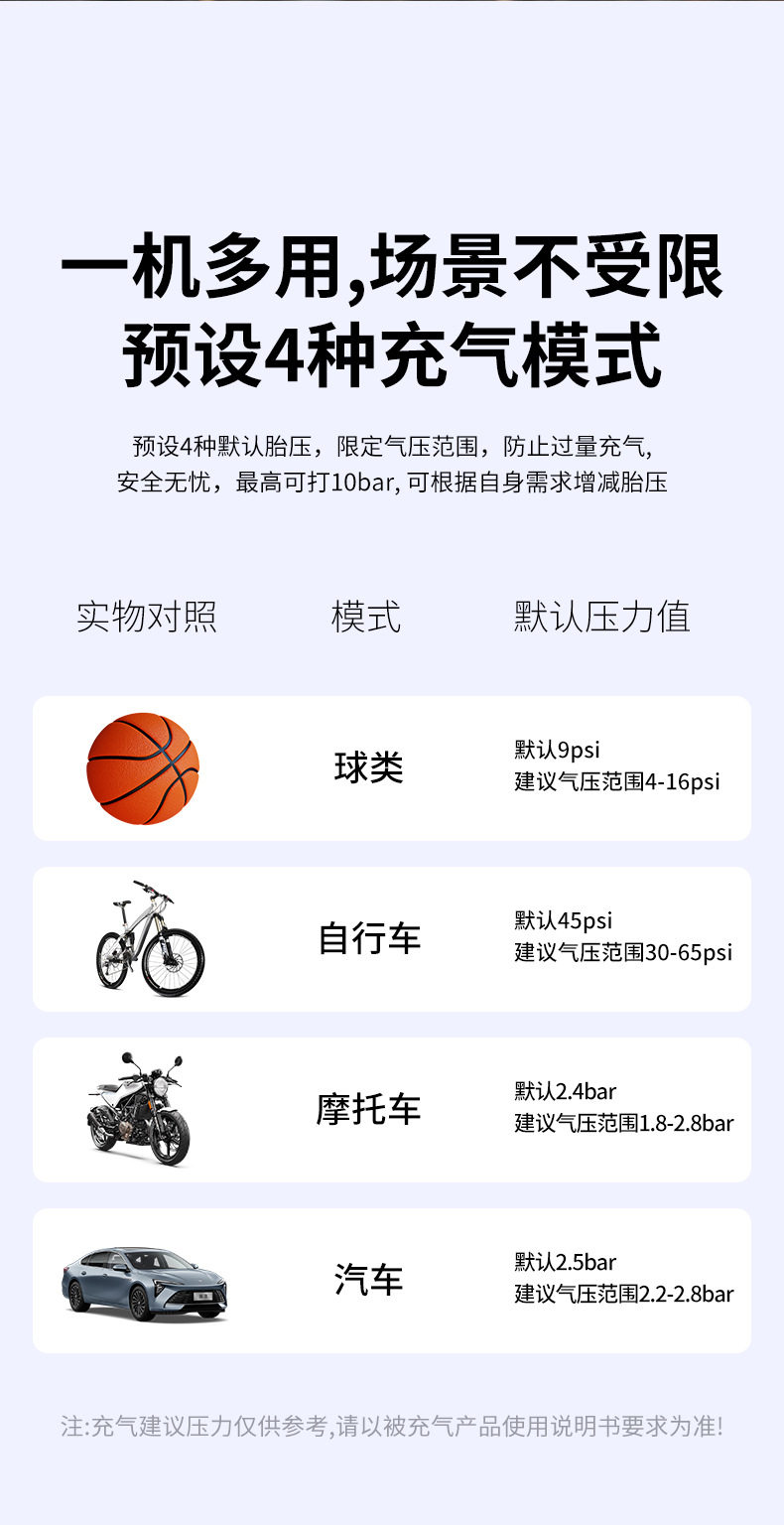 | Additional features | Lighting,Tire pressure gauge,Warning light,Usb charging |