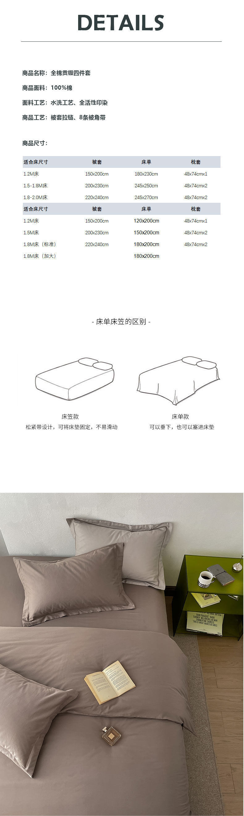 | Size specifications | 150*200cm/single quilt cover,200*230cm/single quilt cover,220*240cm/single quilt cover,1.2m bed sheet model [quilt cover 150*200/sheet 180*230/pillowcase*1] three-piece set,1.5m bed sheet model [quilt cover 200*230/sheet 245*250/pillowcase*2] four-piece set,1.8m bed sheet model [quilt cover 200*230/sheet 245*250/pillowcase*2] four-piece set,2.0m bed sheet model [quilt cover 220*240/sheet 245*270/pillowcase*2] four-piece set,1.2m fitted sheet [quilt cover 150*200/fitted sheet 120*200/pillowcase*1] three-piece set,1.5m fitted sheet [quilt cover 200*230/fitted sheet 150*200/pillowcase*2] four-piece set,1.8m fitted sheet [quilt cover 200*230/fitted sheet 180*200/pillowcase*2] four-piece set,1.8m fitted sheet [quilt cover 220*240/fitted sheet 180*200/pillowcase*2] four-piece set |