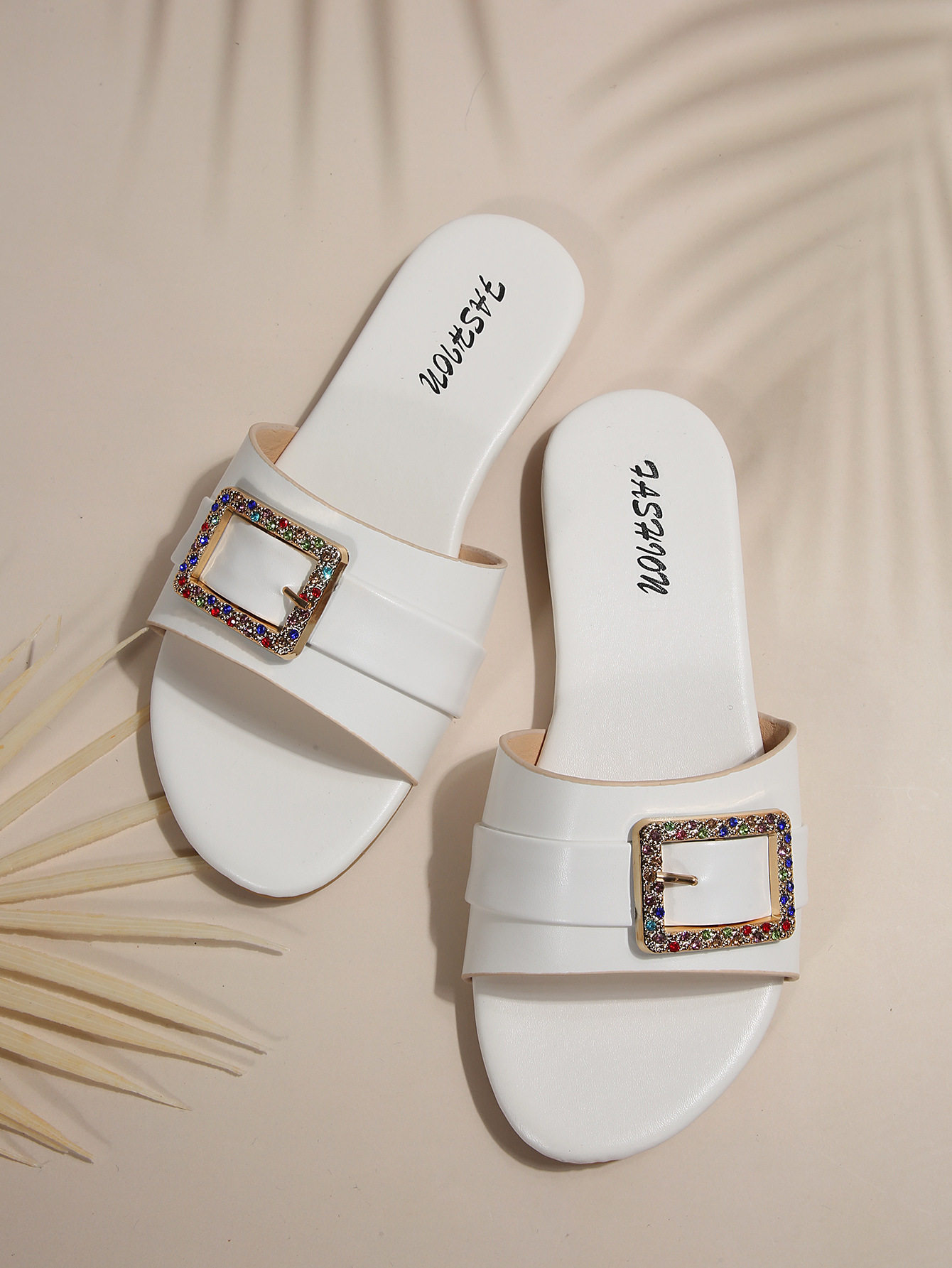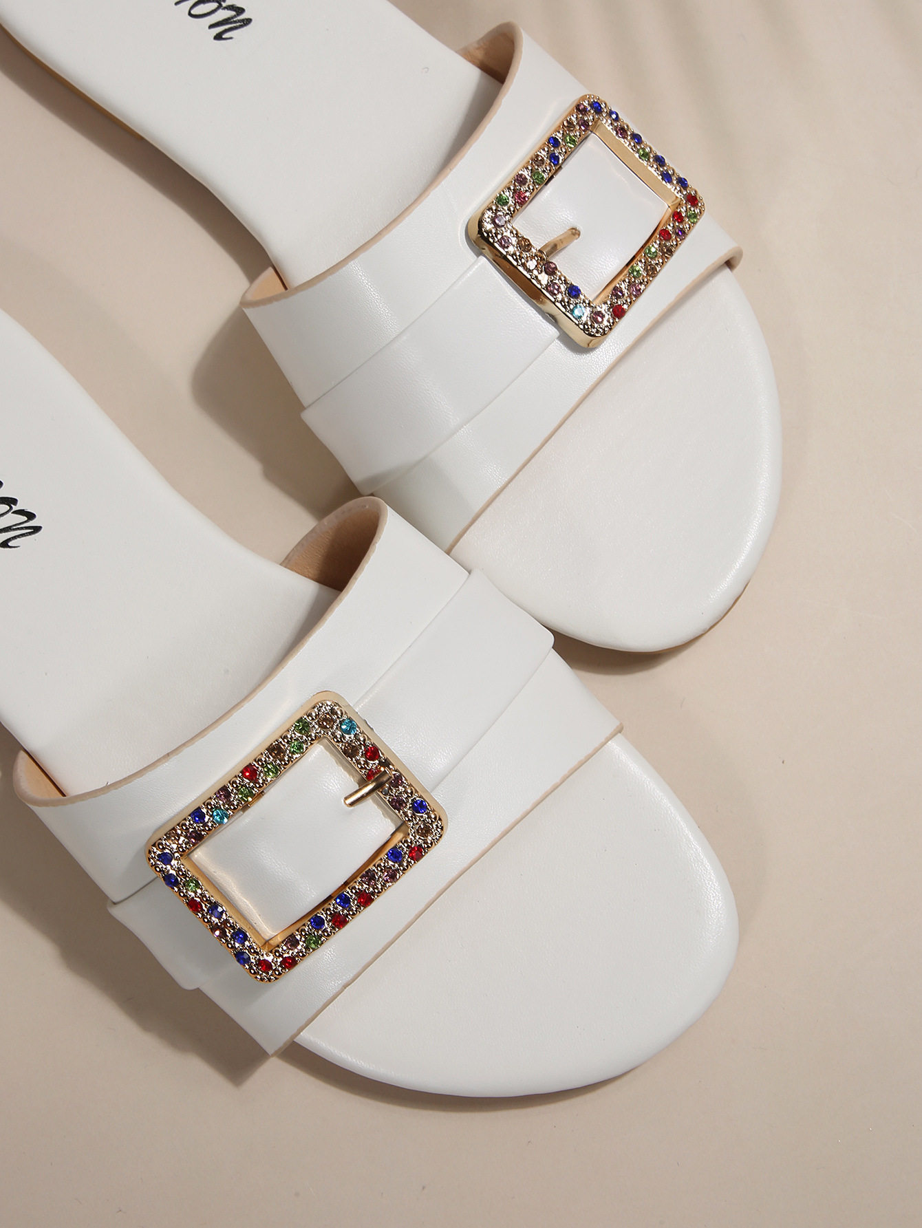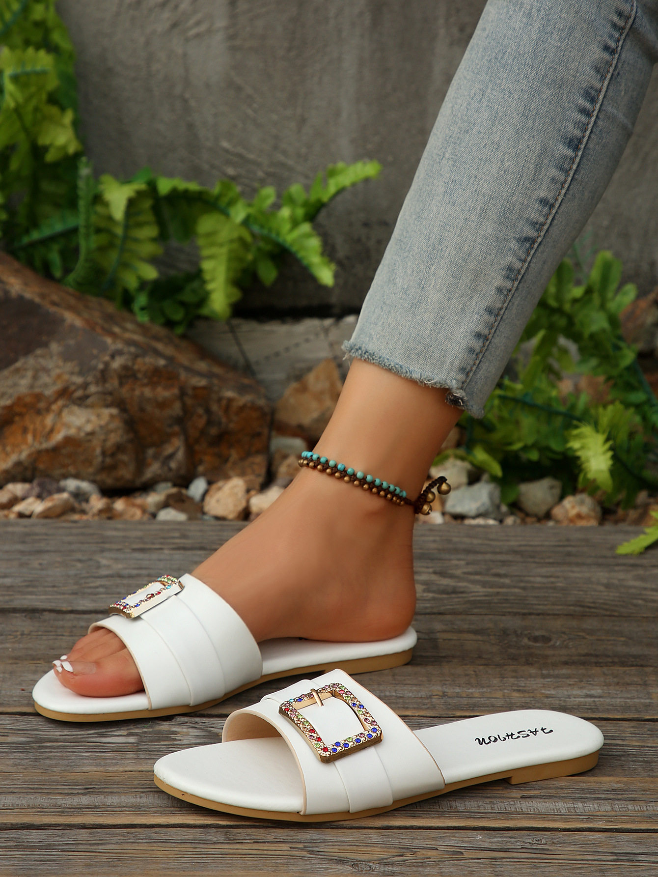 Cross-Border Women's Shoes Wholesale New Fashion Slippers Classic Temperament Versatile Solid Color Metal Decoration Round Toe Flat Sandals