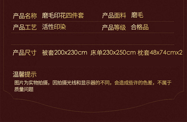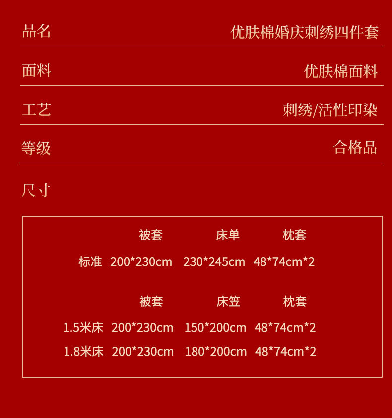 | Size specifications | 1.5m bed sheet four-piece set (quilt cover 200*230cm),1.8m bed sheet four-piece set (quilt cover 200*230cm),2.0m bed sheet four-piece set (quilt cover 200*230cm) |