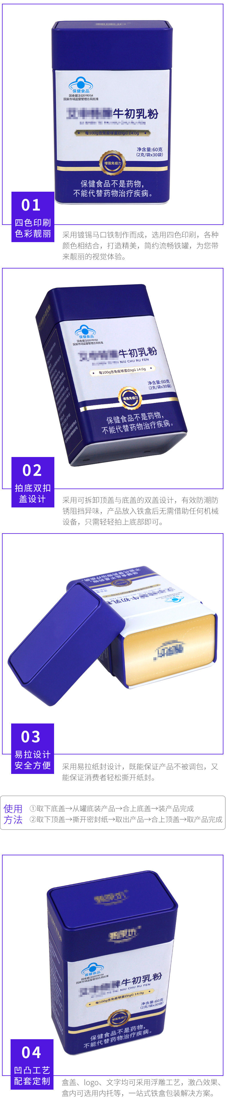 Factory Processing Health Food Tin Box Solid Beverage Tin Can Custom Rectangular Bovine Colostrum Powder Tin Box Packaging Box
