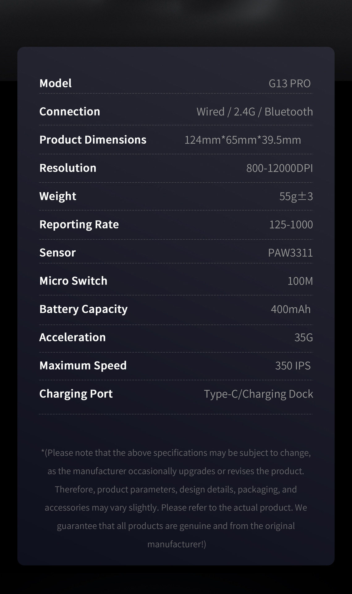 | Color | G13 pro with base-white [wired+2.4g+bluetooth] paw3311,G13 pro with base-black [wired+2.4g+bluetooth] paw3311,G13s battery replacement without screen - white [wired + 2.4g + bluetooth] paw3311,G13s battery replacement without screen - black [wired + 2.4g + bluetooth] paw3311 |