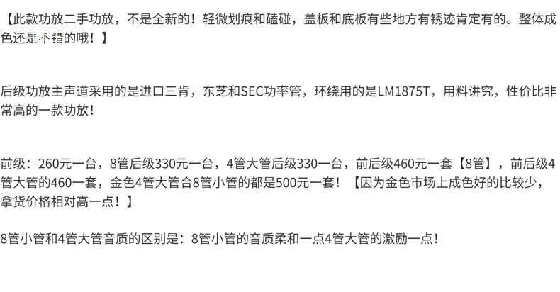 | Color | A set of 4 large tubes, front and rear stages,A set of golden 4/8 tube preamp and postamp,A set of small tube 8 tubes before and after the stage,Small tube 8-tube post-stage,4-tube bassoon power amplifier,Preamp |