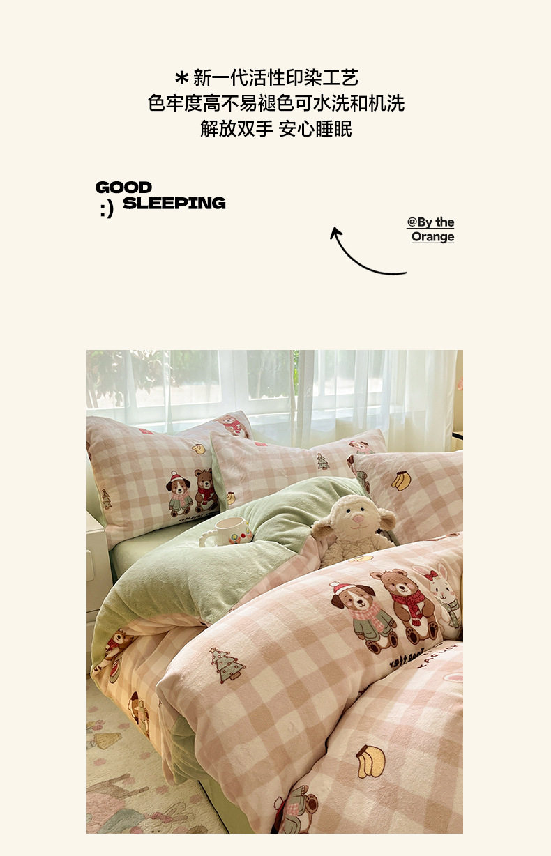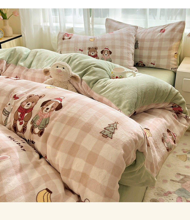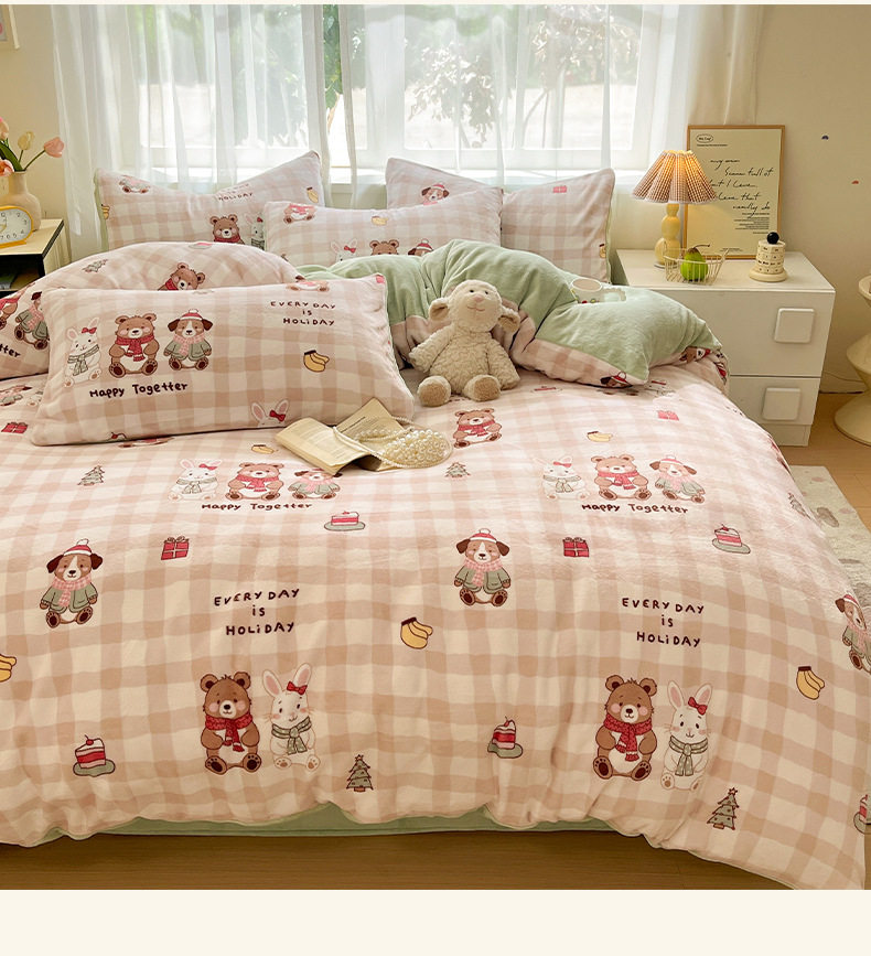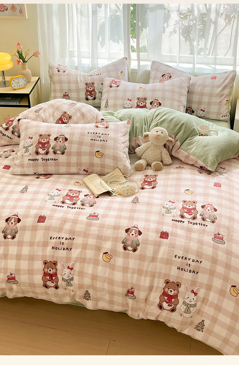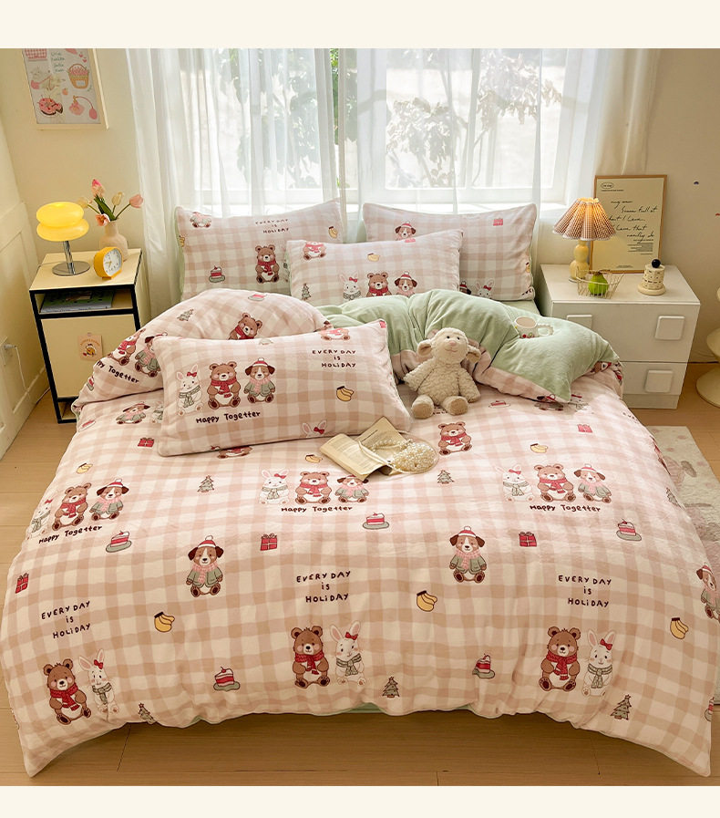 Simple Cartoon High Weight Printed Home Four-Piece Bedding Set Warm Bed Sheetss and Quilt Cover Winter Fleece-Lined