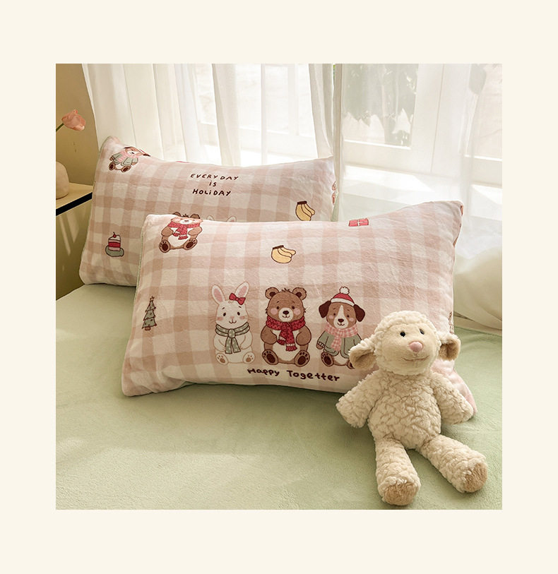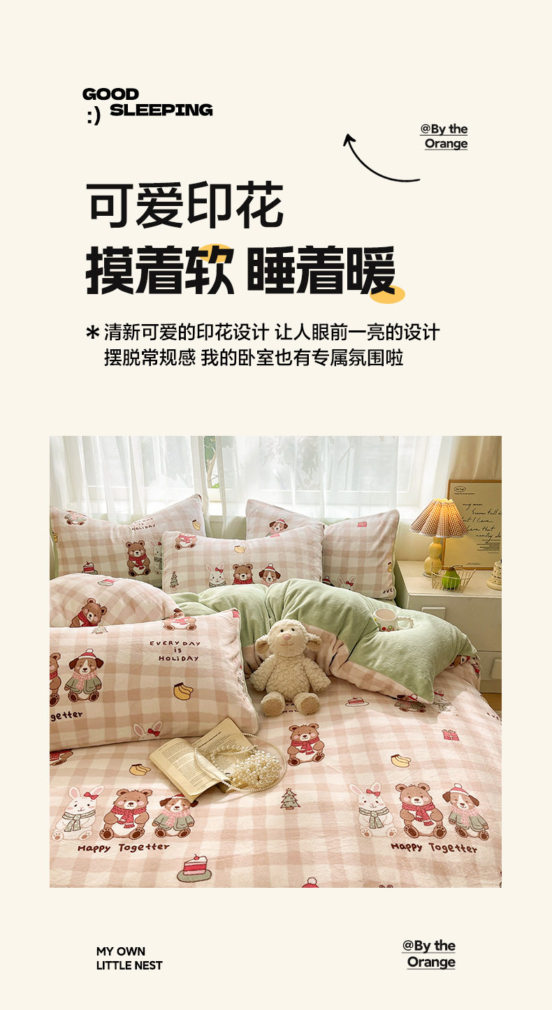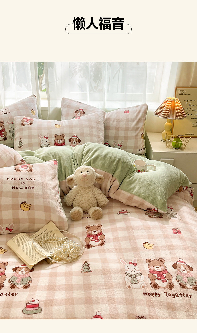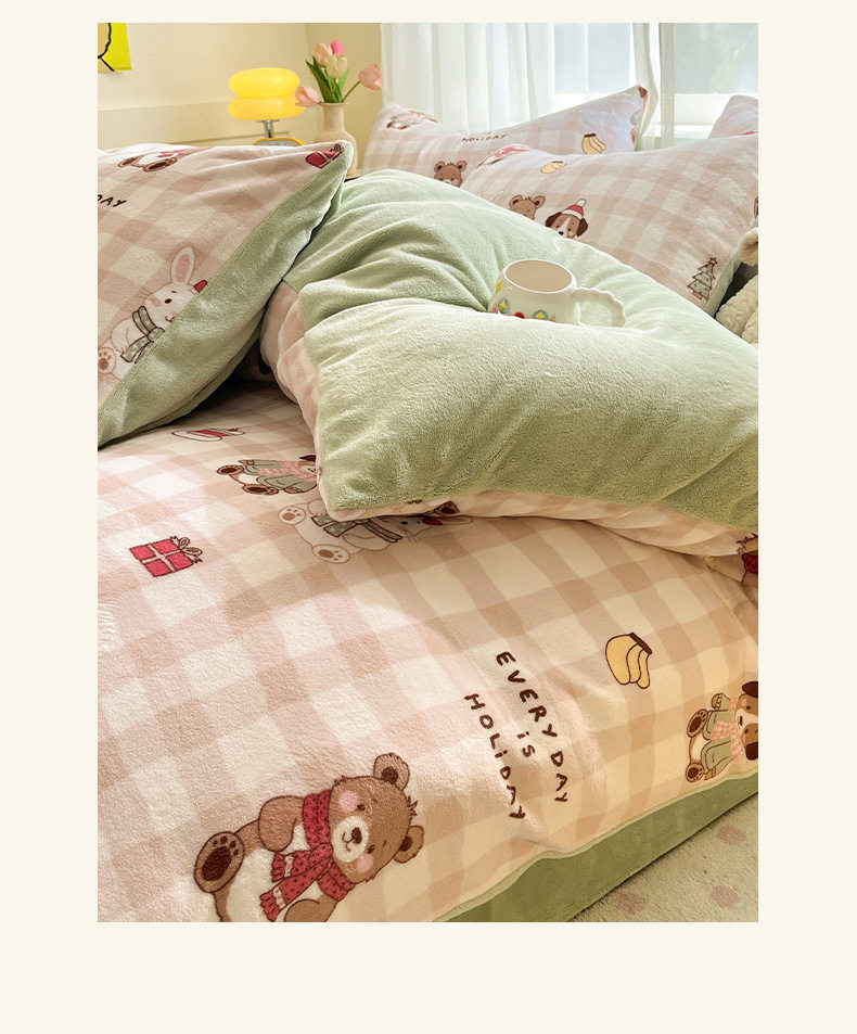 Simple Cartoon High Weight Printed Home Four-Piece Bedding Set Warm Bed Sheetss and Quilt Cover Winter Fleece-Lined