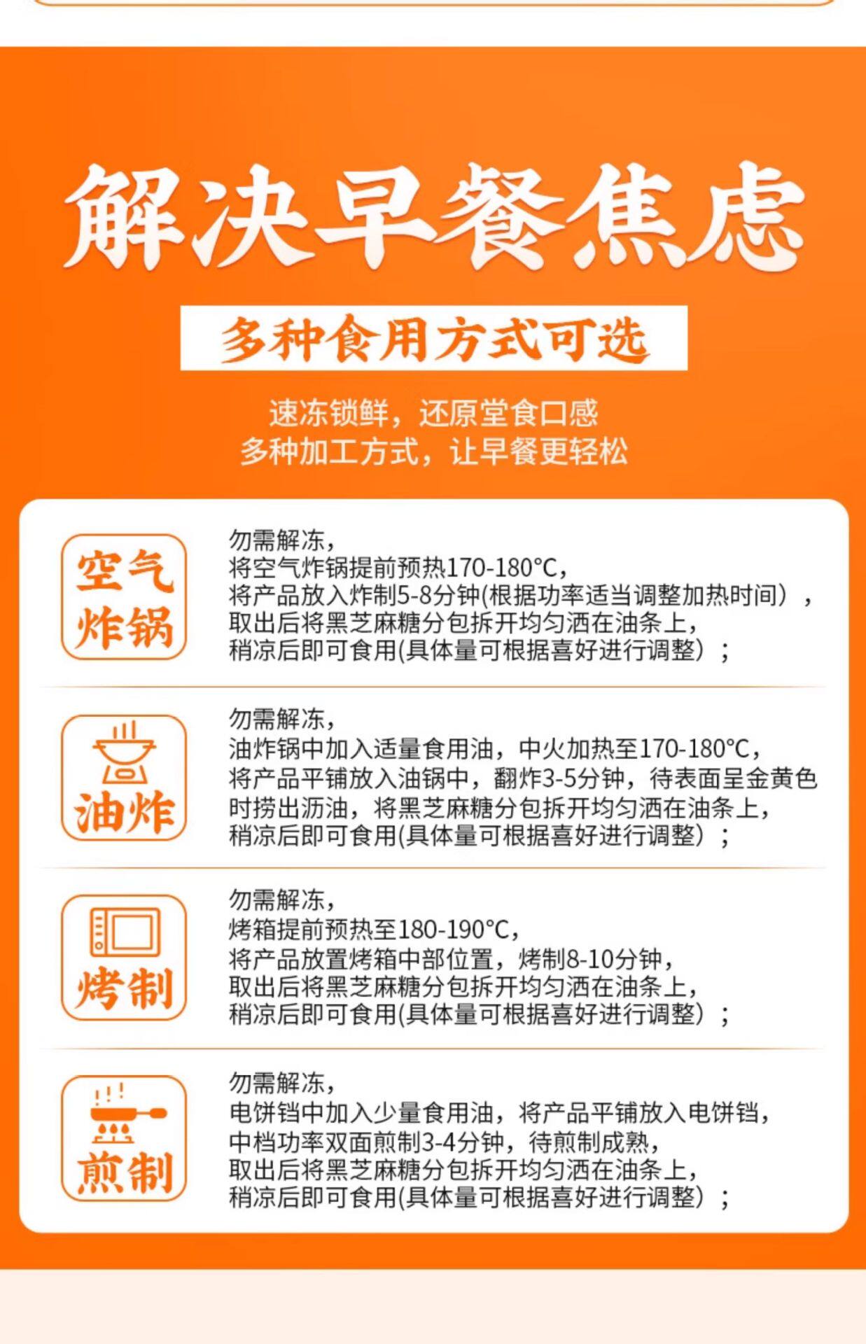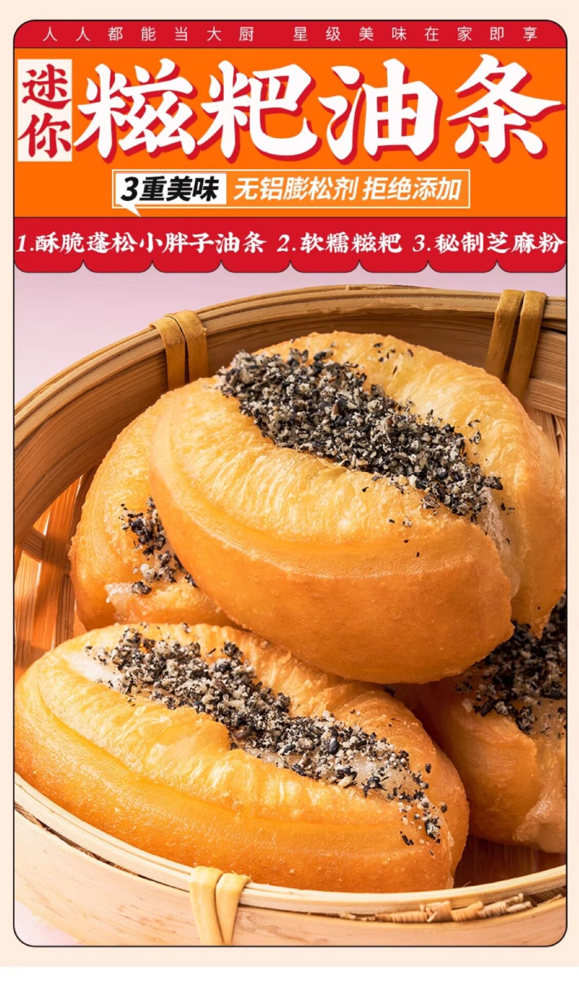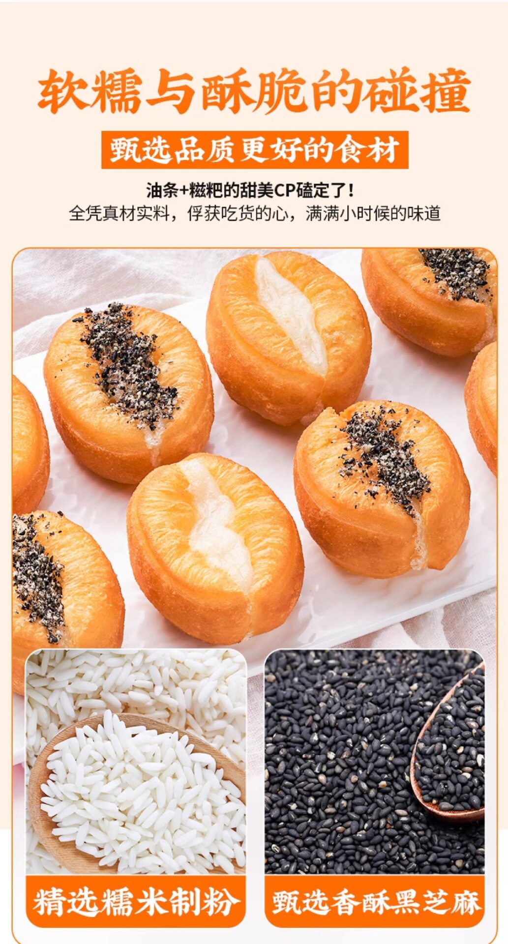 | Packaging specifications | Little fatty youtiao 400g (about 26 pieces),[free 8 bags of sprinkles] mini rice cake fried dough sticks 400g*2 bags (24 sticks),[free 12 bags of sprinkles] mini glutinous rice cake fried dough sticks 400g*3 bags (36 sticks),[free 16 bags of sprinkles] mini glutinous rice cake fried dough sticks 400g*4 bags (48 sticks),[free 20 bags of sprinkles] mini glutinous rice cake fried dough sticks 400g*5 bags (60 sticks),[free 24 bags of sprinkles] mini glutinous rice cake fried dough sticks 400g*6 bags (72 sticks),[free 4 bags of sprinkles] mini glutinous rice cake fried dough sticks 400g*1 bag (12 sticks),Little fatty youtiao 400g*2 bags (about 52 pieces),Little fatty youtiao 400g*3 bags (about 78 pieces),Little fatty youtiao 400g*4 bags (about 104 pieces) |