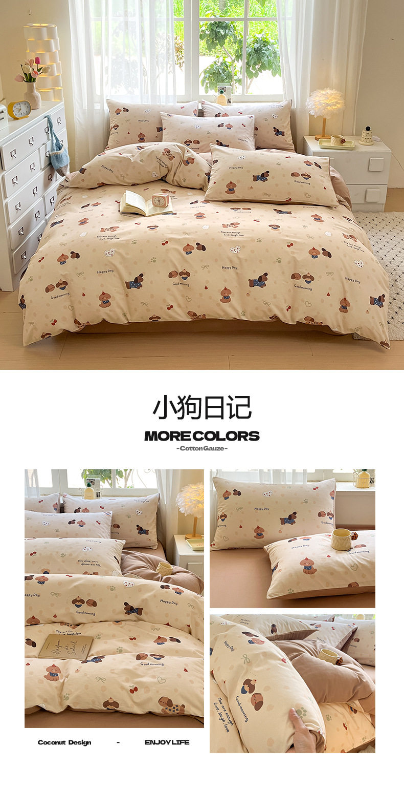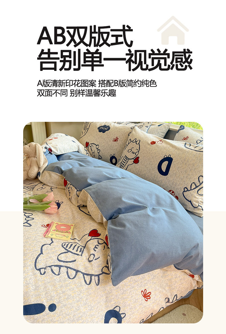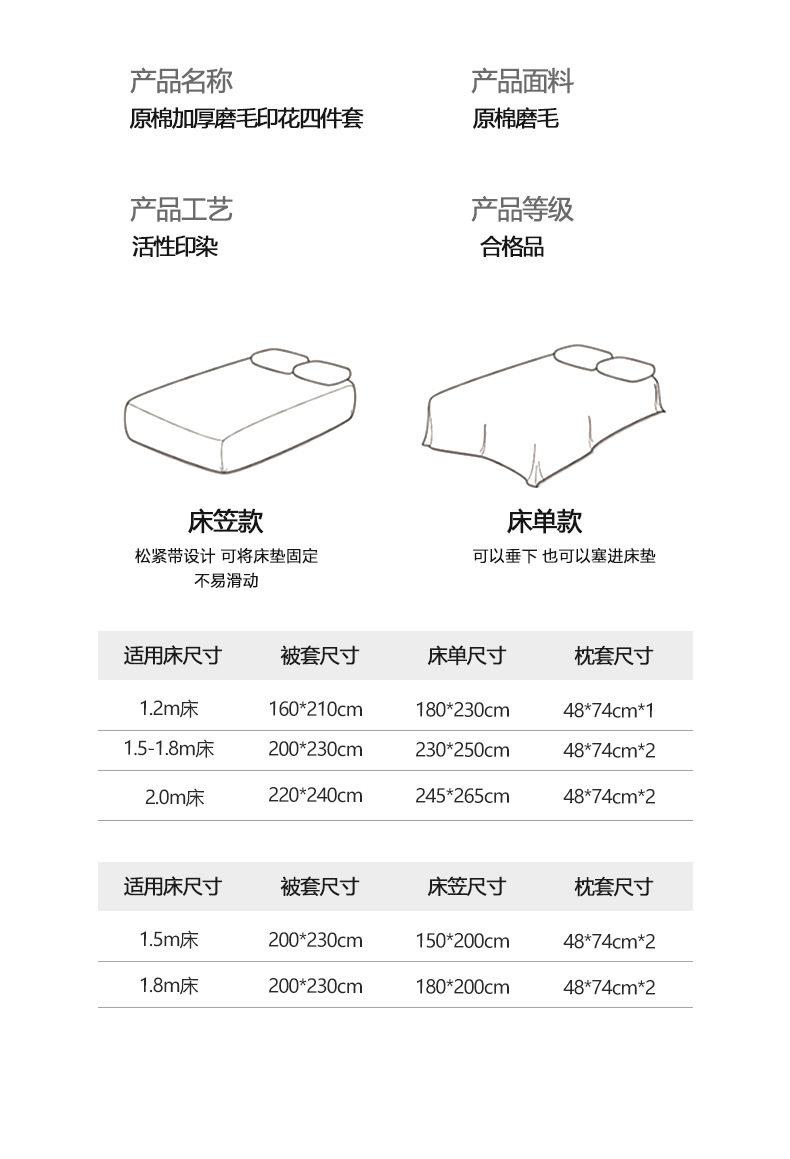 | Size specifications | 1.2 three-piece bed sheet set [quilt cover 160*210cm+sheet 180*230cm+pillowcase*1],1.5-sheet four-piece set [quilt cover 200*230cm+sheet 230*250cm+pillowcase*2],1.8-sheet four-piece set [quilt cover 200*230cm+sheet 230*250cm+pillowcase*2],2.0 four-piece bed sheet set [quilt cover 220*240cm+sheet 245*265cm+pillowcase*2],1.5-piece fitted sheet set [quilt cover 200*230cm+ fitted sheet 150*200cm+ pillowcase*2],1.8-piece fitted sheet set [quilt cover 200*230cm+ fitted sheet 180*200cm+ pillowcase*2],160*210cm single quilt cover,200*230cm single quilt cover,220*240cm single quilt cover |