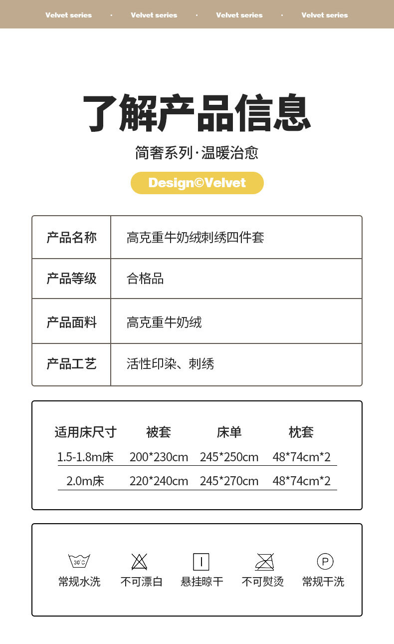 | Size specifications | 1.5m bed sheet four-piece set: quilt cover 200*230cm,1.8m bed sheet four-piece set: quilt cover 200*230cm,2.0m bed sheet four-piece set: quilt cover 220*240cm,1.5m fitted sheet set of four: fitted sheet 150*200cm,1.8m fitted sheet set of four: fitted sheet 180*200cm |