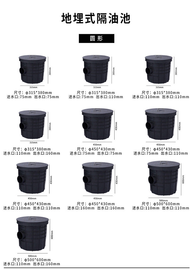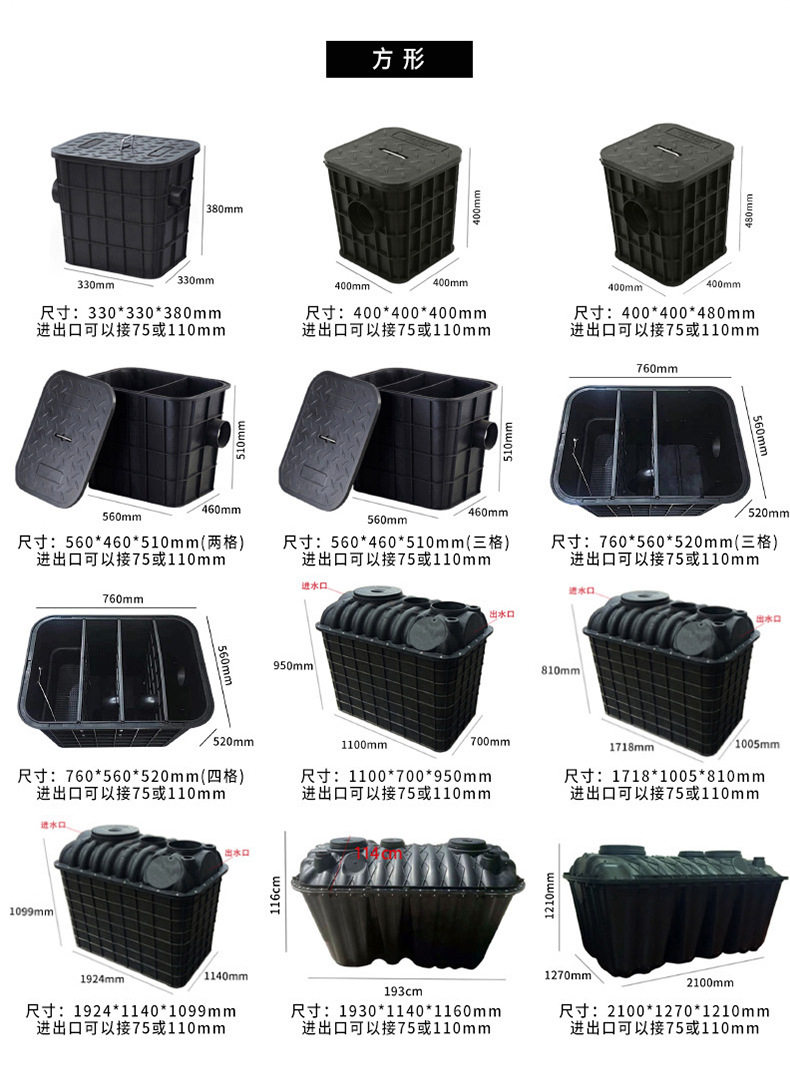 | Specifications | 330*330*380 [square] 110/110,400*400*400 [square] 110/110,400*400*480 [square] 110/110,560*460*510 [square 2 grids] 110/110,560*460*510 [square 3 grids] 110/110,760*560*520 [square 3 grids] 110/110,760*560*520 [square 4 grids] 75/110,800*400*420 [square 4 grid] 110/110,1100*700*950 [square] 75/110,315*380 [round] 75/75,315*380 [round] 75/110,315*380 [round] 110/110,315*380 [round] 110/160,450*430 [round] 75/75,450*430 [round] 110/110,450*430 [round] 160/160,500*600 [round] 110/110,500*600 [round] 110/160,Reducing head fitting - inlet/outlet diameter 75mm reduces to 50mm,Reducing head fitting - inlet/outlet diameter 75mm reduces to 63mm,Reducing head fitting - inlet/outlet diameter 110mm reduces to 50mm,Reducing coupling - inlet/outlet diameter 110mm reduces to 63mm,Reducing head fitting - inlet/outlet diameter 110 reduces to 75 |