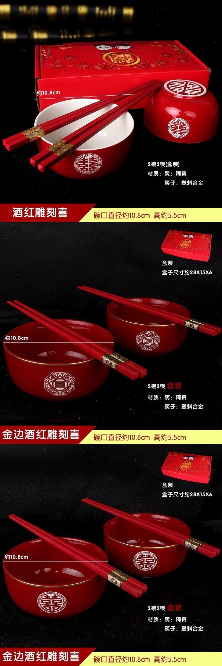 | Color | Burgundy gold-rimmed carving yuan xi (send happy chopsticks),Burgundy gold-rimmed engraving fang xi (send happy chopsticks),Wine red carving happy (send happy chopsticks),Wine red happy day (send happy chopsticks) |