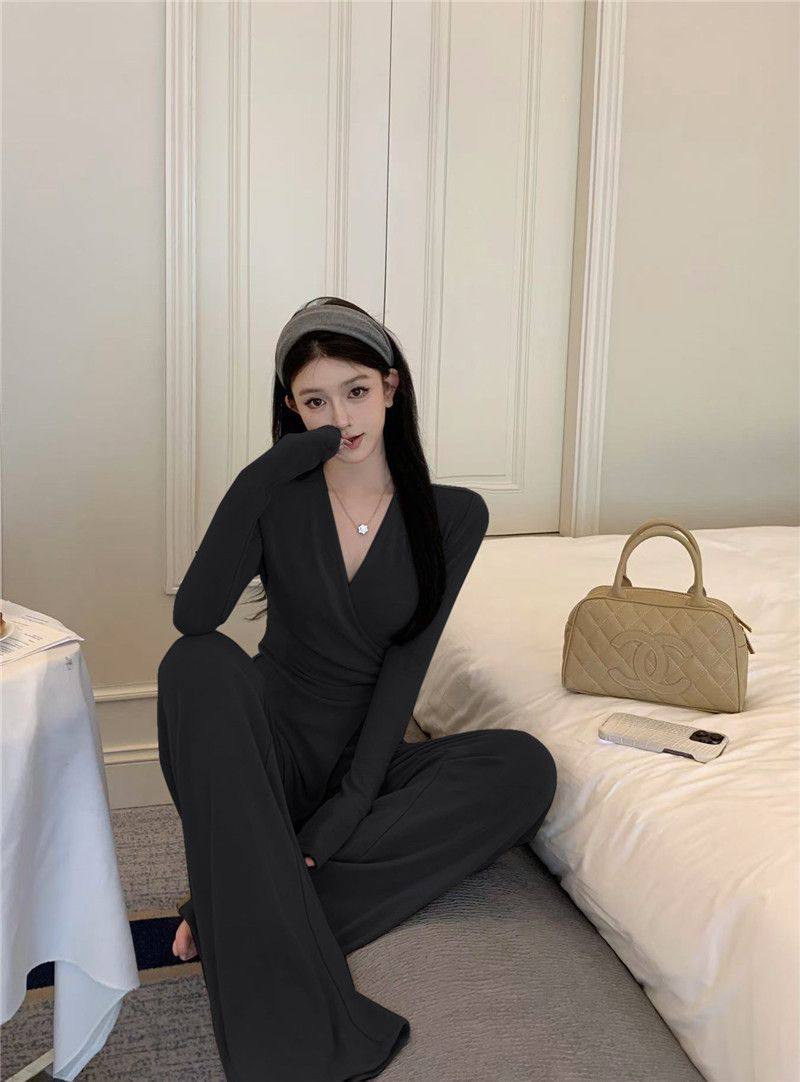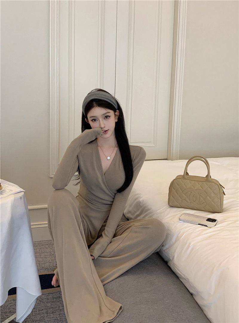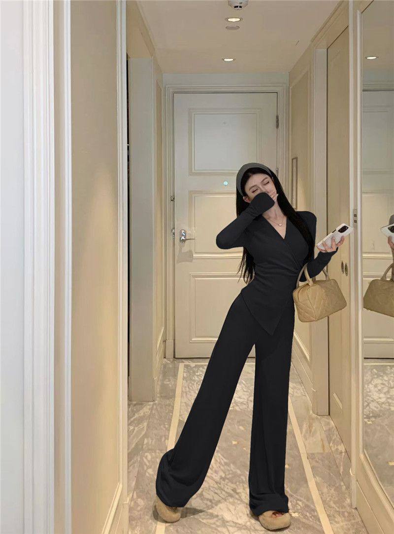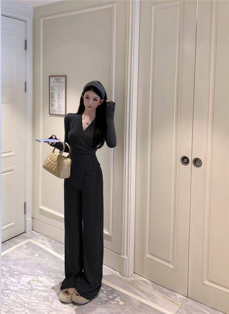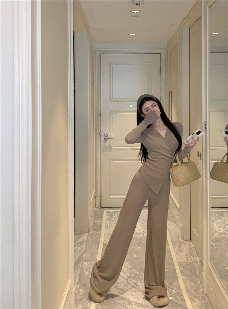 Casual Suit, Asymmetrical Slim Fit, Cross V-Neck, Long Sleeves, Fashionable Autum Wear, Micro-Flared Wide-Leg Pants Two-Piece Set