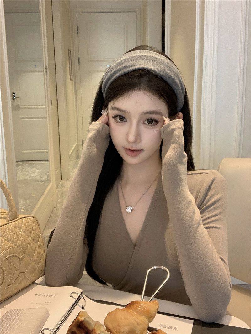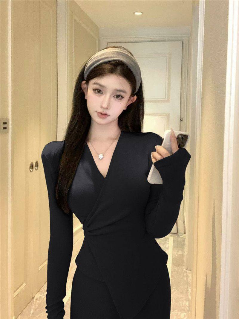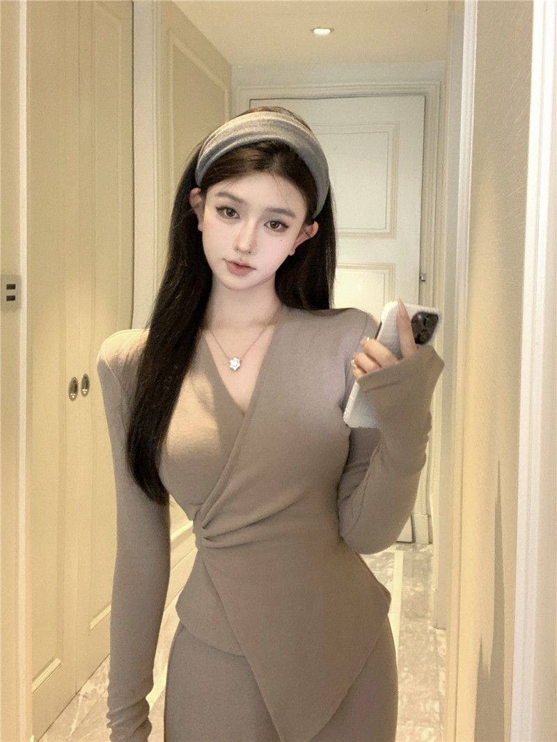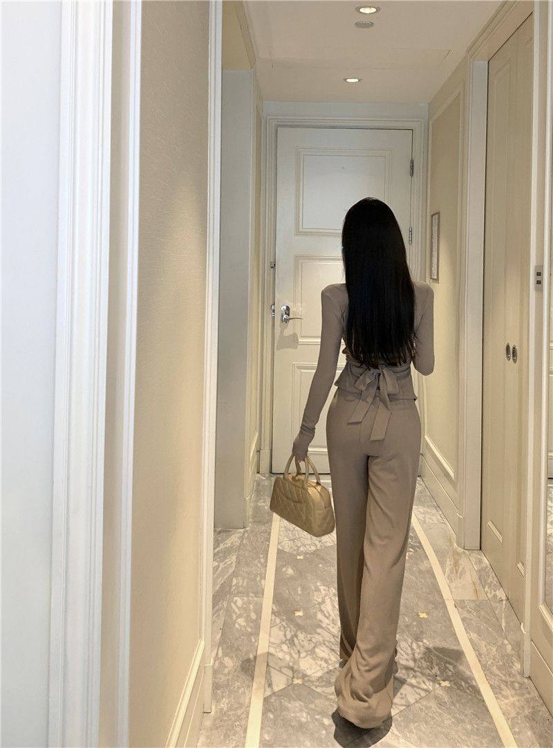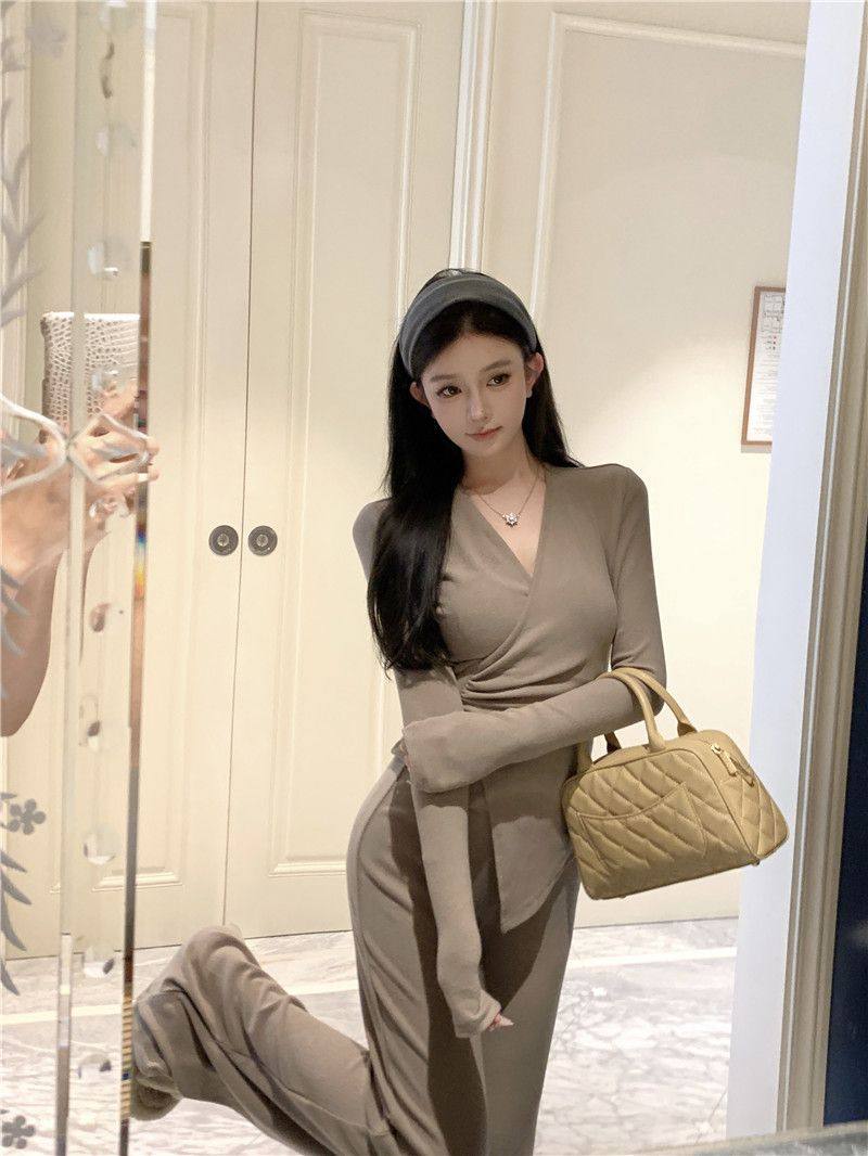Casual Suit, Asymmetrical Slim Fit, Cross V-Neck, Long Sleeves, Fashionable Autum Wear, Micro-Flared Wide-Leg Pants Two-Piece Set