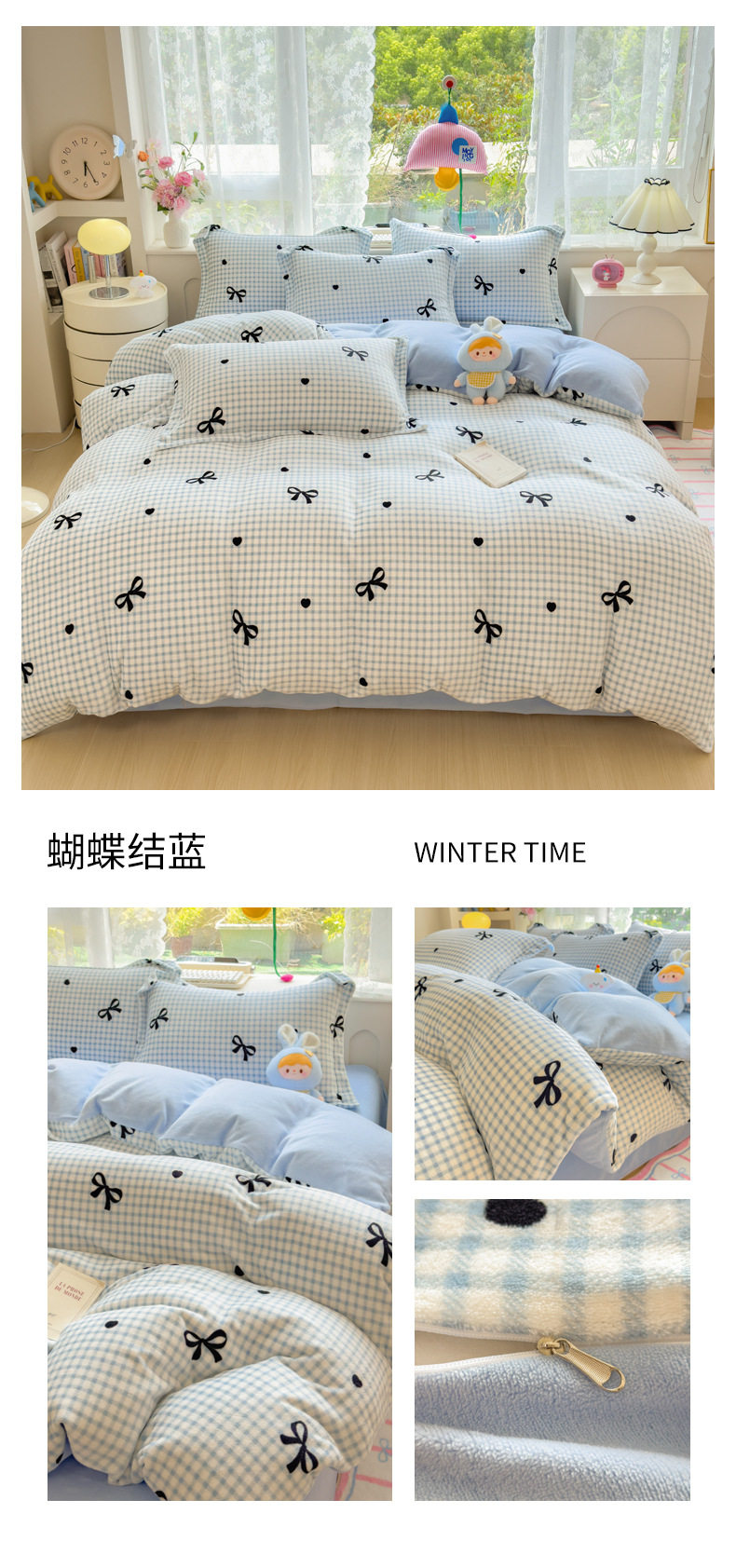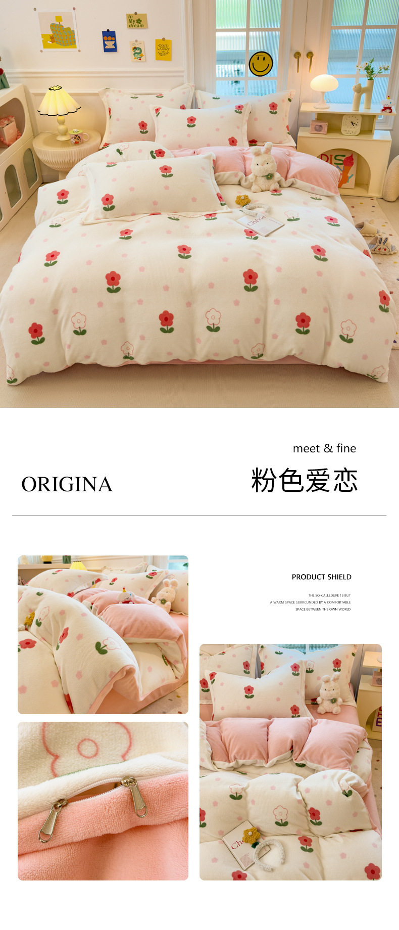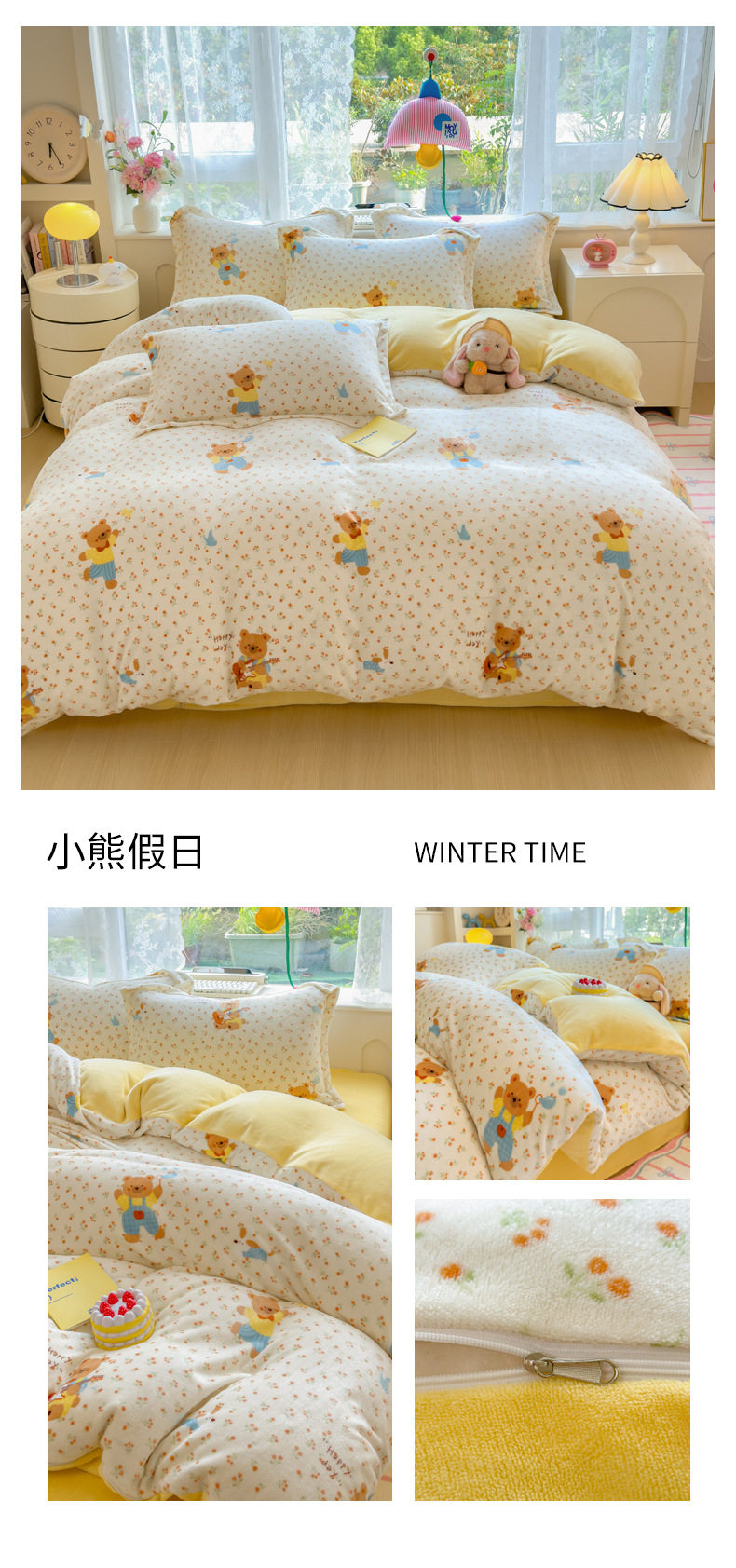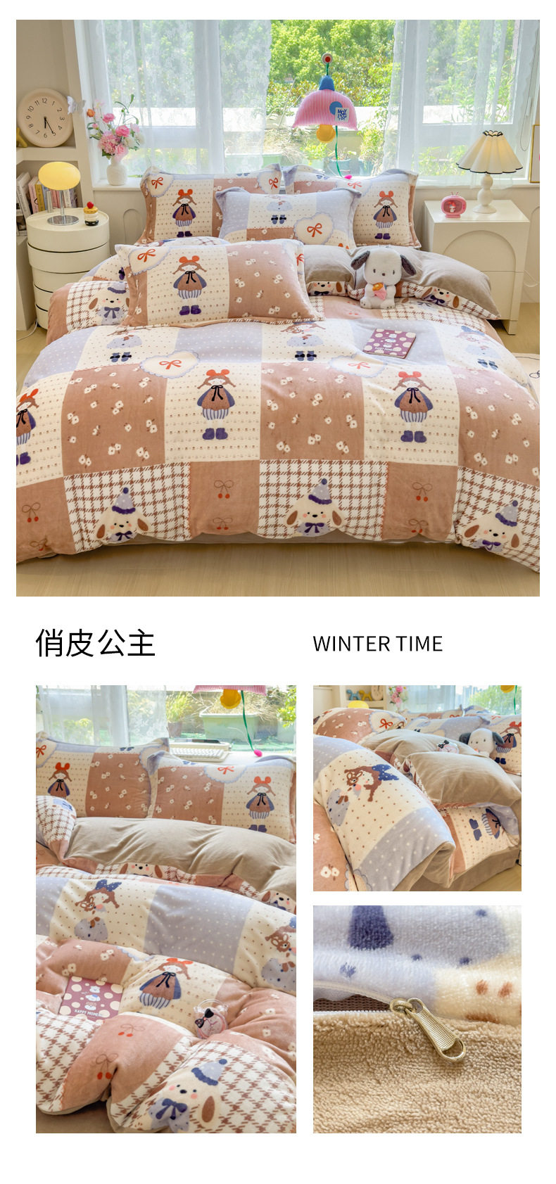 Autumn and Winter Thickened Milk Velvet Four-Piece Dormitory Cartoon Coral Velvet Bed Sheet Three-Piece Set Super Soft Warm Quilt Cover Wholesale