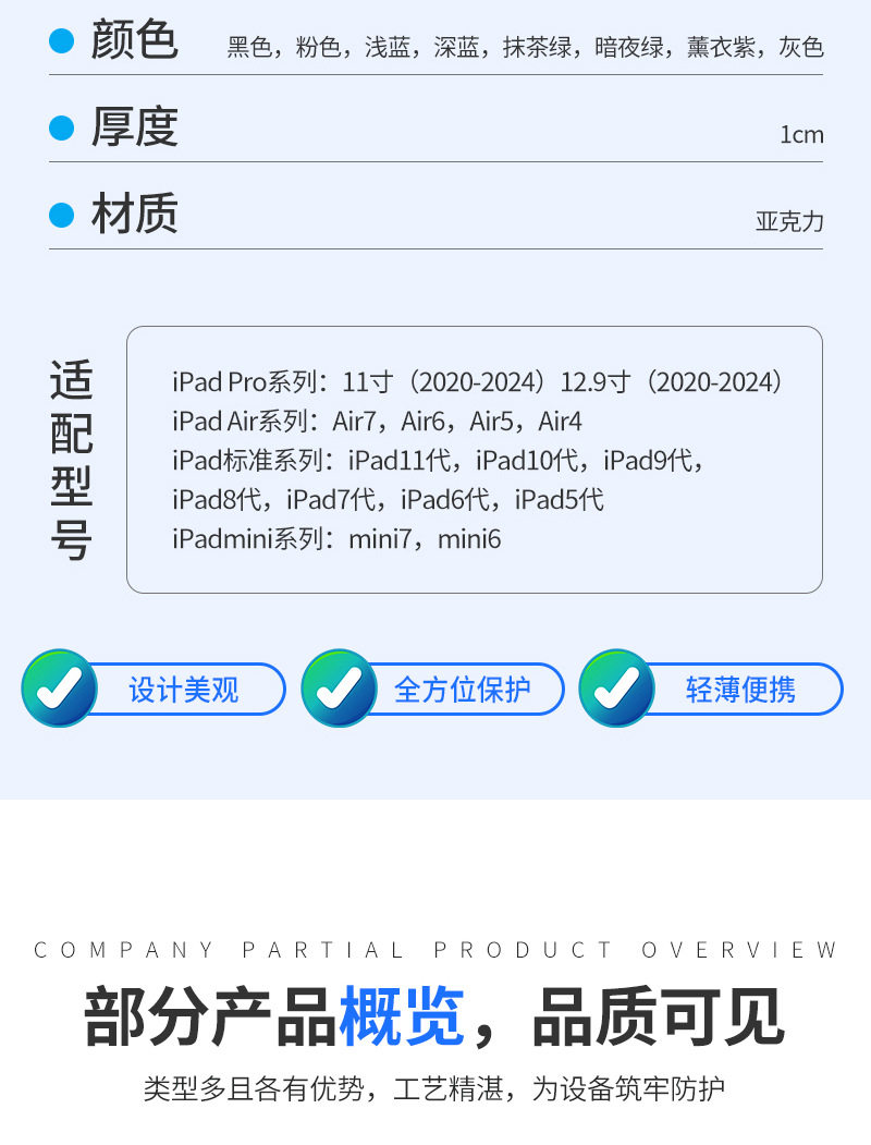 | Applicable models | Mini6/7,iPadAir1/2,iPadAir3/10.5,iPadAir4/5,Ipad7/8/9 generation,Ipad 10/11 generation a16,pro11(20/21/22),Pro12.9(20/21/22),New 11inch ipad air(m2/m3),New 11inch ipad pro (m4) 2024 model,New 13inch ipad air(m2/m3),New 13inch ipad pro (m4) 2024 model |