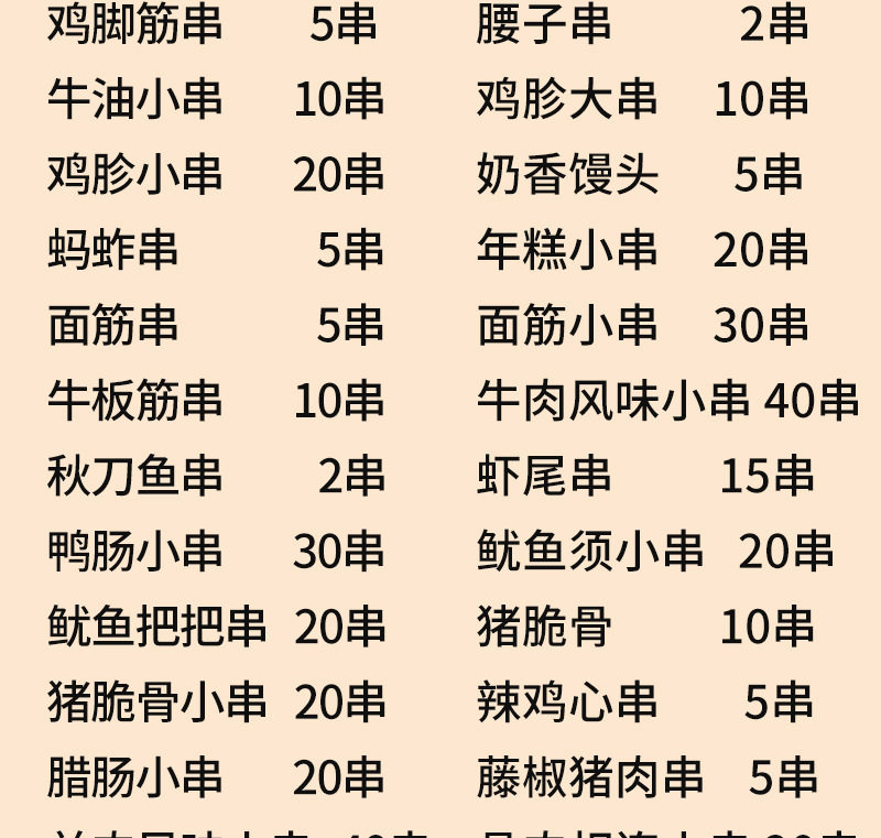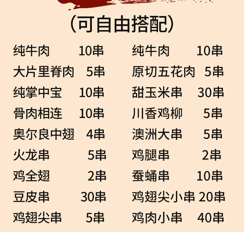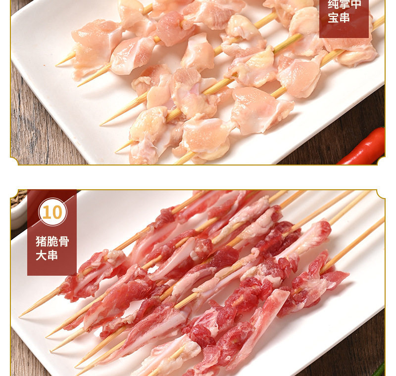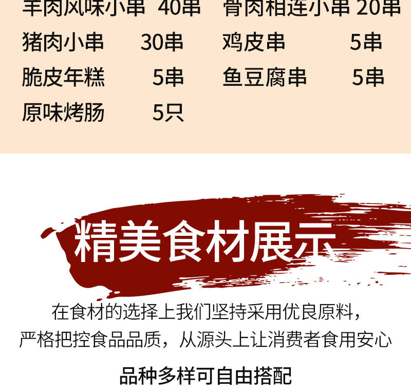 Packaging specifications 1 food clip-100g,Zibo cookies buy 1 get 1 free [send 2 packs]-100g,Flame chicken skewers 10 skewers [activity style]-100g,100g squid plate 2 skewers [more than addictive]-100g,2 pairs of tinfoil roasted pork brains [free hot pot ingredients*1+tinfoil box*2]-100g,Flame lamb skewers 10 skewers [our specialty]-100g,Flame beef skewers 10 skewers [our specialty]-100g,Curry chicken skewers 10 skewers-100g,Northeast big oil bian 10 skewers [new product recommendation]-100g,Red willow mutton skewers 10 skewers-100g,Pure palm treasure 10 skewers-100g,Five-flowered pork skewers 5 skewers-100g,Kidney skewers 2 skewers-100g,Large piece of tenderloin 5 skewers-100g,Sichuan chicken fillet 5 skewers-100g,Bone and meat connected 10 skewers-100g,Australian large skewers 5 skewers-100g,Chicken whole wings 2 skewers-100g,Chicken wings 4 skewers-100g,Chicken wing tip skewers 5 skewers-100g,Chicken legs 2 skewers-100g,Chicken hamstrings 5 skewers-100g,Chicken gizzards large skewers 10 skewers-100g,Spicy chicken heart skewers 10 skewers-100g,Chicken skin skewers 5 skewers-100g,Rattan pepper pork skewers 5 skewers-100g,Pork crispy bone skewers 10 skewers-100g,Beef tendon skewers 10 skewers-100g,Bbq pork trotters 4 pieces/pack-100g,Shenyang chicken rack bones 5 skewers-100g,Grasshopper skewers 5 skewers-100g,Garlic scallops 6 pieces-100g,Squid tentacle large skewers 5 skewers-100g,Octopus dragon ball 5 skewers-100g,Octopus and phoenix dance 5 skewers-100g,Eight-clawed corn kernels 5 skewers-100g,Large green shrimp skewers 10 skewers-100g,Big red shrimp skewers 10 skewers-100g,Multi-flavored fish skewers 5 skewers-100g,Small pomfret 6 skewers-100g,Small yellow croaker skewers 5 skewers-100g,Saury skewers 2 skewers-100g,Anjing spicy grilled fish (724g) with tray ingredients)-100g,Premium bacon 1 pack-100g,Sweet potato skin 5 skewers-100g,Crispy rice cake 5 skewers-100g,Sweet corn 4 sticks-100g,Milky steamed bun skewers 5 skewers-100g,Chiba tofu 5 skewers-100g,Fish tofu 5 skewers-100g,Gluten skewers 5 skewers-100g,Fire dragon skewers 5 skewers-100g,Original pure meat sausage 5 pieces-100g,Original authentic sausage 10 pieces-100g,50g starch sausage 6 pieces-100g,100g starch sausage 5 pieces-100g,Pure beef skewers 30 skewers-100g,Pure mutton skewers 30 skewers-100g,20 small skewers of butter-100g,Chicken skewers 40 skewers-100g,Pork slices and small skewers 30 skewers-100g,Pork crispy bone skewers 20 skewers-100g,Small skewers of bone and meat 20 skewers-100g,Tenderloin tendon skewers 25 skewers-100g,Chicken wing tip skewers 20 skewers-100g,Sausage skewers 20 skewers-100g,Spicy duck gizzards 25 skewers-100g,Duck intestine skewers 30 skewers-100g,Tripe skewers 10 skewers-100g,Small skewers of squid tentacles 20 skewers-100g,Small skewers of squid meat 20 skewers-100g,Shrimp tail skewers 20 skewers-100g,Sweet corn small skewers 30 skewers-100g,20 small skewers of rice cake-100g,Gluten skewers 30 skewers-100g,Doupi small skewers 30 skewers-100g,Flame mutton skewers 20 skewers-100g,Flame beef skewers 20 skewers-100g,Flame lamb skewers 40 skewers-100g,Flame beef skewers 40 skewers-100g,20 skewers of mutton kebabs + 20 skewers of beef kebabs [combination]-100g,10 skewers of bone-in pork + 10 skewers of sichuan-flavored chicken fillet [recommended] - 100g,[handmade] mutton skewers 30 skewers-100g,[handmade] beef skewers 30 skewers-100g,Orleans wing*4 wing root*4 wing tip*4-100g,Spicy wings*4 wing root*4 wing tip*4-100g,Tomahawk mutton chops 6 pieces/bag/about 500g-100g,Tendon steak 1 piece (about 150g)-100g,1 slice of sirloin steak (about 150g)-100g,Eye steak 1 piece (about 150g)-100g,Bbq spread 4 cans-100g,Barbecue sauce 1 can-100g,Barbecue oil 1 can-100g,Garlic sauce (original flavor) 200g-100g,Garlic sauce (chopped pepper) 200g-100g,2 wool brushes-100g,Paper dinner plates 10 pieces-100g,Disposable chopsticks 20 pairs-100g,Bamboo sticks 30 pieces-100g,Independent charcoal bag (800g with ignition charcoal) suitable for about 3-5 people, ingredients - 100g,Disposable oven + 16 pieces of ignited fruit charcoal + reinforced charcoal bag - 100g,Spicy small screws【500g】-100g,Spicy cone snail【400g】-100g,Spicy snails【400g】-100g,Spicy crab claws【400g】-100g,Spicy fat flower [410g]-100g,Spicy lobster tail【300g】-100g,Spicy edamame【400g】-100g
