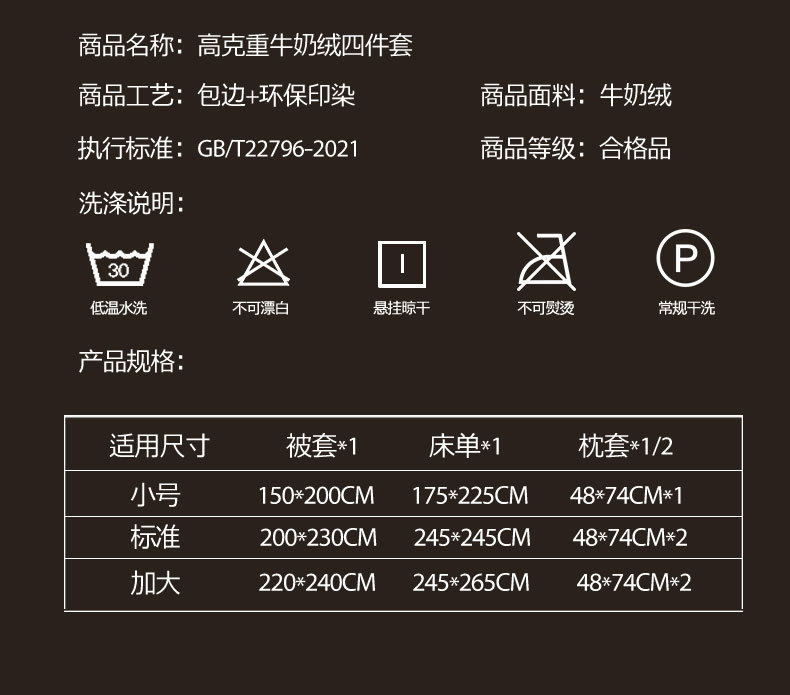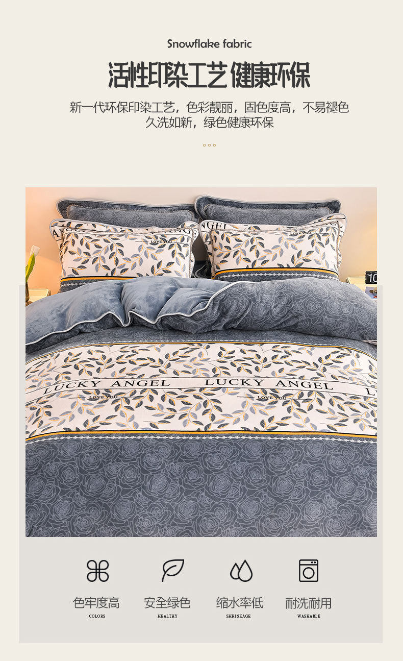 | Size specifications | 1.2m bed sheet three-piece set with random colors (quilt cover 150x200cm),1.5m bed sheet four-piece set (suitable for quilt core 200x230cm) about 4kg,1.8m bed sheet four-piece set (suitable for 200x230cm quilt core) about 4kg,2.0m bed sheet four-piece set (quilt cover 220x240cm enlarged) about 4.3kg |