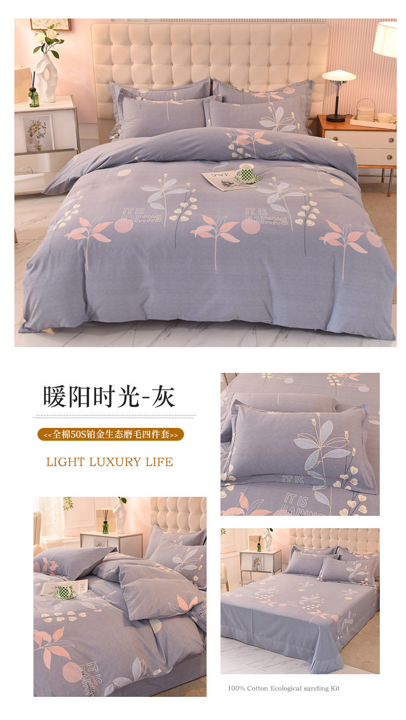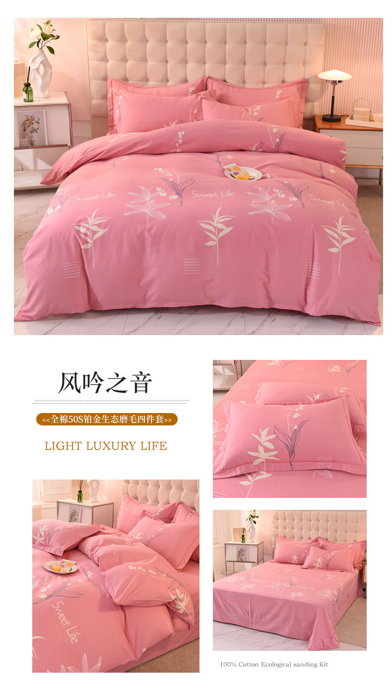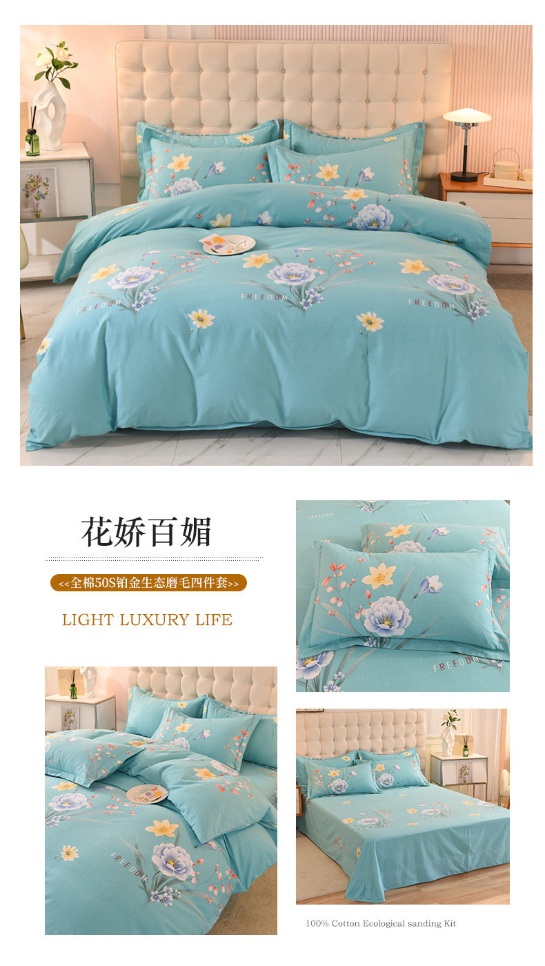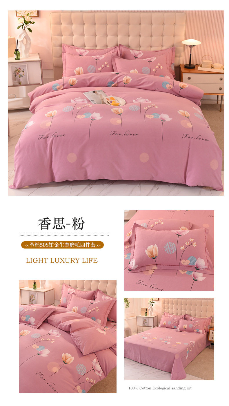 50-Count Pure Cotton Four-Piece Set, Skin-Friendly Brushed Quilt Cover, Soft, Non-Fading, Non-Pilling, Pure Color Bed Bed Sheets Style Set