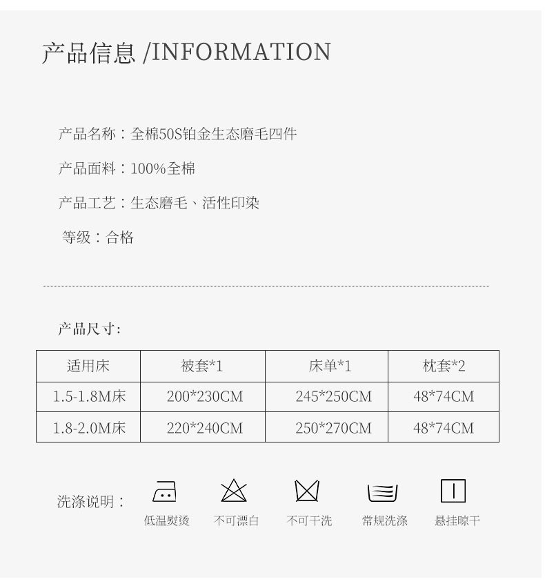| Size specifications | 1.5m bed [sheet set of four] suitable for 200x230cm quilt,1.8m bed [sheet set of four] suitable for 200x230cm quilt,2.0m bed [sheet set of four] suitable for 220x240cm quilt |