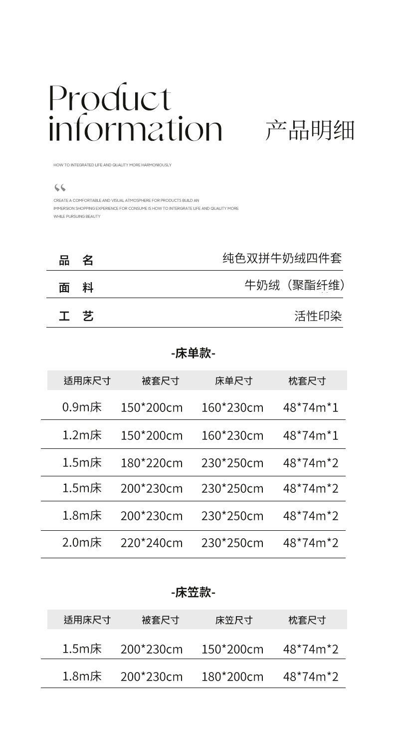 | Size specifications | 0.9m three-piece bed sheet set-suitable for 150x200cm quilt core,1.2m three-piece bed sheet set - suitable for 150x200cm quilt core,1.35m three-piece bed sheet set - suitable for 150x200cm quilt core,1.5m bed sheet four-piece set - suitable for 180x220cm quilt core,1.5m bed sheet four piece quilt cover 200*230,1.8m four-piece bed sheet set - suitable for 200x230cm quilt core,2m bed sheet four-piece set-suitable for 220x240cm quilt core,1.5m fitted sheet set of four - suitable for 200x230cm quilt core,1.8m fitted sheet set of four - suitable for 200x230cm quilt core,150x200cm single quilt cover,180x220cm single quilt cover,200x230cm single quilt cover,220x240cm single quilt cover,A pair of 48x74cm pillowcases |