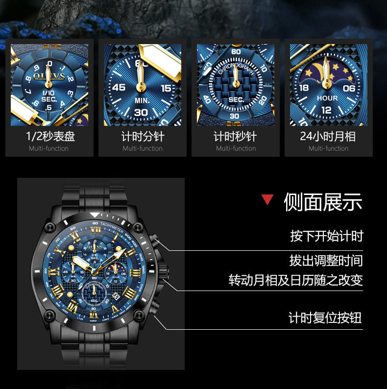 | Special features | Chronograph,24 hour indication,Moon phase display |