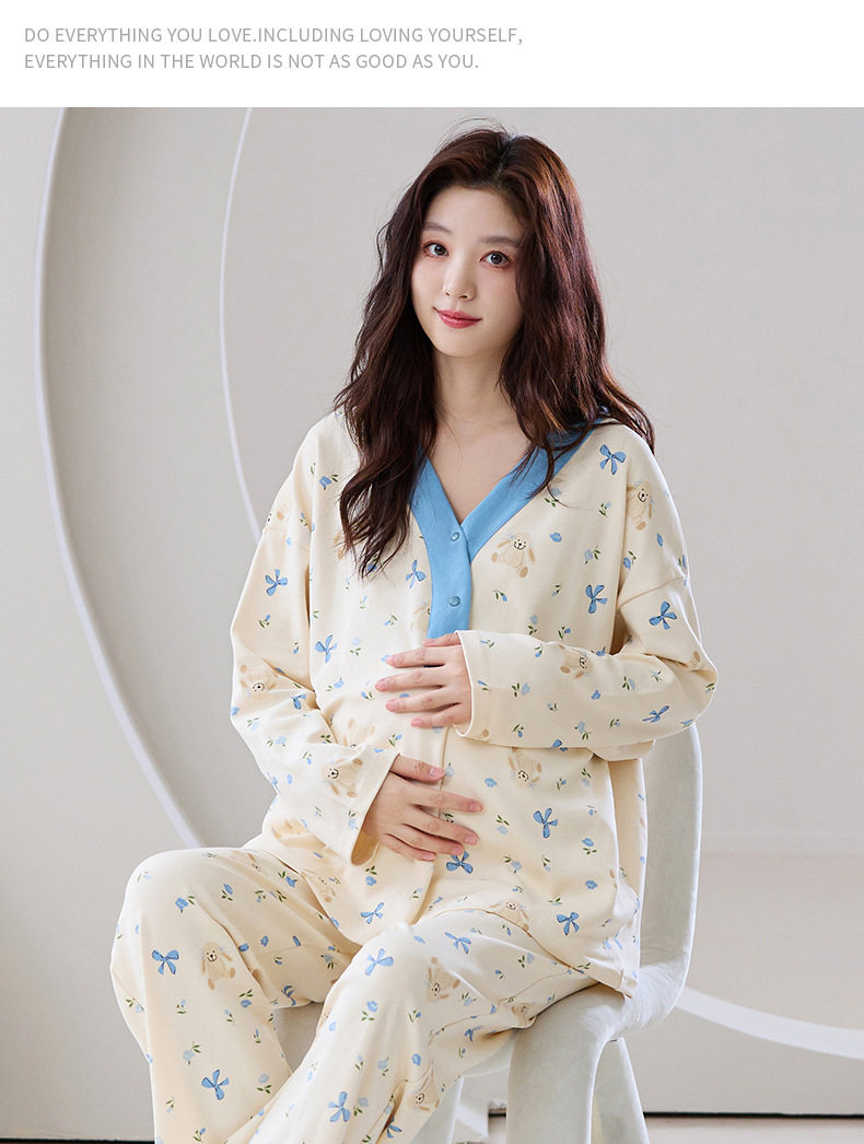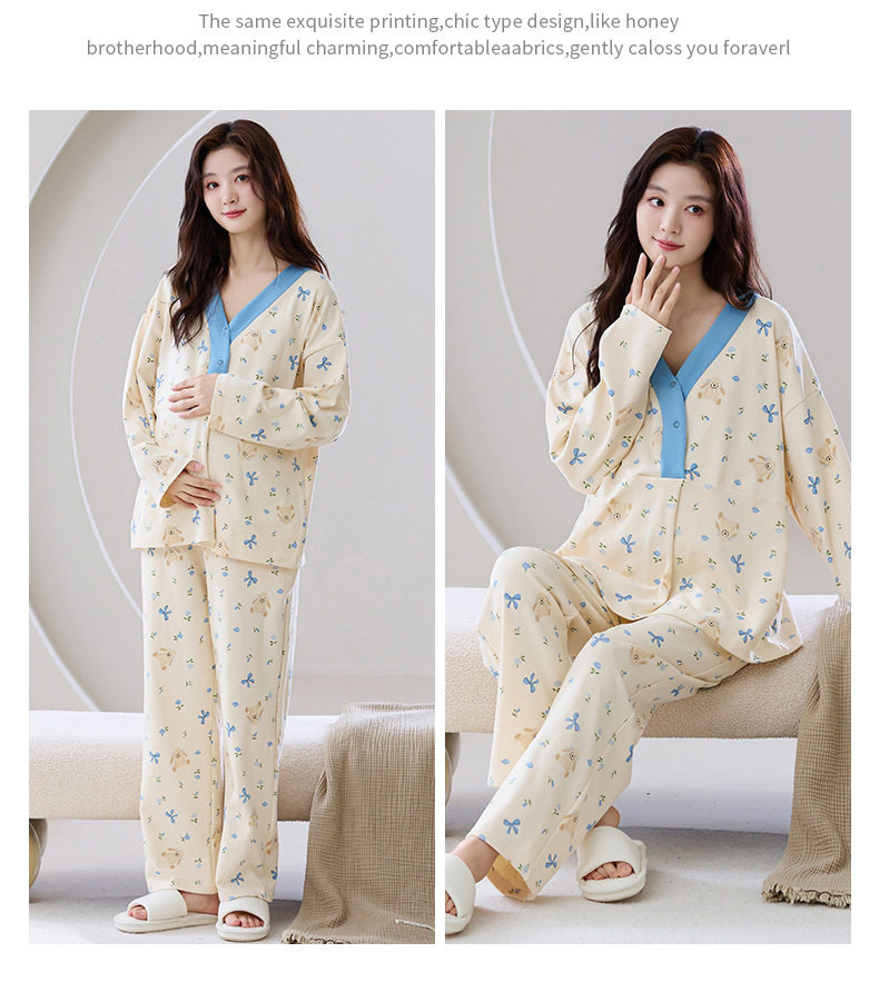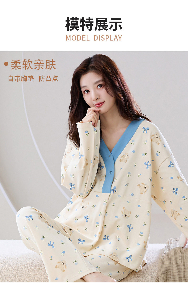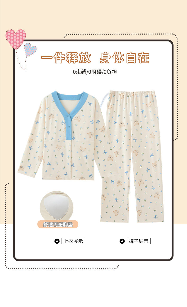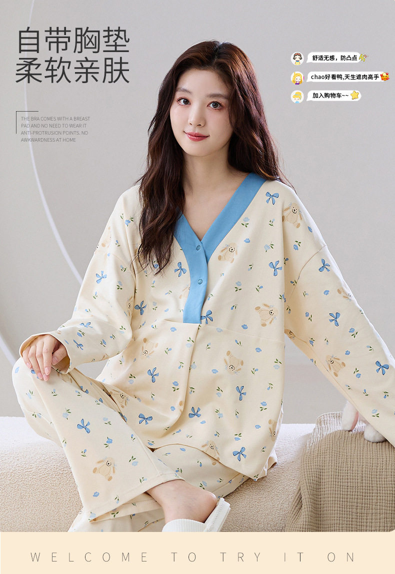 Long-Sleeved Confinement Clothes with Breast Pads, Pajamas for Women, Autum Postpartum Maternity Home Clothes, Breastfeeding and Feeding Suits, Spring and Autum