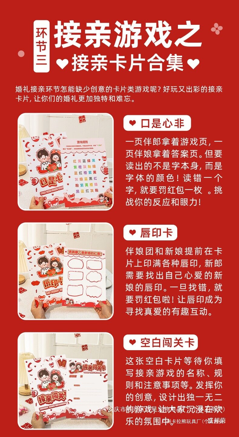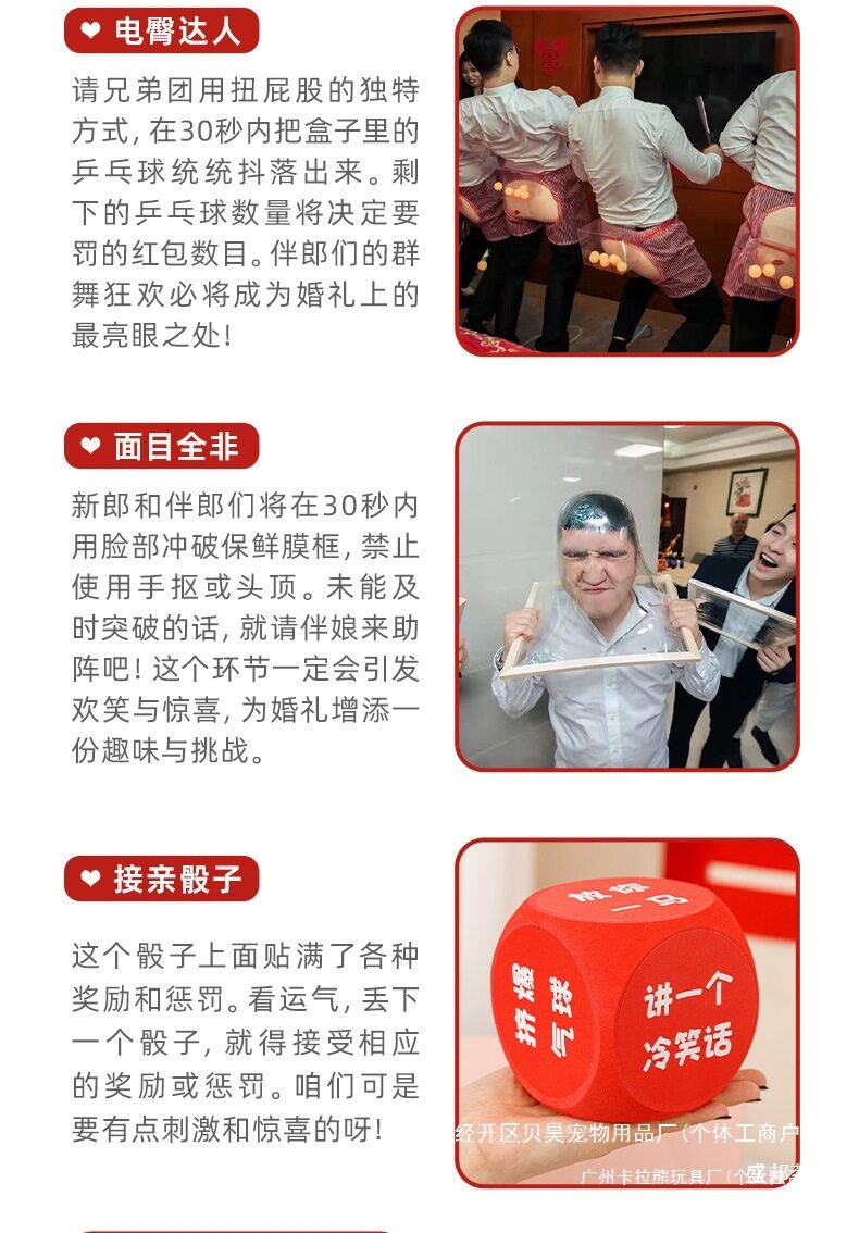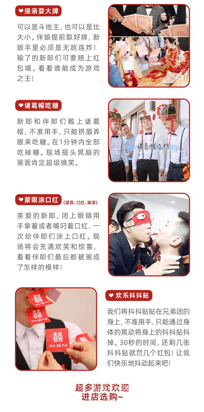 | Color | Pointing east and west - small finger stick,Booty babe - 10 standard ball set,Classic antler ring toss - 4 rings,Red antler ring toss - 4 color rings,Wedding vows book,Welcome the bride with open arms (includes a pack of "double happiness" charms),Play,My family has a happy gun + 100 banknotes,(everyone is buying) my family has a happy gun + 100 banknotes + 5 happy chopsticks,100 wedding notes refill pack,Disobedient floral pants,Zhuge liang's hat eats candy,Pick up the pot - 10 arrows,Dinosaur ball gun-cartoon version,Challenge 520 hand ball set (excluding gun),White wedding movie pattern 1 (good atmosphere),Dark blue 3 radish squats (highly recommended for new products),Sky blue, 6 squats with a carrot,Blindfolded mahjong - wife, i love you,Welcome the bride with rolling joy - today's celebration!,Welcome the bride with style - floral edition,Dark brown with facial features,Transparent stepping in place + happy eye mask,Khaki happy shake stickers 1 pack,Pass the straw,Internet celebrity hit me duck,Lion dance teething toy,Frog balance tree,Dark khaki color (recommended for new models) white set of 1 large goose + ferrule,Blue (new model recommended) yellow set of 1 duck + ring,1 set of 20 beads (1 plate + 2 cups + 2 chopsticks),Navy blue inflatable microphone,Purple red bowling ball,Milky white horn hat,3 brown small red wedding hammers,Lake blue to pick up the bride,Ping pong backgammon - 2 boards + 30 balls set,1 bubble machine,Coke stickers-6 sets of rings,6 door stickers for civilized and wise marriage,Sisters don’t block the door 6 stickers,Happy reunion diy scratch card,Marriage guarantee,Quick questions and answers,Say one thing but do another,4 tongue twisters,Emoji guessing idioms,Photo pose card,Lip print card,6 blank level sheets,Pick up the test paper,10 scratch-off tickets for picking up relatives,Flaring tool,Love candle + expander,Flaring tool x 1,Cartoon pvc guarantee letter (26*38cm),Cartoon style good news,Retro style good news,Pickup calendar,1 photo of family vision chart,Eye chart i’m getting married + finger stick,Pointing east and west-large finger stick,Pointing east and west-plush gloves,Magnetic style to connect with huarong road,10cm wedding dice - single,Bootylicious babe - 15 ball edition,30 happy balls (bring your own chessboard),Dark purple large pirate barrel,Chocolate color groomsmen fan,Camel prince glasses 1 piece,Brown cat-eye glasses 1 piece,Emerald green wedding headband 1,Dark green punishment mace 1,Fluorescent green, happy hammer,Cyan happy word puzzle,Green hardened acupressure board 1 piece,Light green acupressure board stepping on balloons,Army green acupressure board jump rope,Bright yellow large screaming chicken 1,Champagne color love puzzle,Lemon yellow dan dan chess,Gold unrecognizable frame,Fluorescent yellow 20 pictures in a hurry,Ginger rabbit headband swan skirt,1 apricot grass skirt,Yellow bell shoe box,Light yellow ferrules 6 pieces,Orange goose set for picking up the bride (excluding ring),Orange red door-blocking red envelopes 36 pieces,Lotus color large paper dragon 1,Watermelon red koi goldfish lamp 1,Rose red lion lantern 1,1 burgundy 20cm happy lantern,8 red fireworks guns,Pink push push music 4 pieces,Black wedding gashapon machine-10 balls,Gray dice 1,Silver blindfolded lips,Dark gray imitation pink panther,Light gray violent leg hair stickers,Off-white blindfolded touching objects |