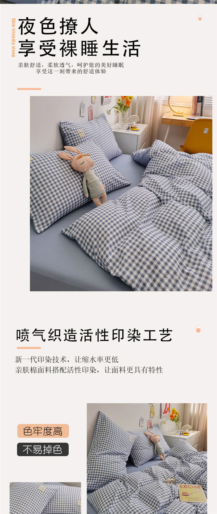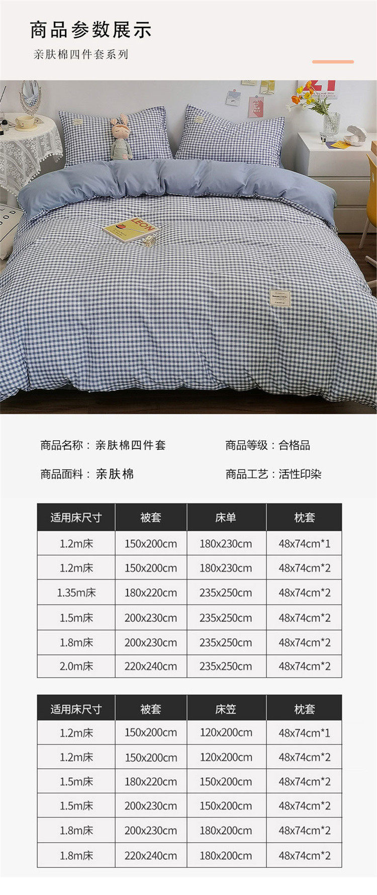 | Size specifications | 1.2m bed sheet three-piece set (quilt cover 150x200cm),1.2m bed sheet four-piece set (quilt cover 150x200cm),1.5m bed sheet four-piece set (quilt cover 150x200cm),1.5m bed sheet four-piece set (quilt cover 180x220cm),1.5m bed sheet four-piece set (quilt cover 200x230cm),1.8m bed sheet four-piece set (quilt cover 200x230cm),2.0m bed sheet four-piece set (quilt cover 220x240cm),1.2m fitted sheet three-piece set (quilt cover 150x200),1.2m fitted sheet set of four (quilt cover 150x200),1.5m fitted sheet set of four (quilt cover 180x220),1.5m fitted sheet set of four (quilt cover 200x230),1.8m fitted sheet set of four (quilt cover 200x230),1.8m fitted sheet set of four (quilt cover 220x240),Small bed sheets (180230cm),Queen size bed sheets (235250cm),1.2m single fitted sheet,1.5m single fitted sheet,1.8m single fitted sheet |