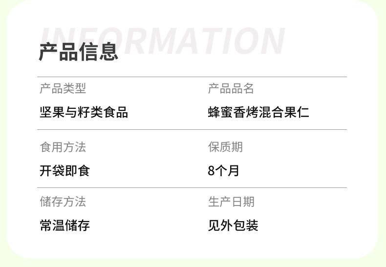 | Packaging specifications | 80g honey roasted mixed nuts |