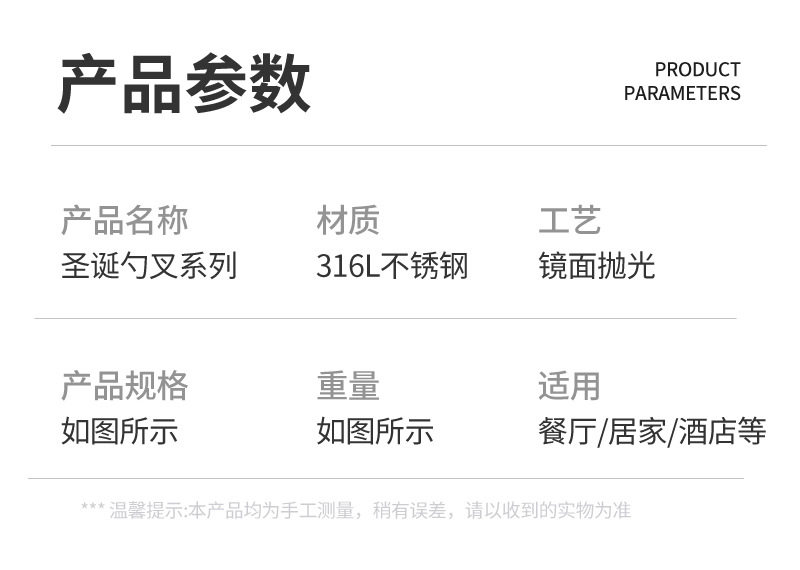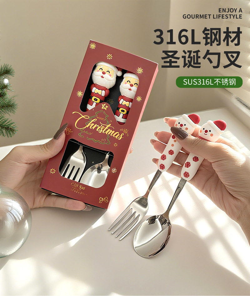 | Specifications | [316l four-piece red box set]-silver fork,[316l four-piece red box set]-silver spoon,[316l two-piece set] snowman,[316l two-piece set] santa claus,[316l two-piece set] elk,[316l two-piece set] christmas tree,[316l silver] santa spoon,[316l silver] santa claus fork,[316l silver] elk spoon,[316l silver] elk fork,[316l silver] snowman spoon,[316l silver] snowman fork,[316l silver] christmas tree spoon,[316l silver] christmas tree fork |