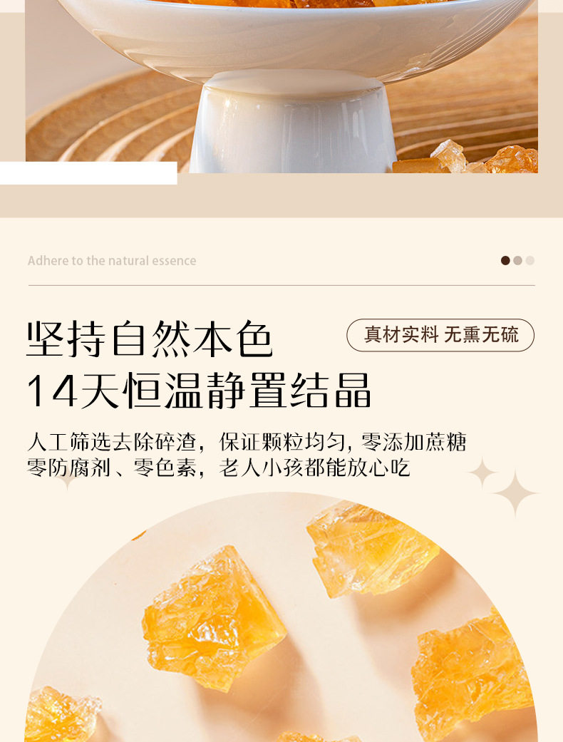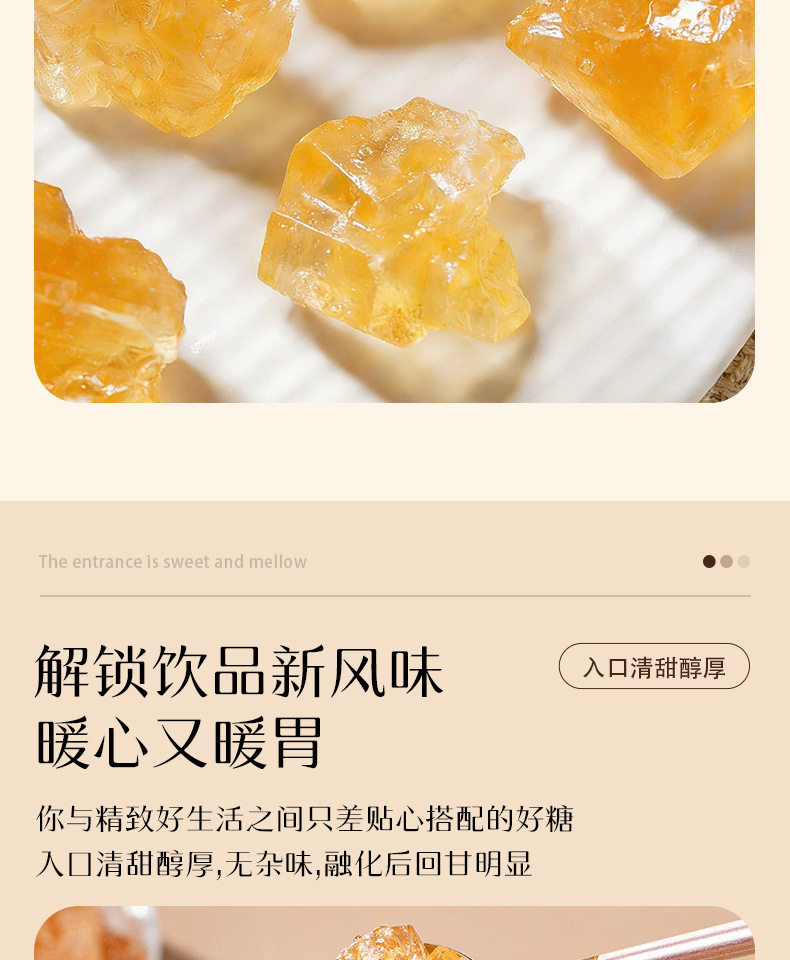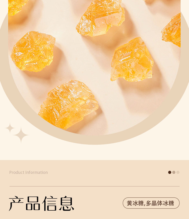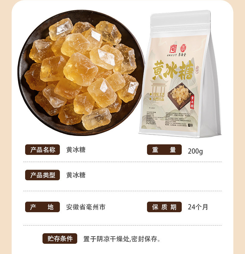 | Packaging specifications | Yellow rock sugar 50g*1 bag,Yellow rock sugar 200g*1 bag,Yellow rock sugar 400g*1 bag,Yellow rock sugar 150g*1 bottle,Yellow rock sugar 500g*1 bottle,Yellow rock sugar 1500g*1 bottle |