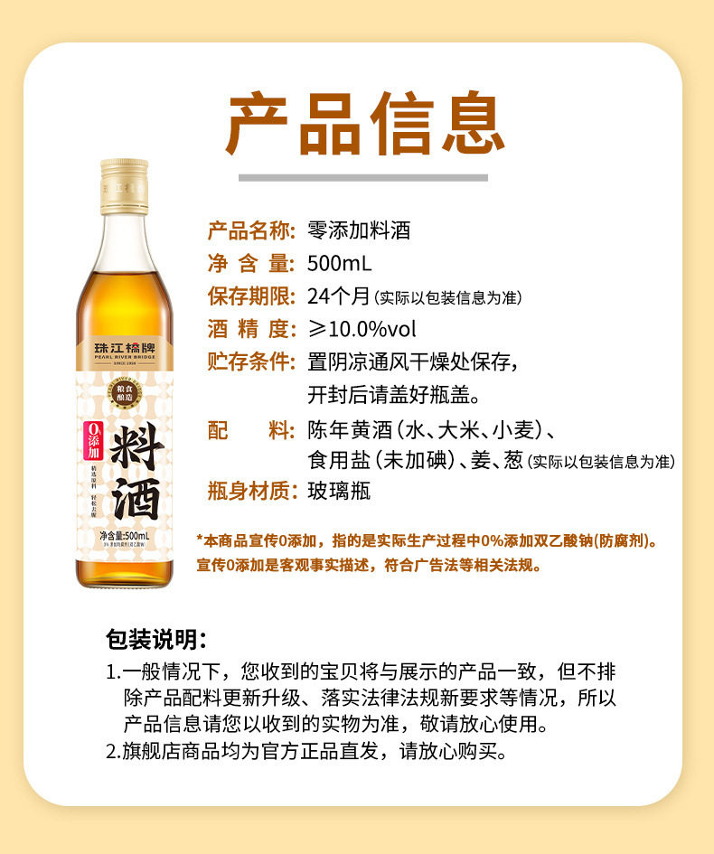| Packaging specifications | [brewing cooking wine] zero added cooking wine 500ml*1 bottle,[two bottles] zero-added cooking wine 500ml*2 bottles |