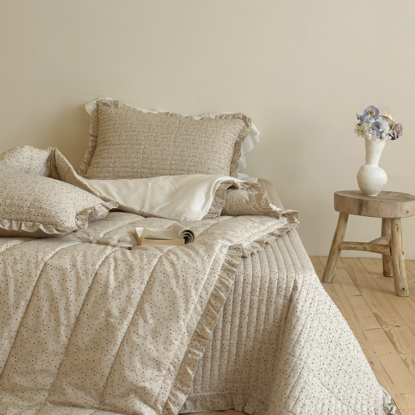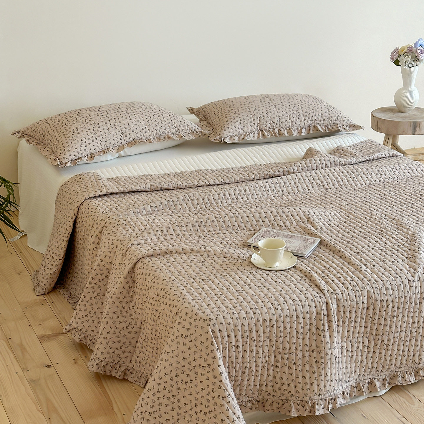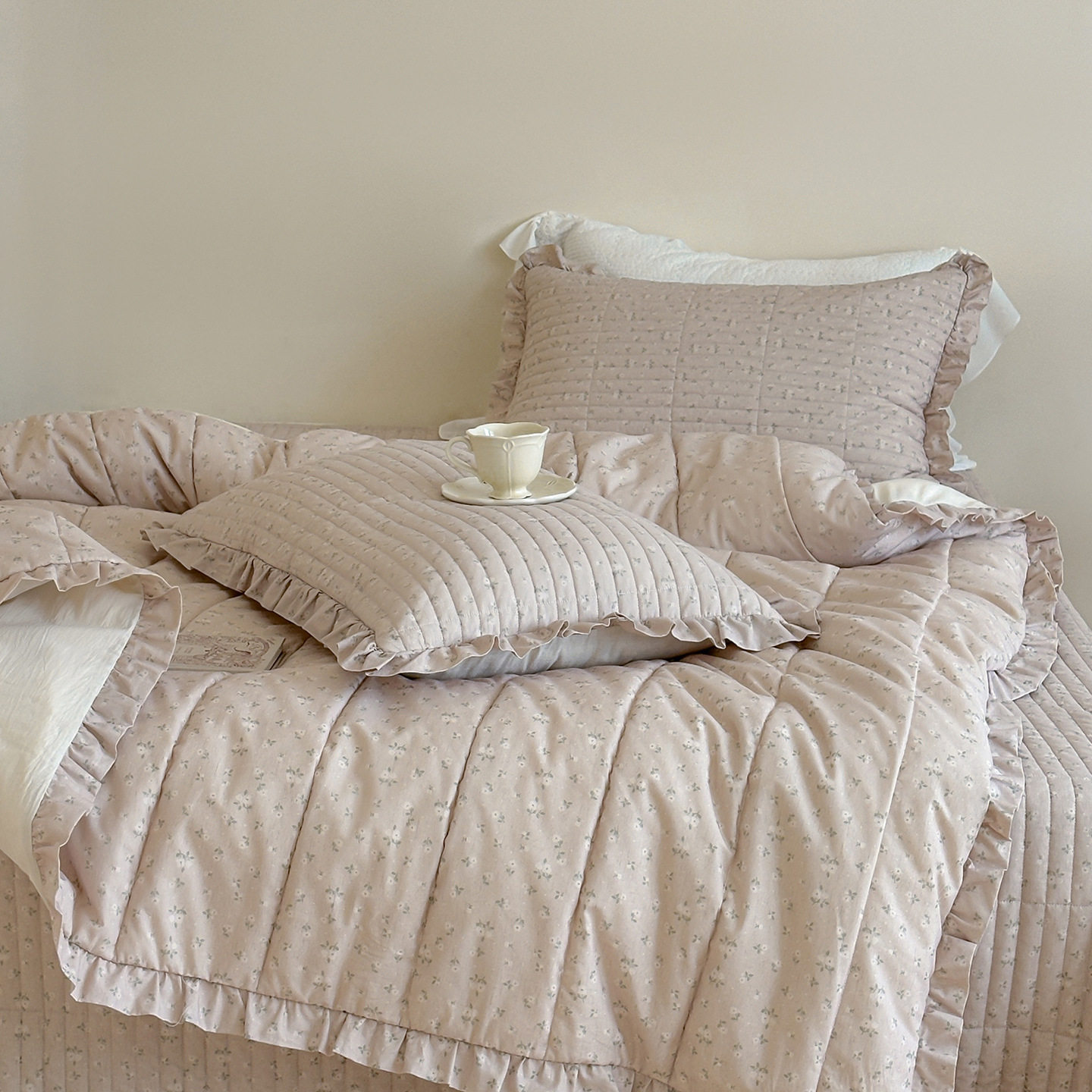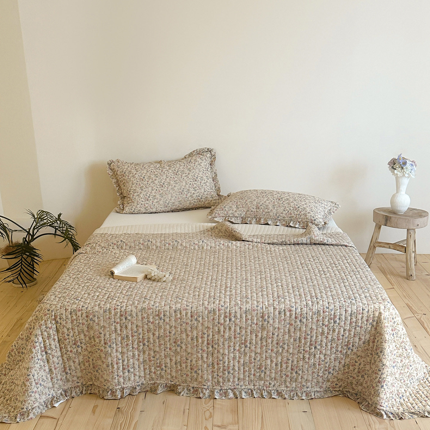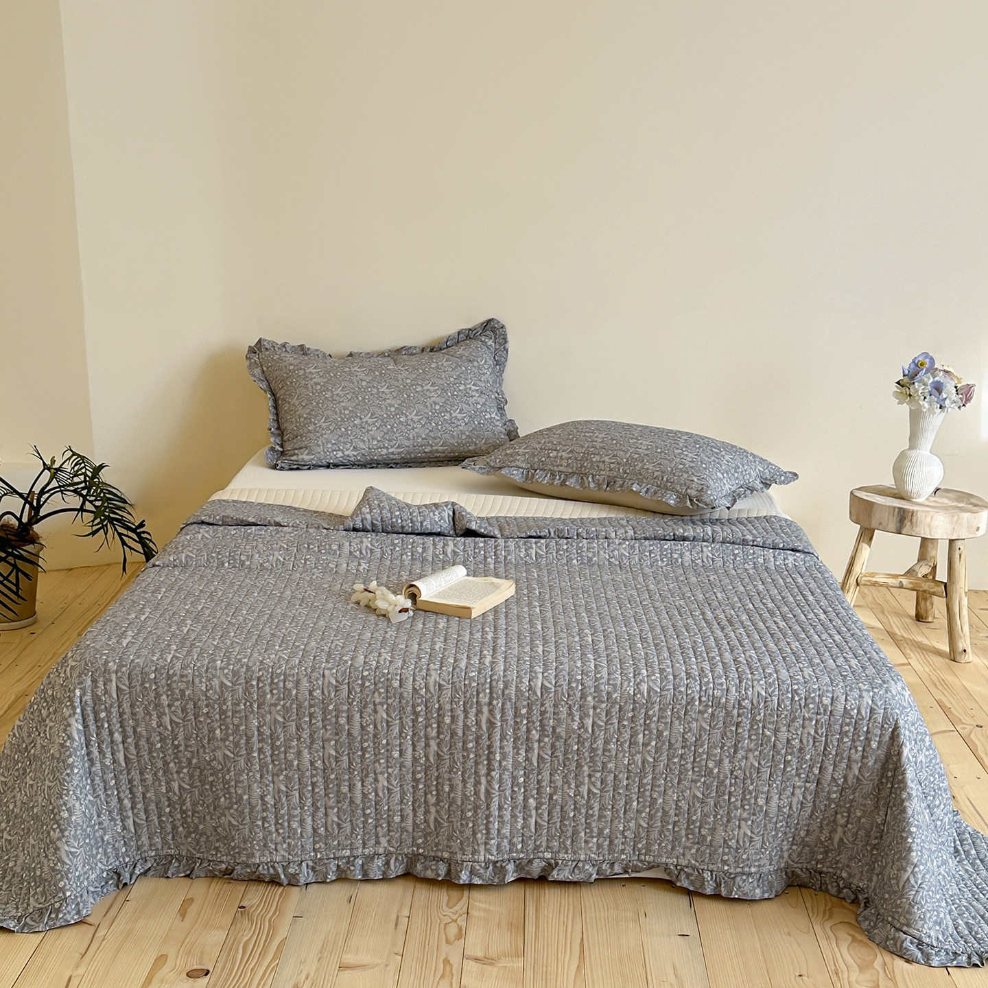 French Retro Style Cotton and Linen Bed Cover Three-Piece Set Floral Ruffle Multi-Functional Quilted Quilt Cover Four-Piece Bedding Set
