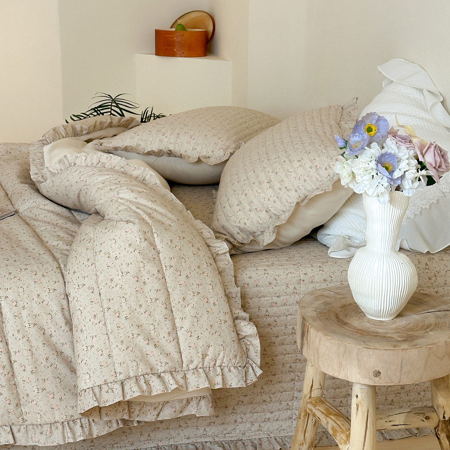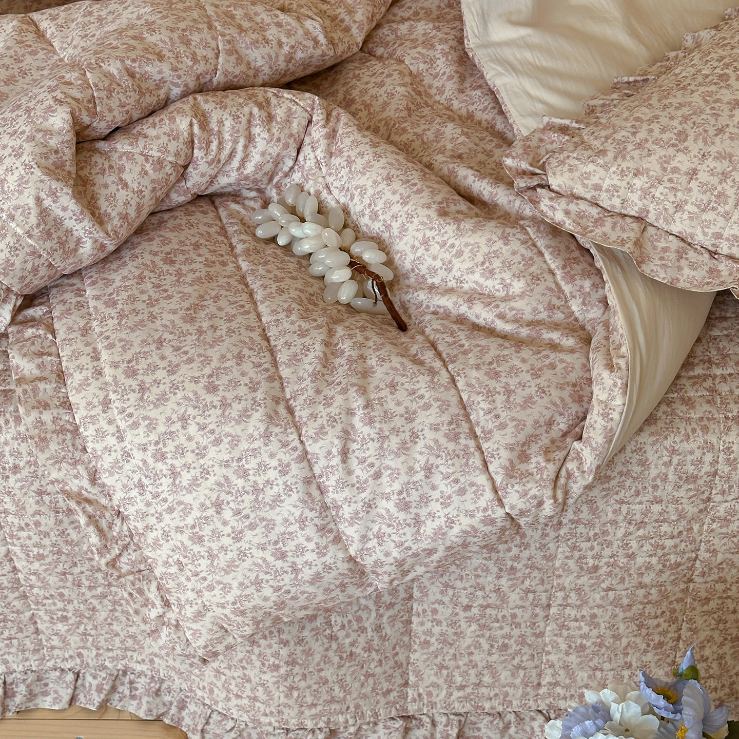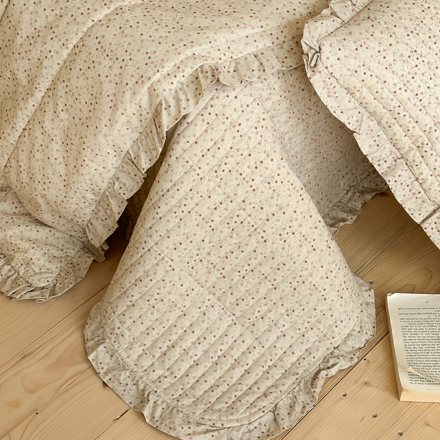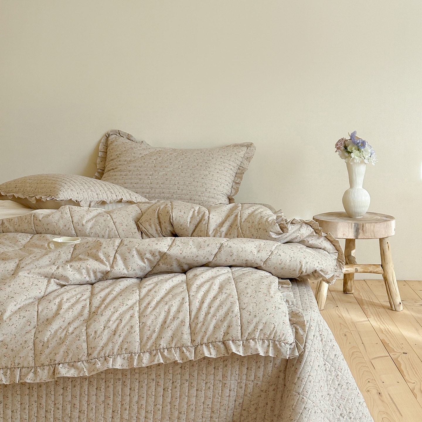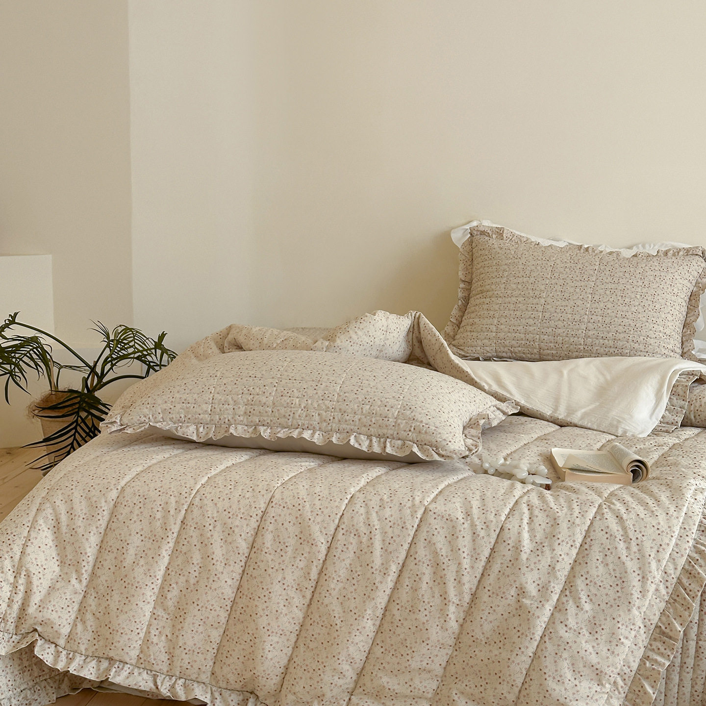 French Retro Style Cotton and Linen Bed Cover Three-Piece Set Floral Ruffle Multi-Functional Quilted Quilt Cover Four-Piece Bedding Set