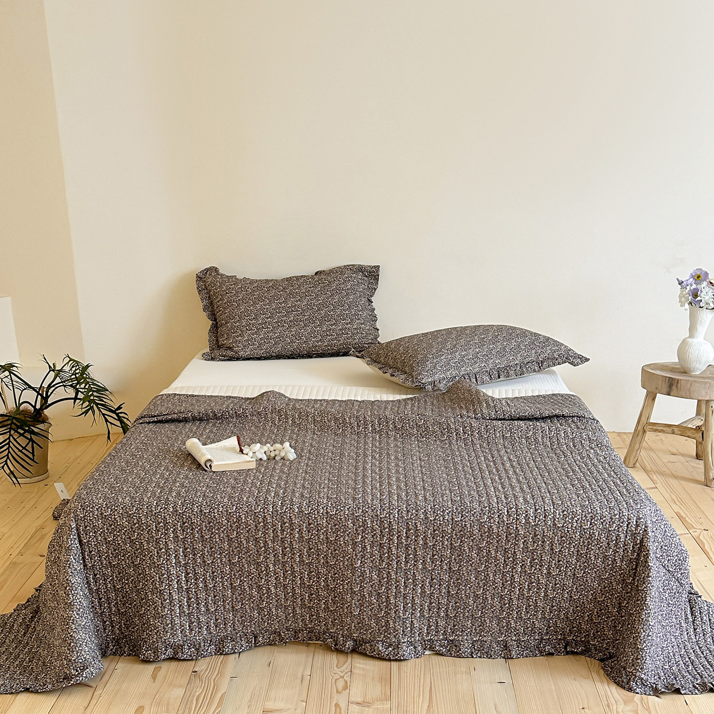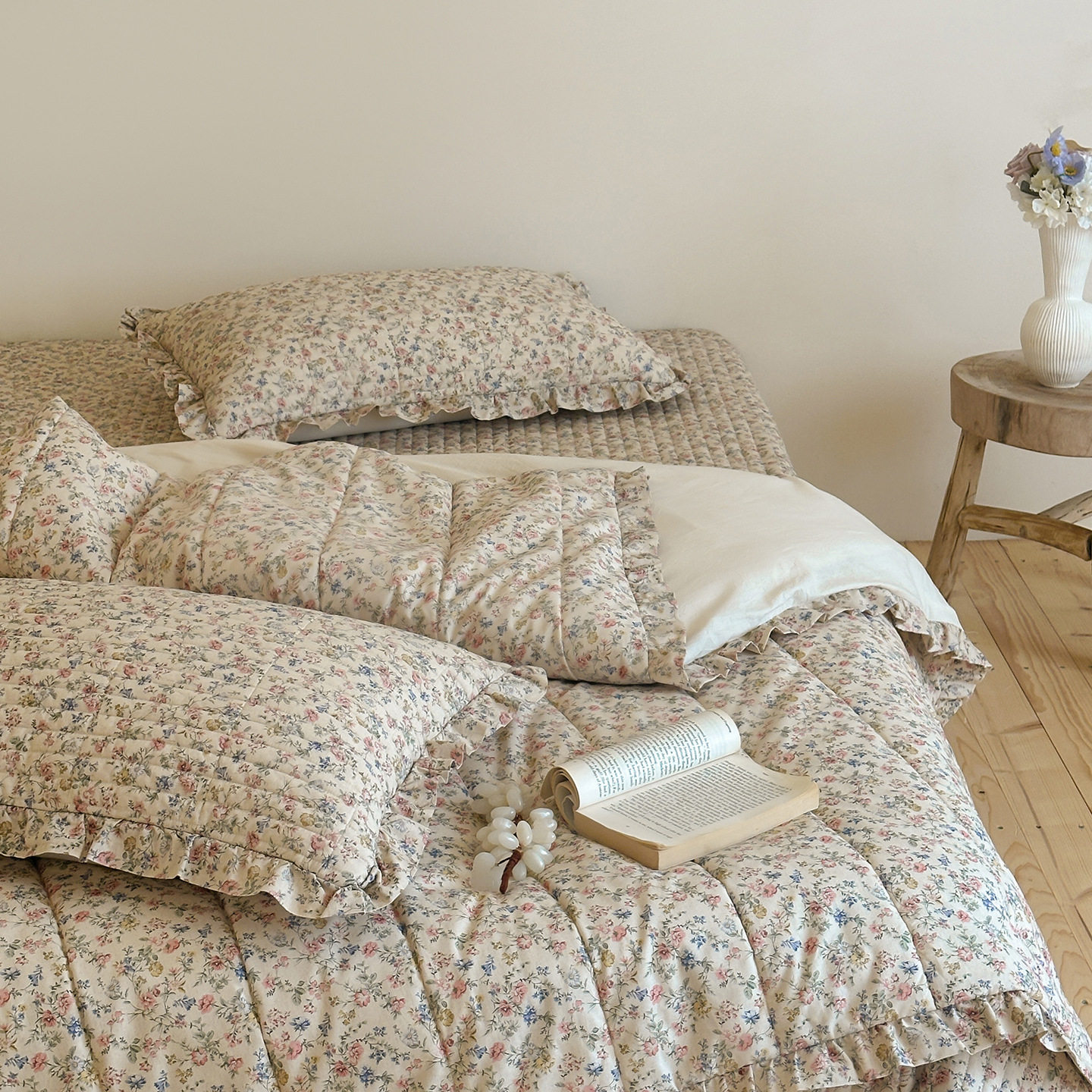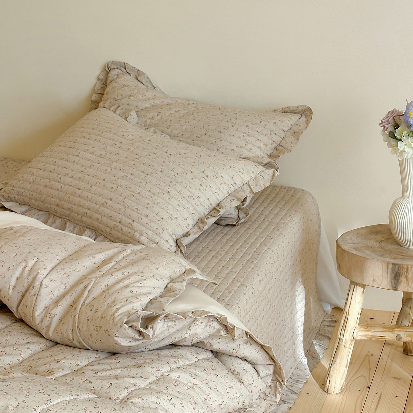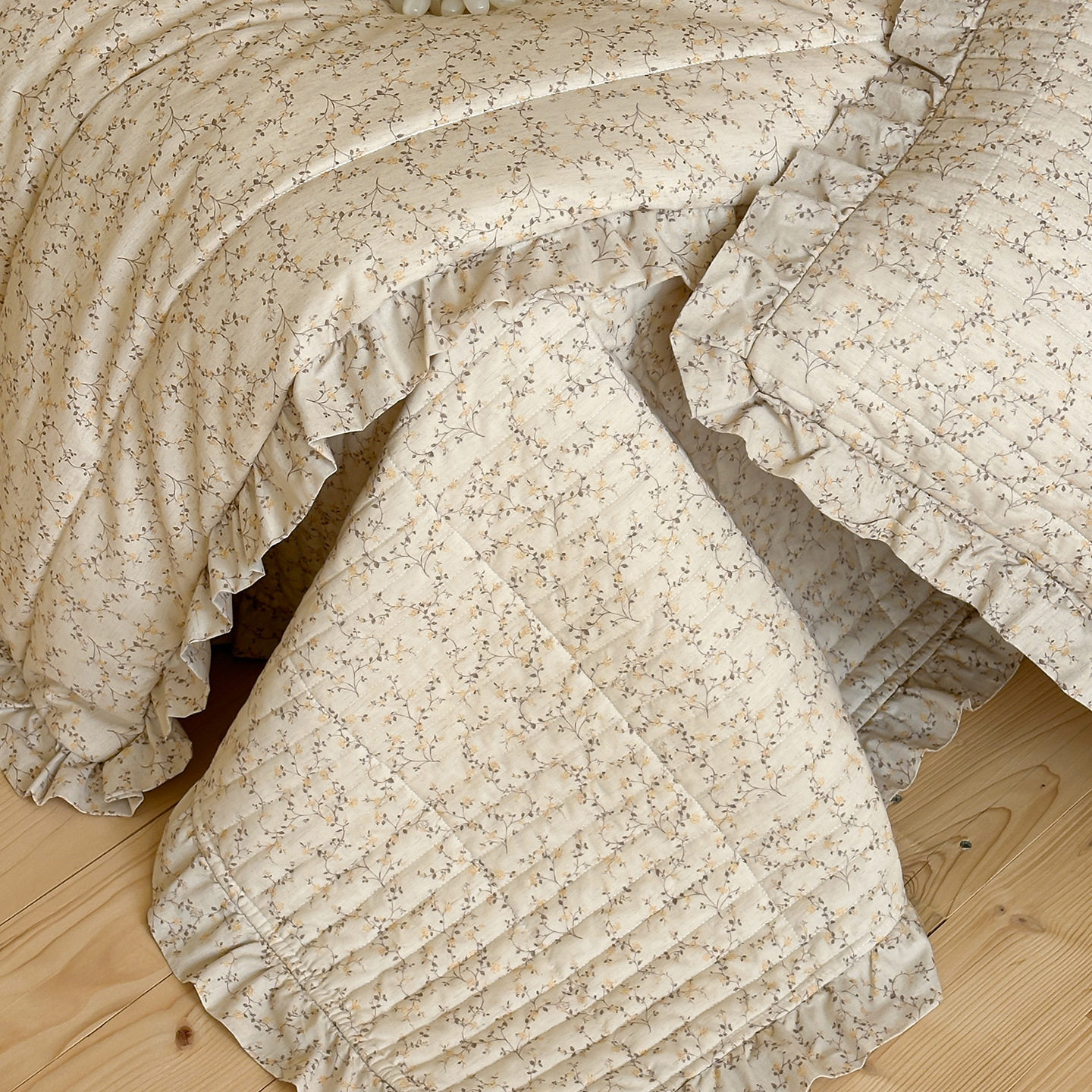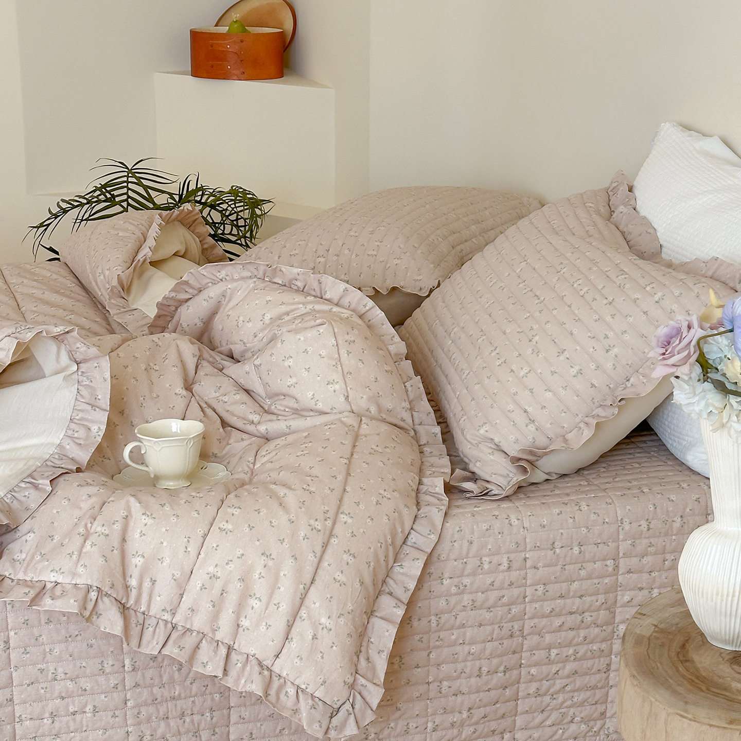 French Retro Style Cotton and Linen Bed Cover Three-Piece Set Floral Ruffle Multi-Functional Quilted Quilt Cover Four-Piece Bedding Set