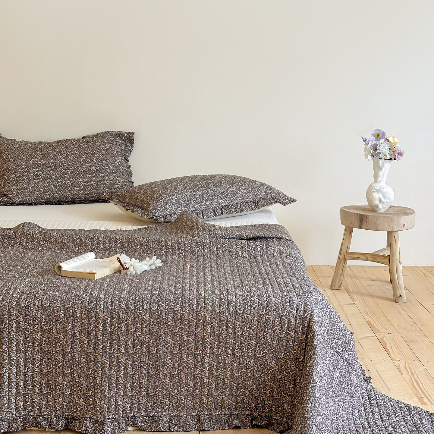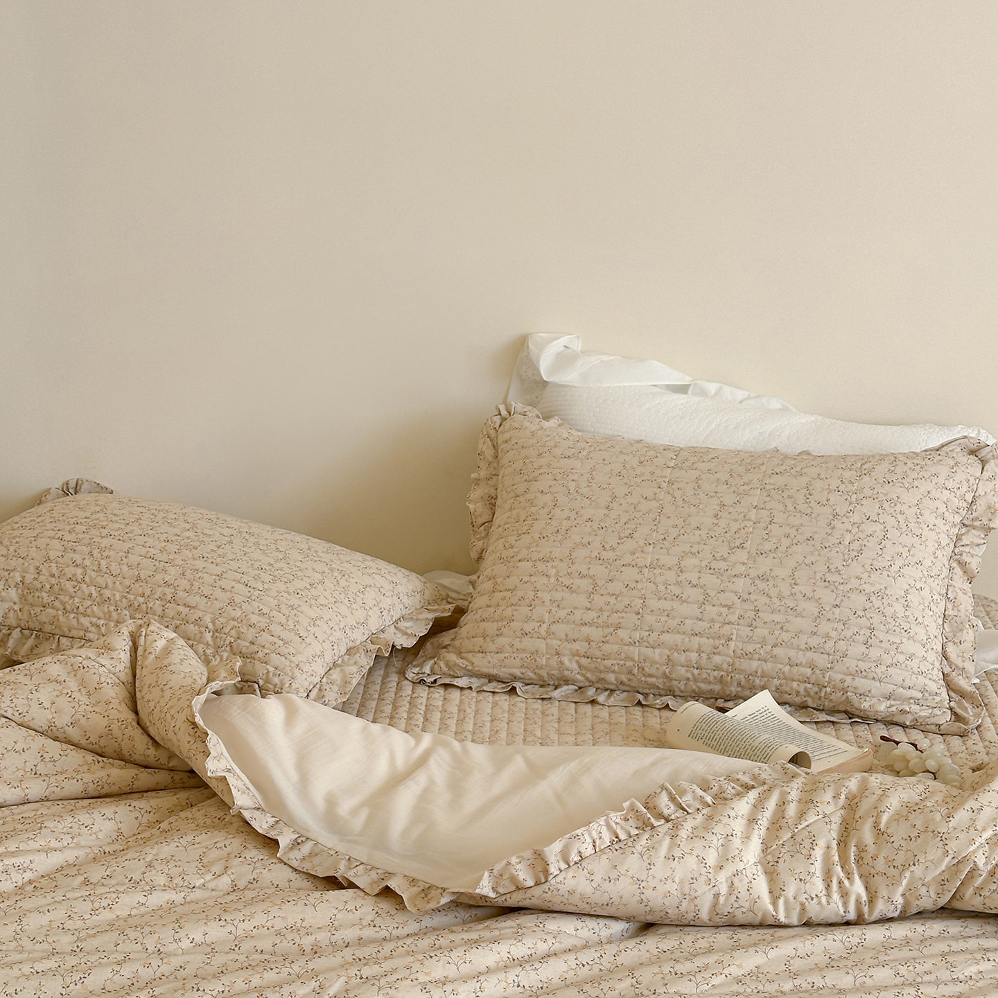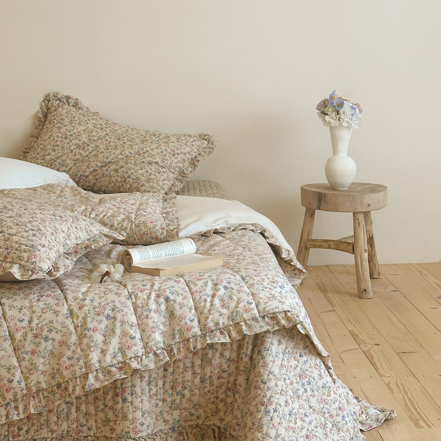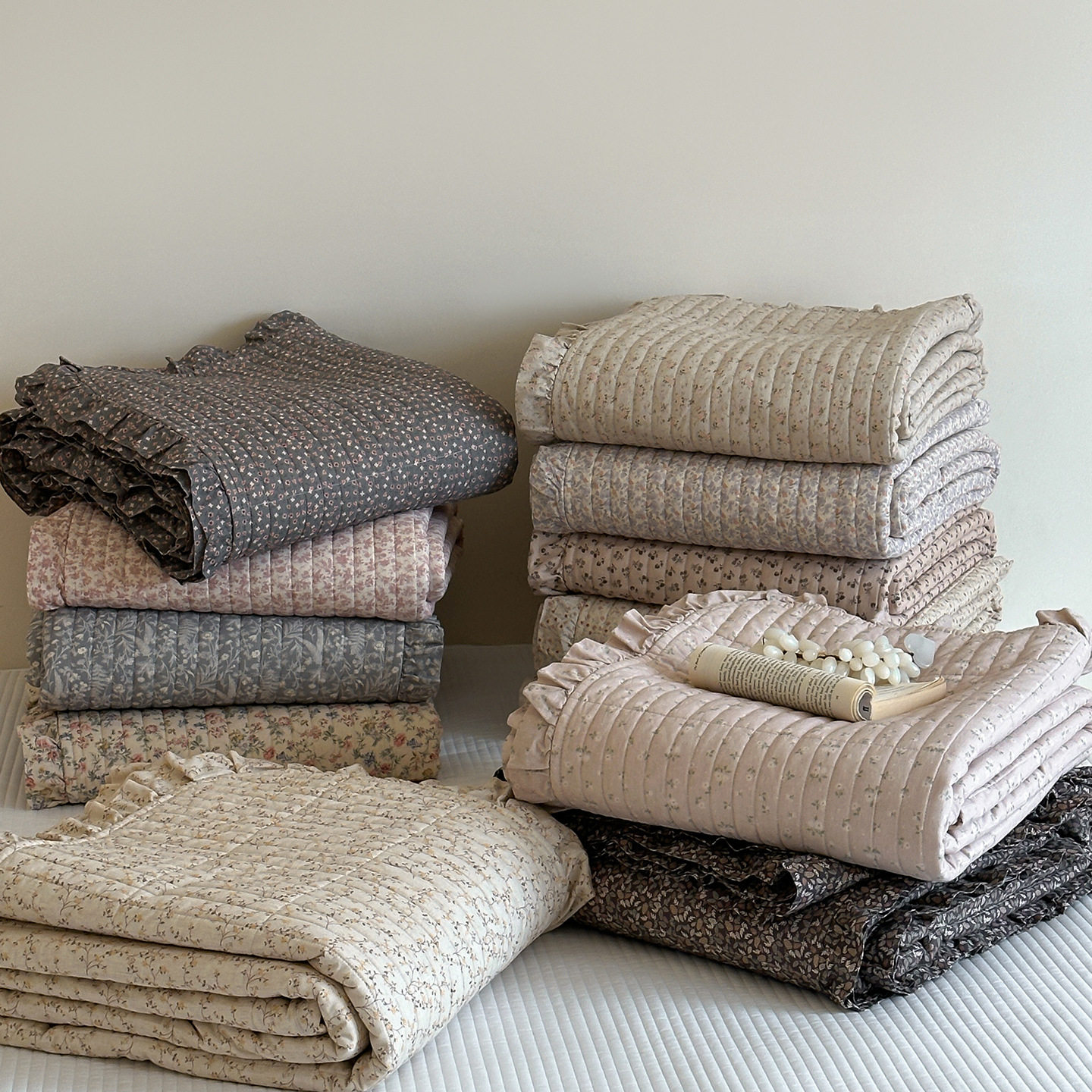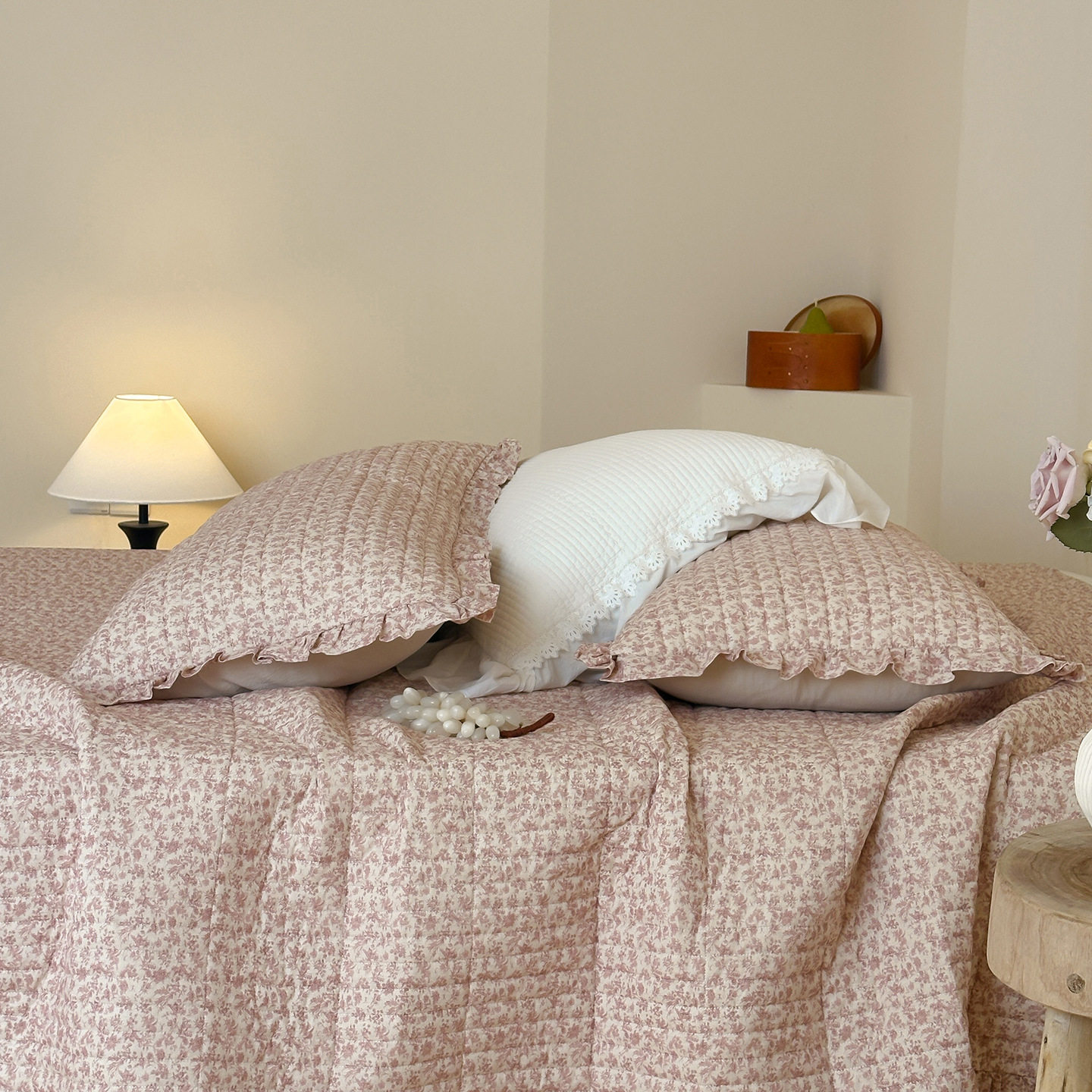 French Retro Style Cotton and Linen Bed Cover Three-Piece Set Floral Ruffle Multi-Functional Quilted Quilt Cover Four-Piece Bedding Set