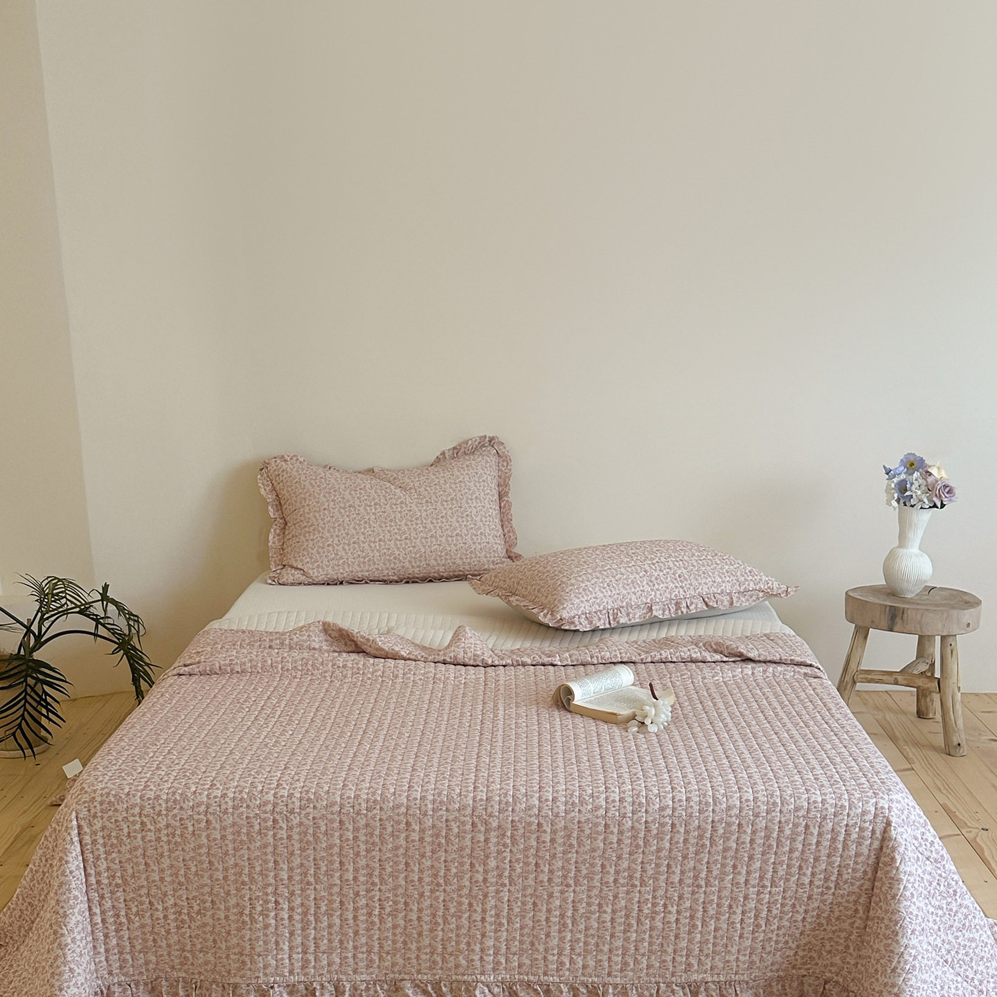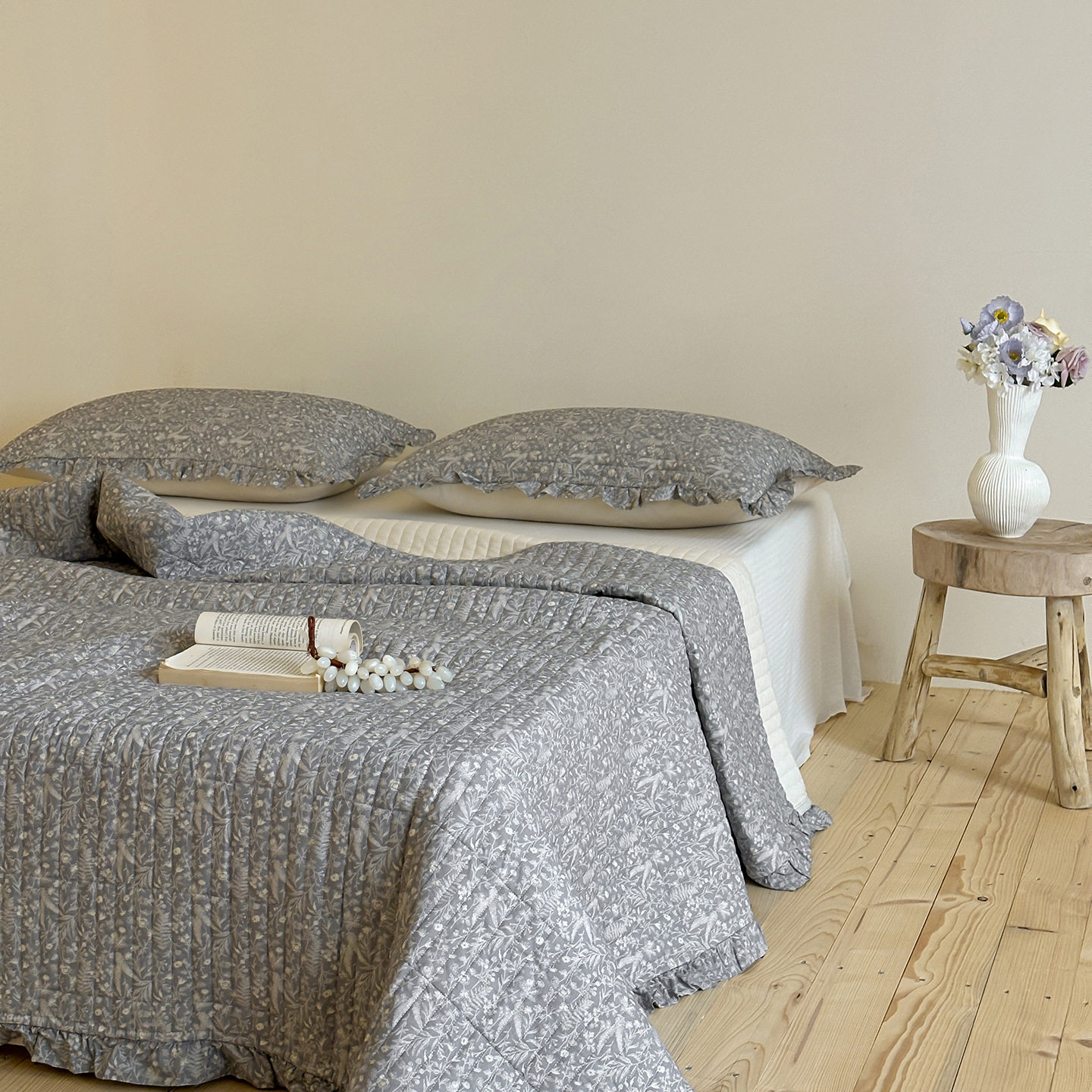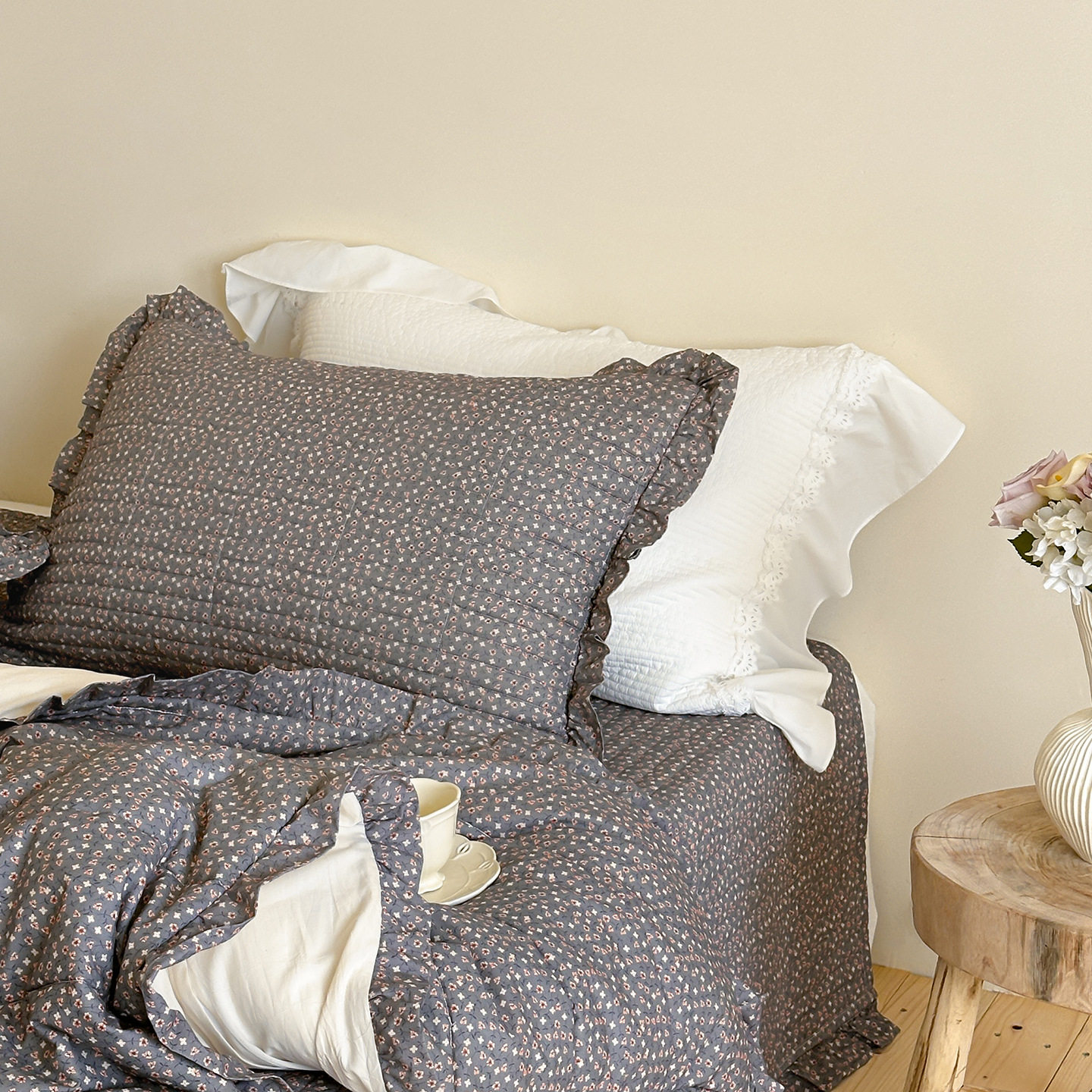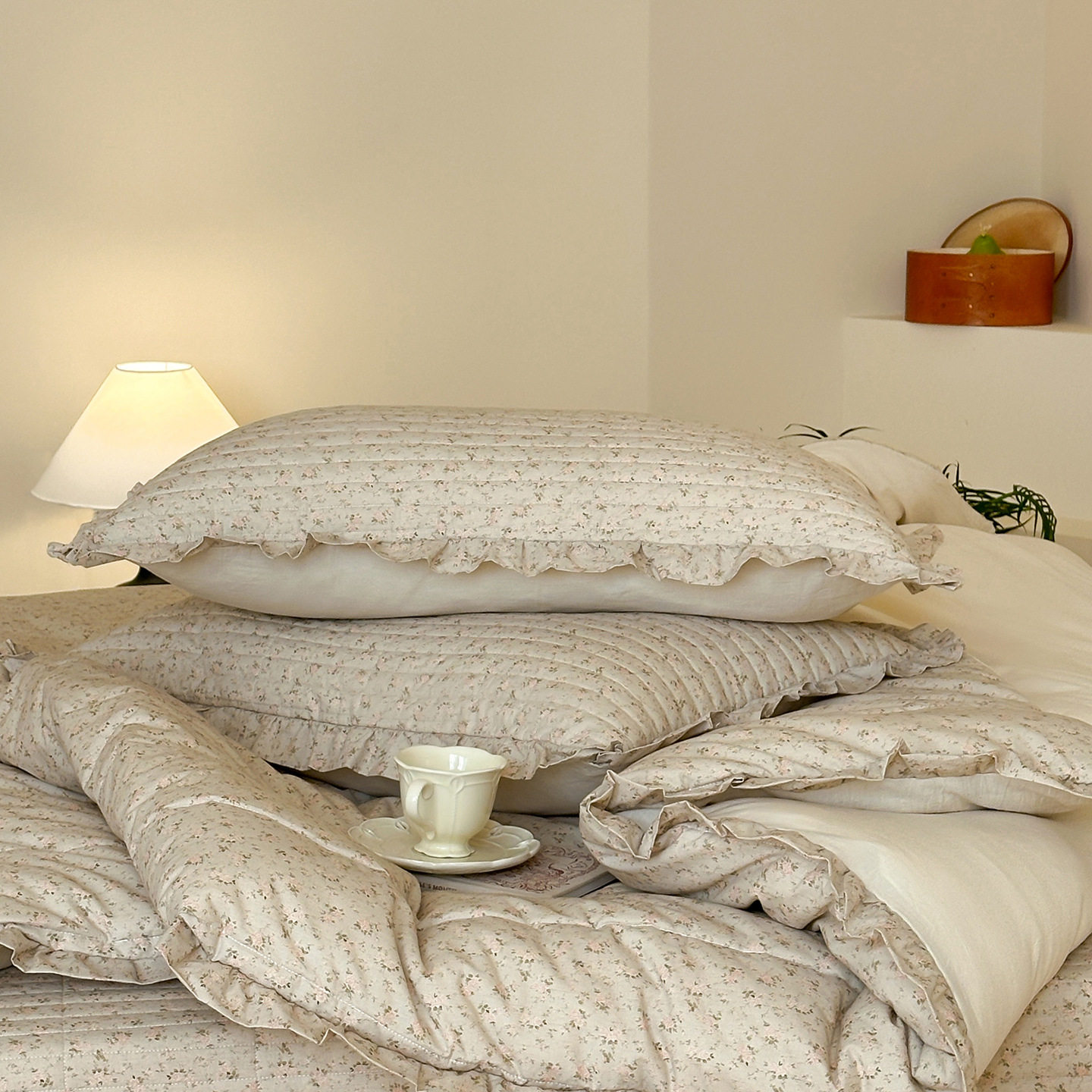 French Retro Style Cotton and Linen Bed Cover Three-Piece Set Floral Ruffle Multi-Functional Quilted Quilt Cover Four-Piece Bedding Set