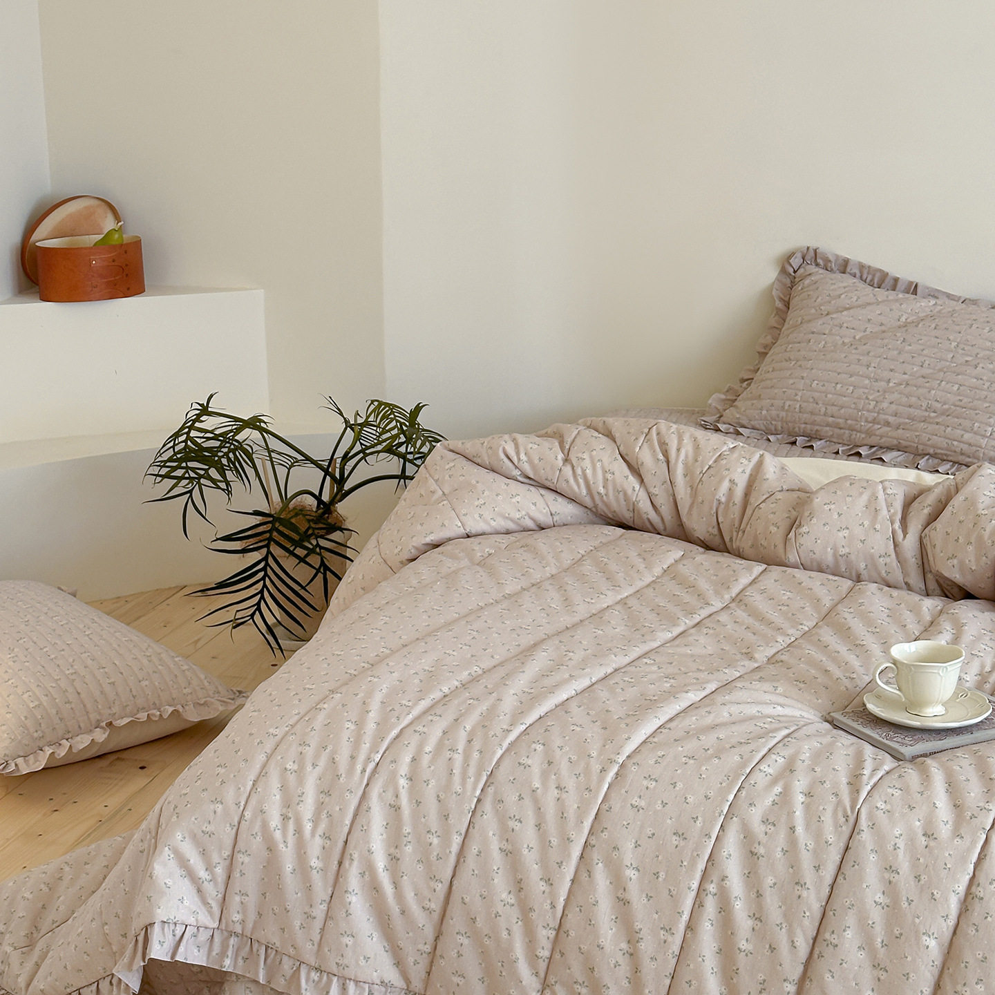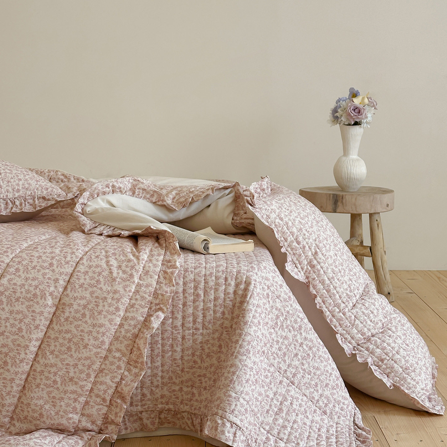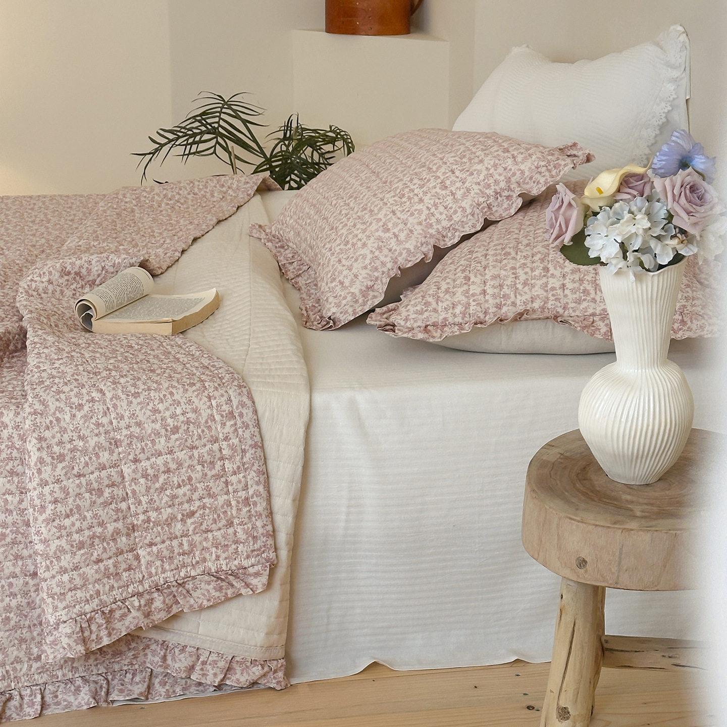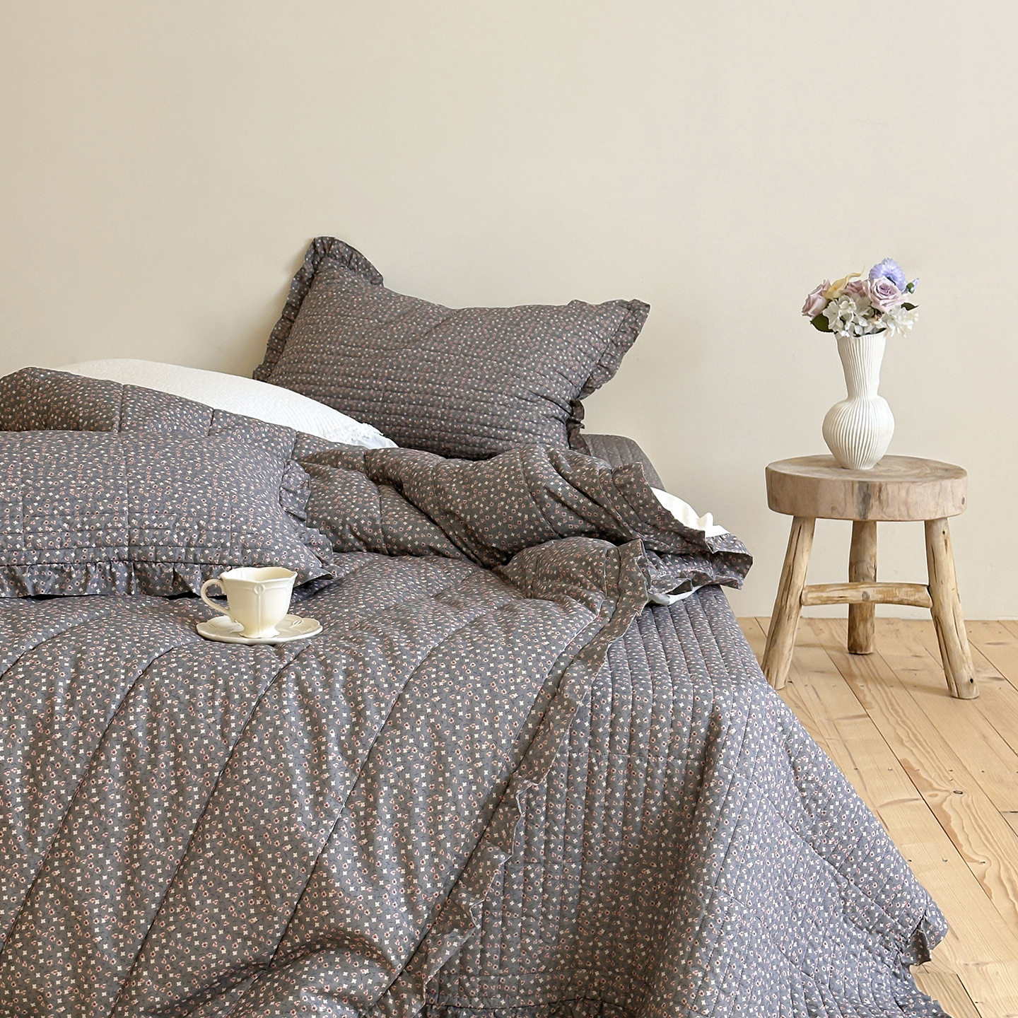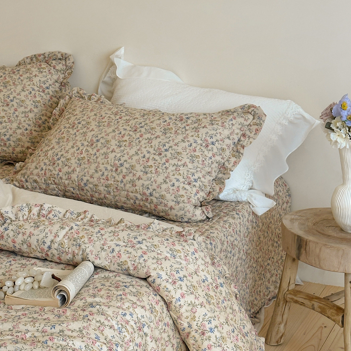 French Retro Style Cotton and Linen Bed Cover Three-Piece Set Floral Ruffle Multi-Functional Quilted Quilt Cover Four-Piece Bedding Set