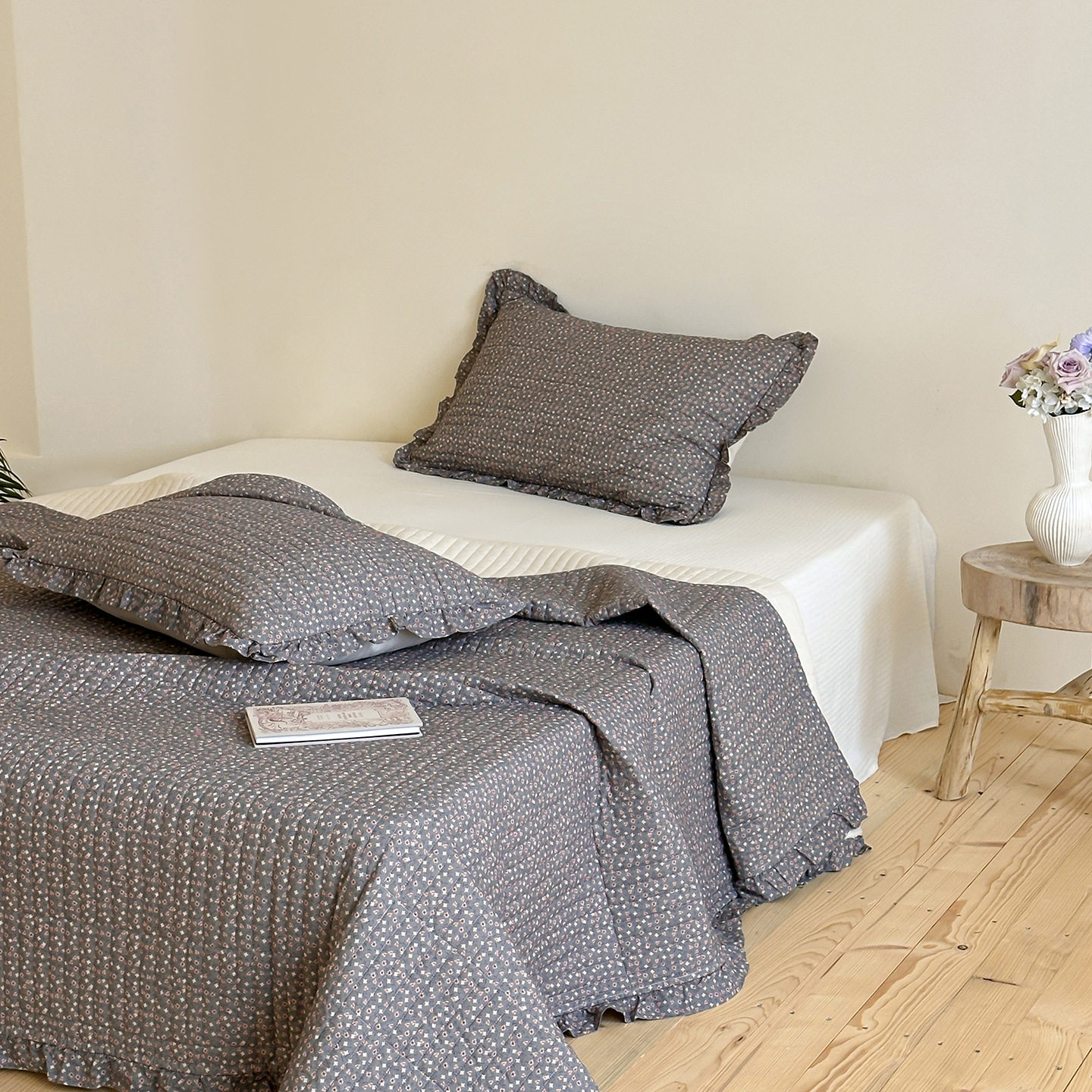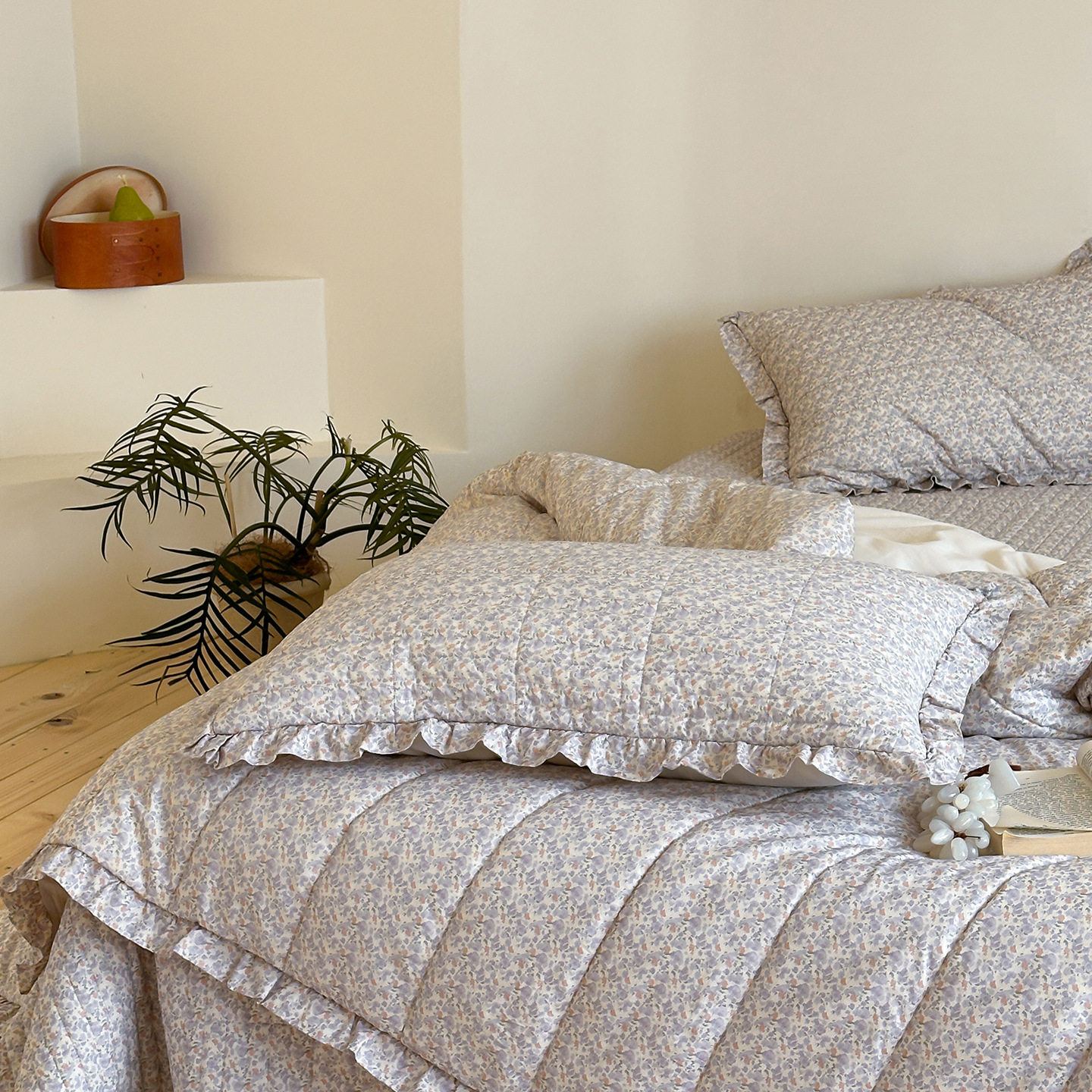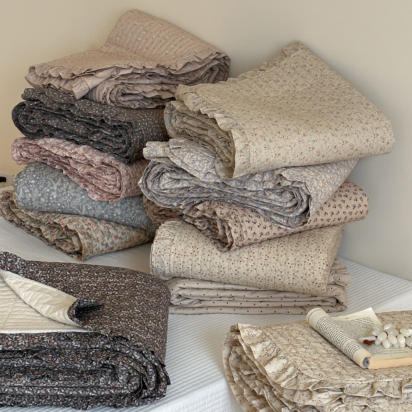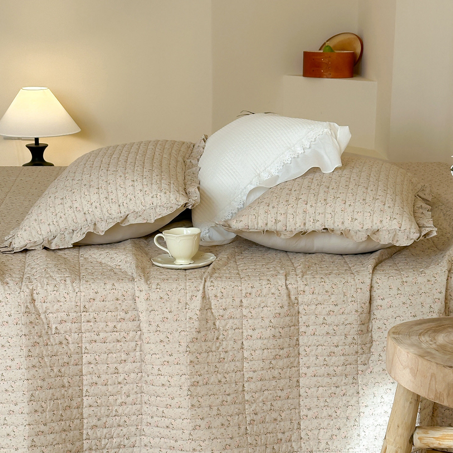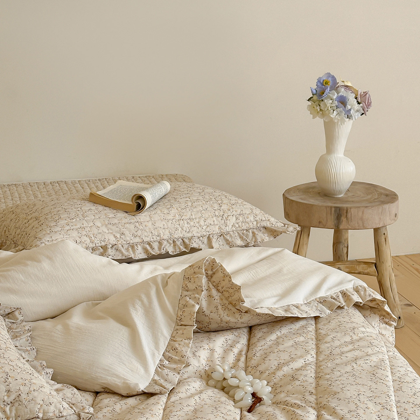 French Retro Style Cotton and Linen Bed Cover Three-Piece Set Floral Ruffle Multi-Functional Quilted Quilt Cover Four-Piece Bedding Set