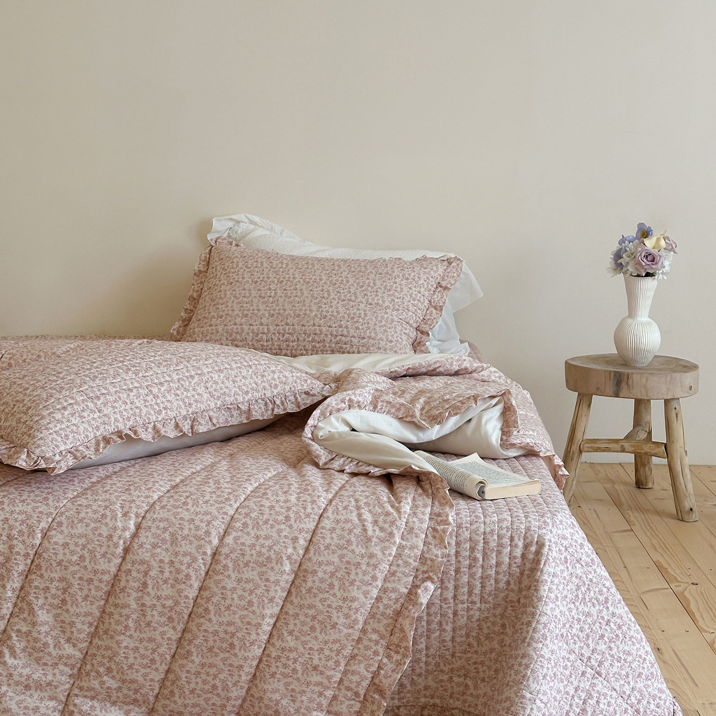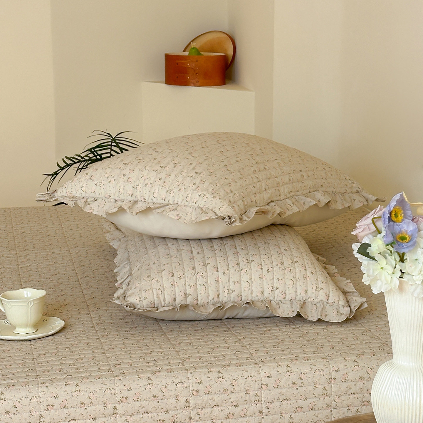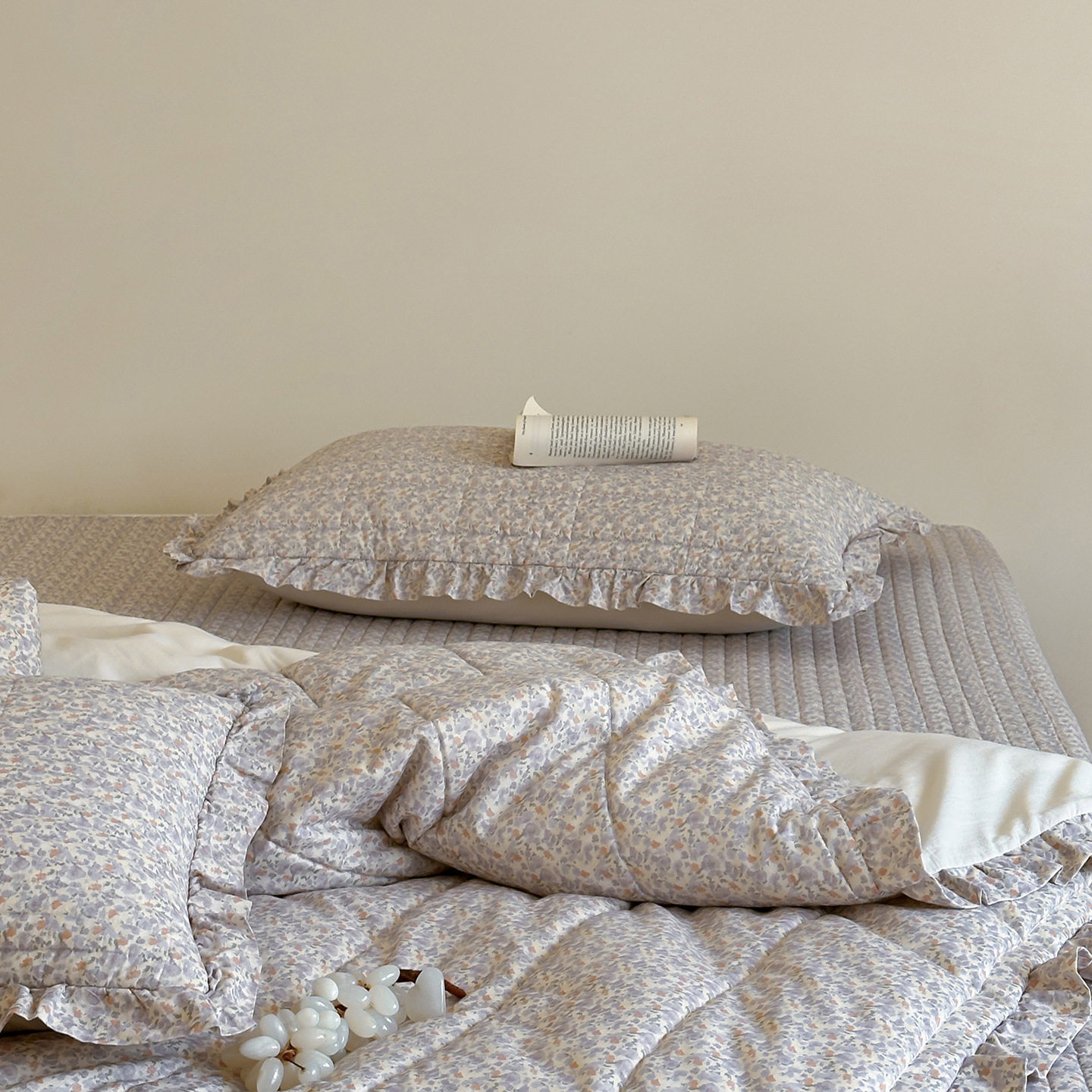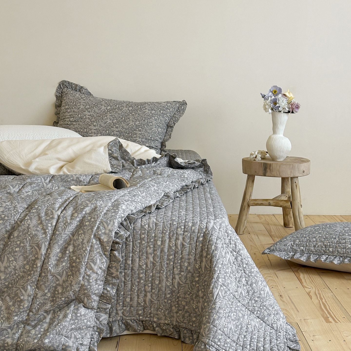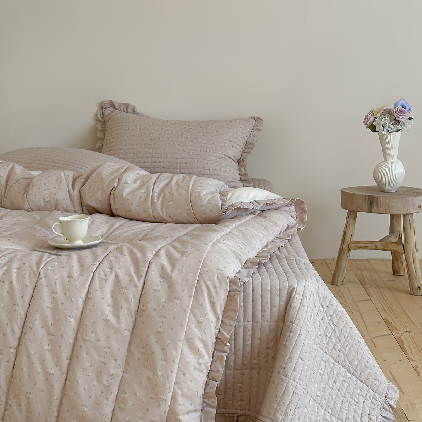 French Retro Style Cotton and Linen Bed Cover Three-Piece Set Floral Ruffle Multi-Functional Quilted Quilt Cover Four-Piece Bedding Set