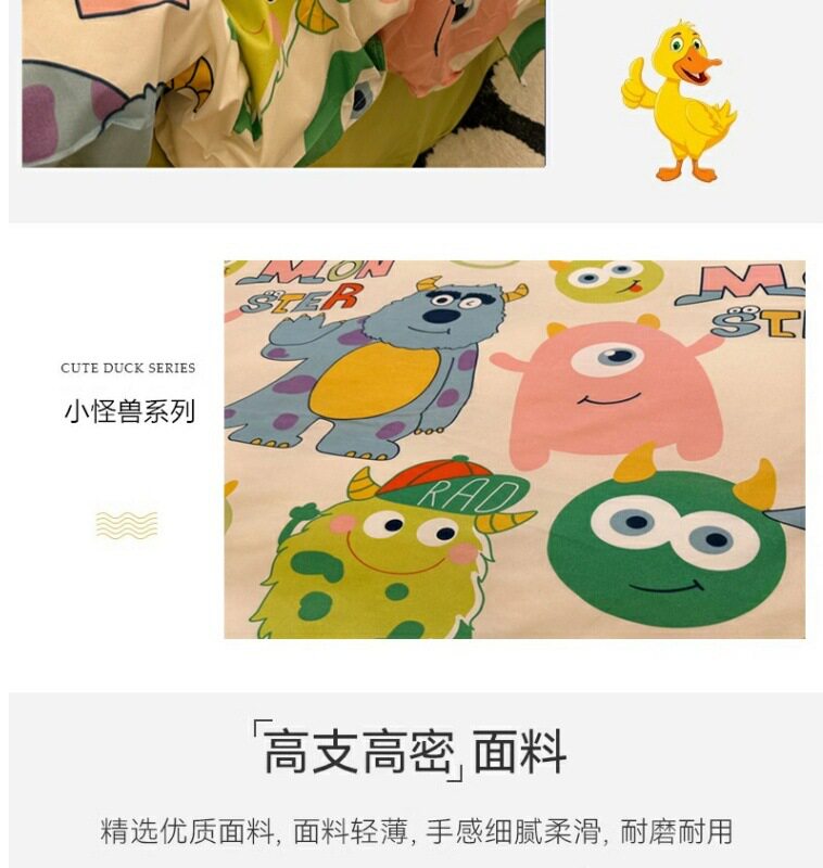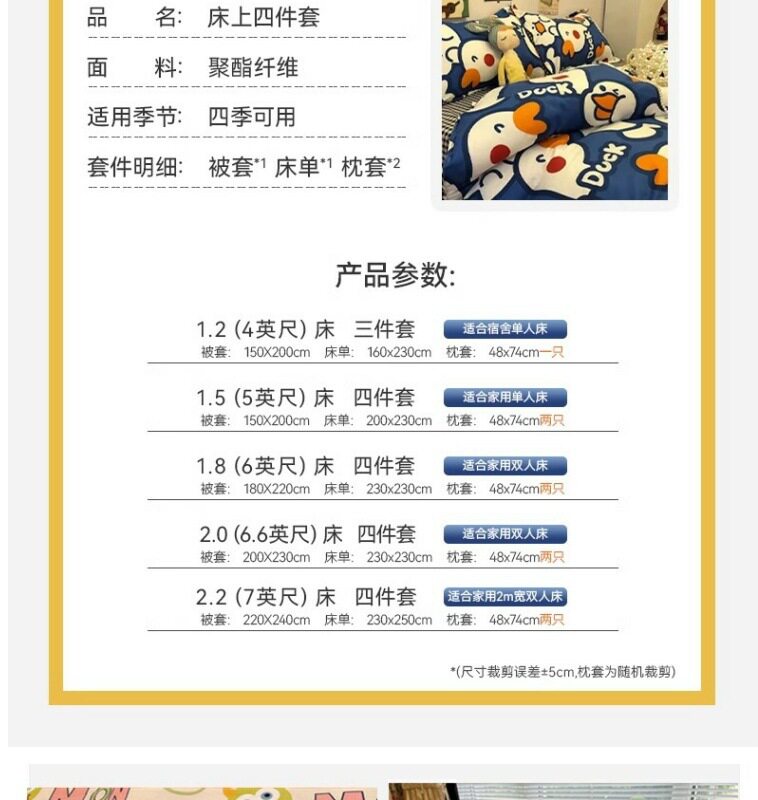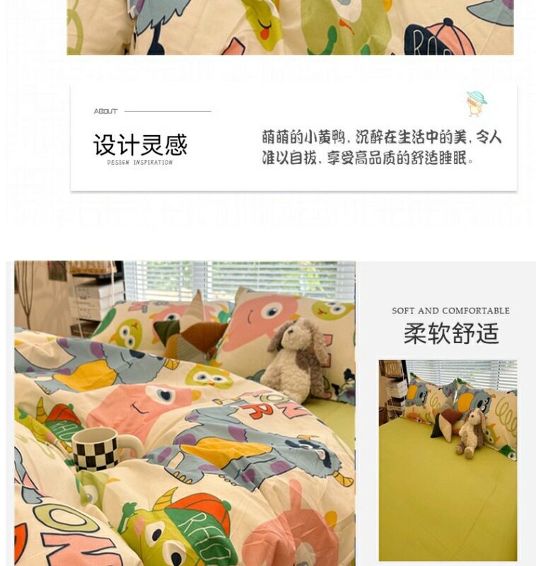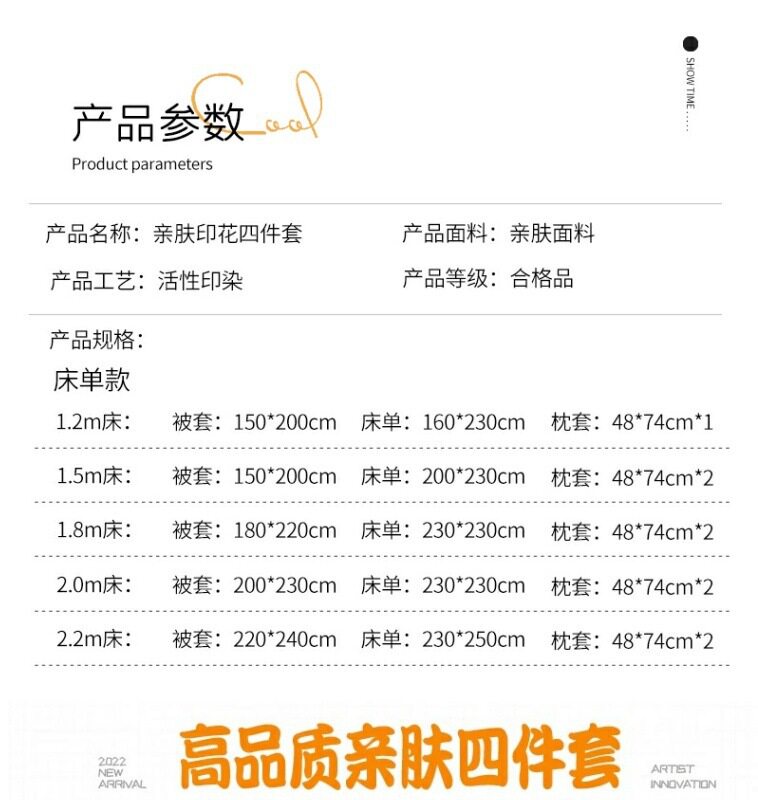 | Size specifications | 1.2 three-piece set (quilt cover 150x200),1.5 four-piece set (quilt cover 150x200),1.8 four-piece set (quilt cover 180x220),2.0 four-piece set (quilt cover 200x230),2.2 four-piece set (quilt cover 220x240),Kindergarten three-piece set (quilt cover 110x150) |