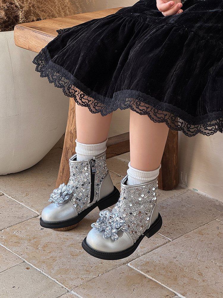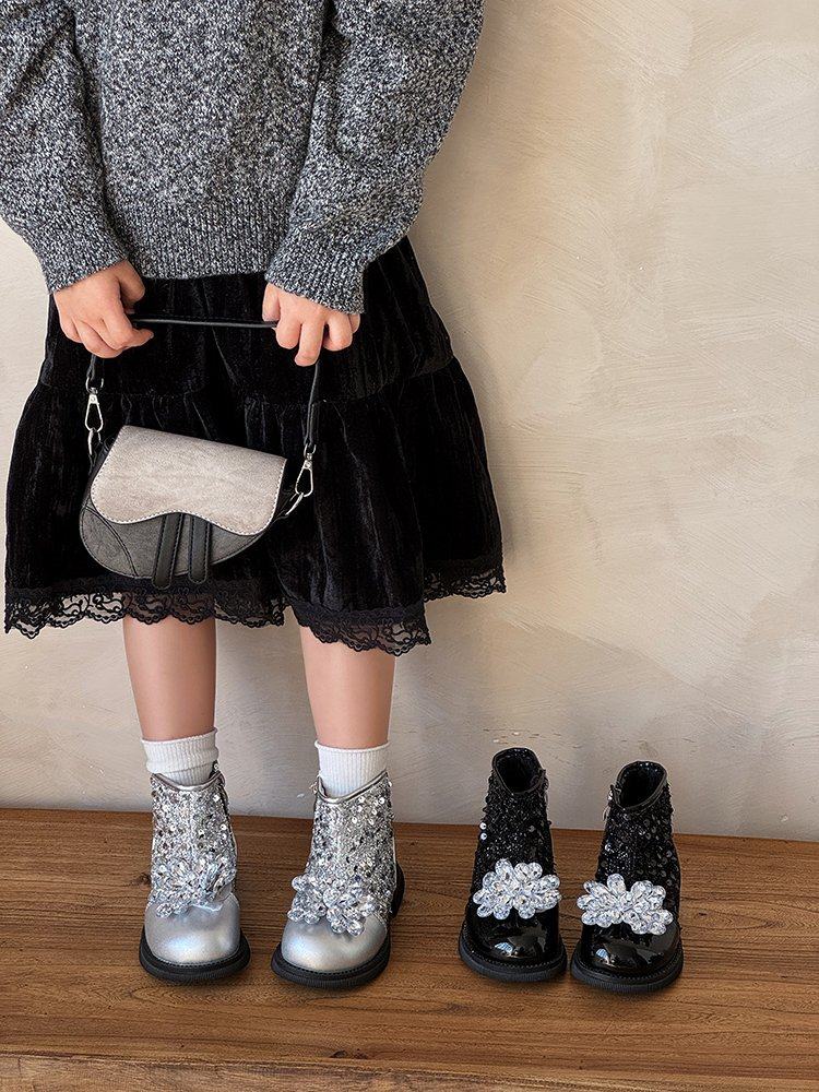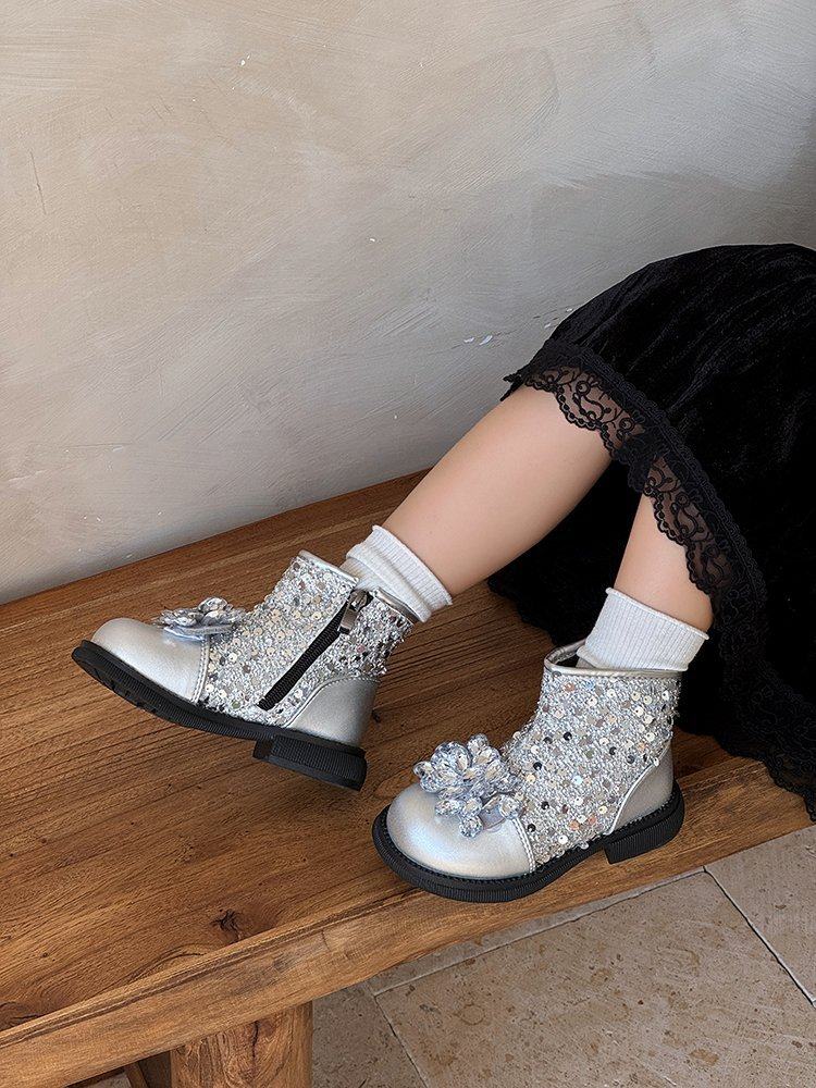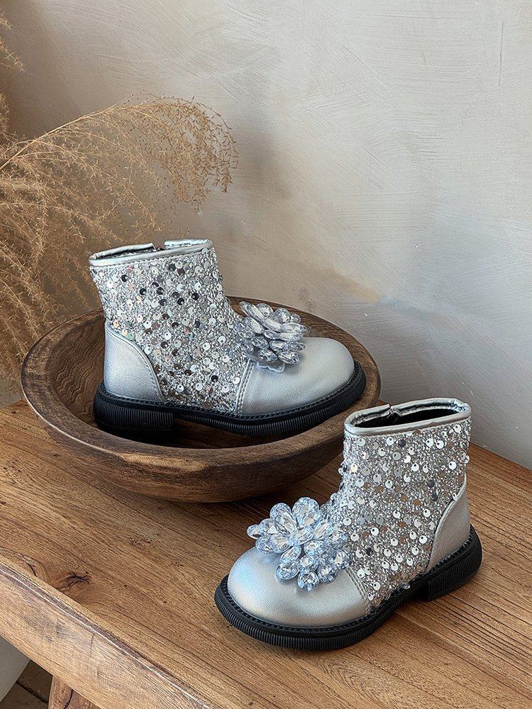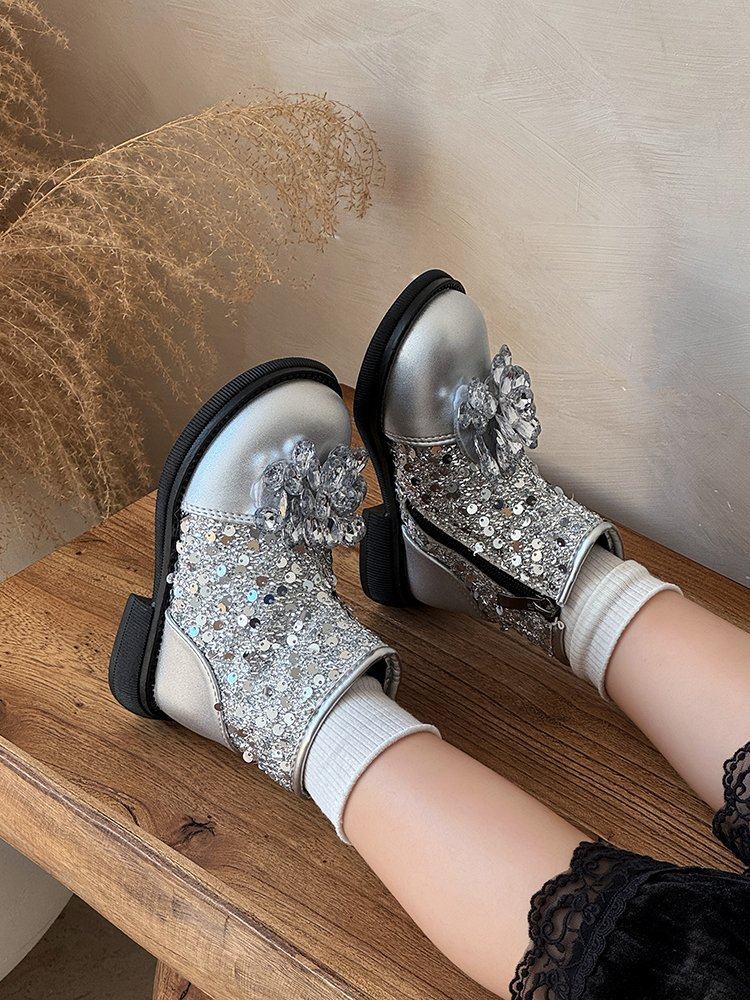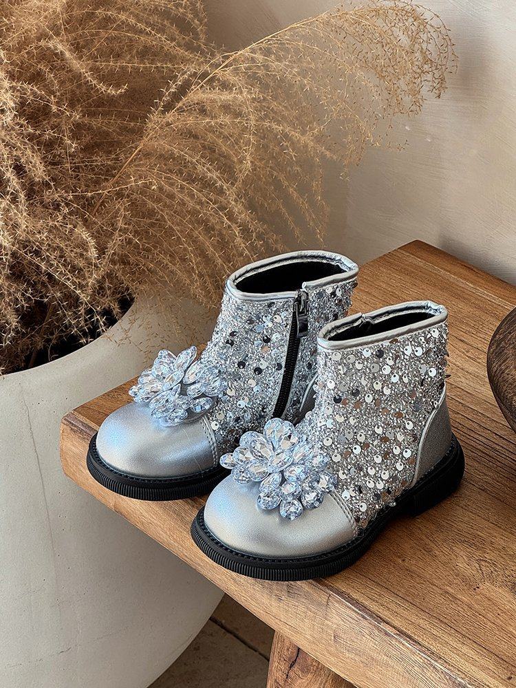 Girls Princess Short Boots Autumn and Winter Children's Boots Sequined Crystal Princess Shoes Silver Style Little Girls Martin Boots